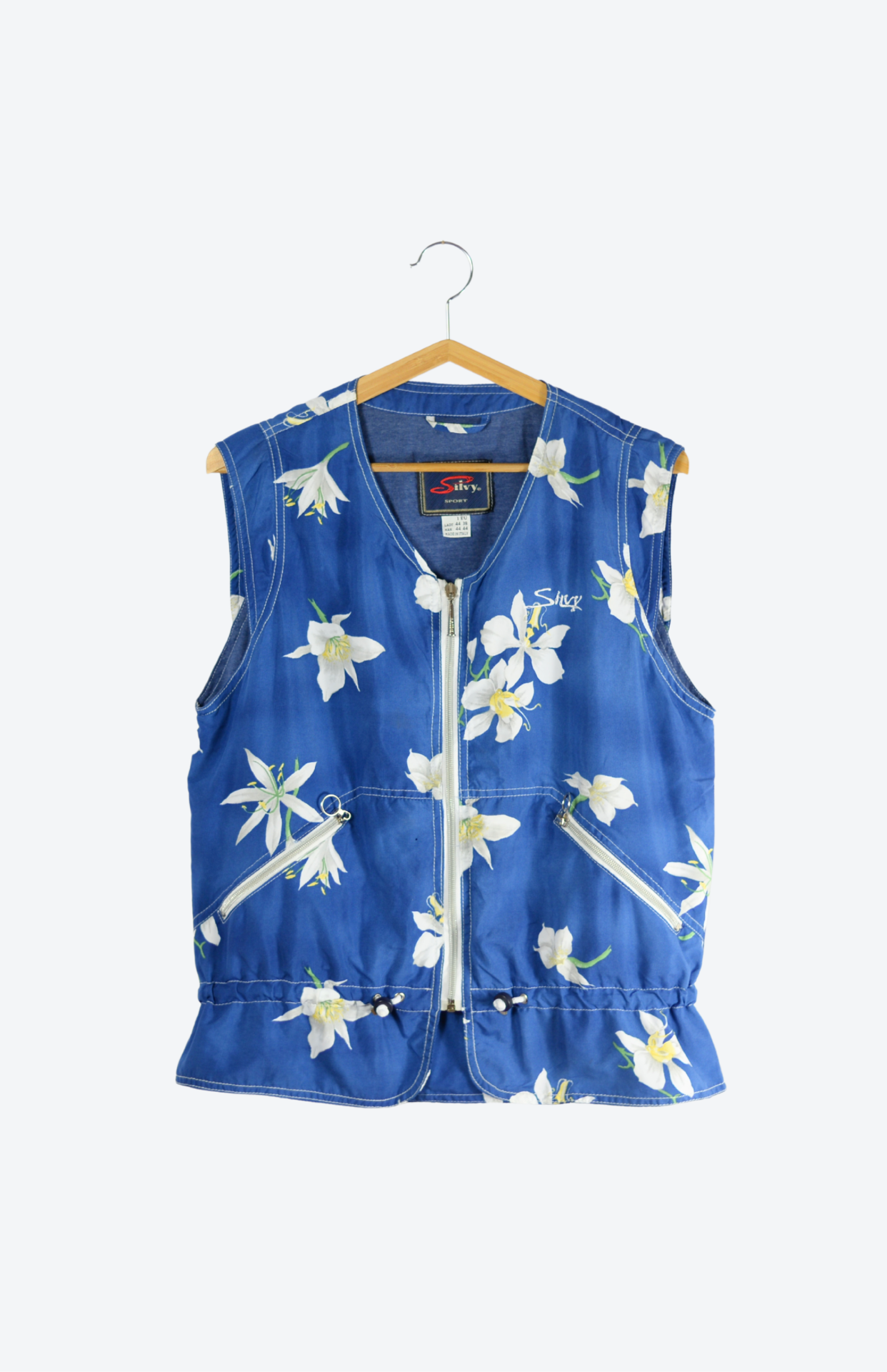 Originální funky vesta s květinami. Sportovní styl, utažení v pase a zapínání na zip na středu. Pěkně zpracovaná.