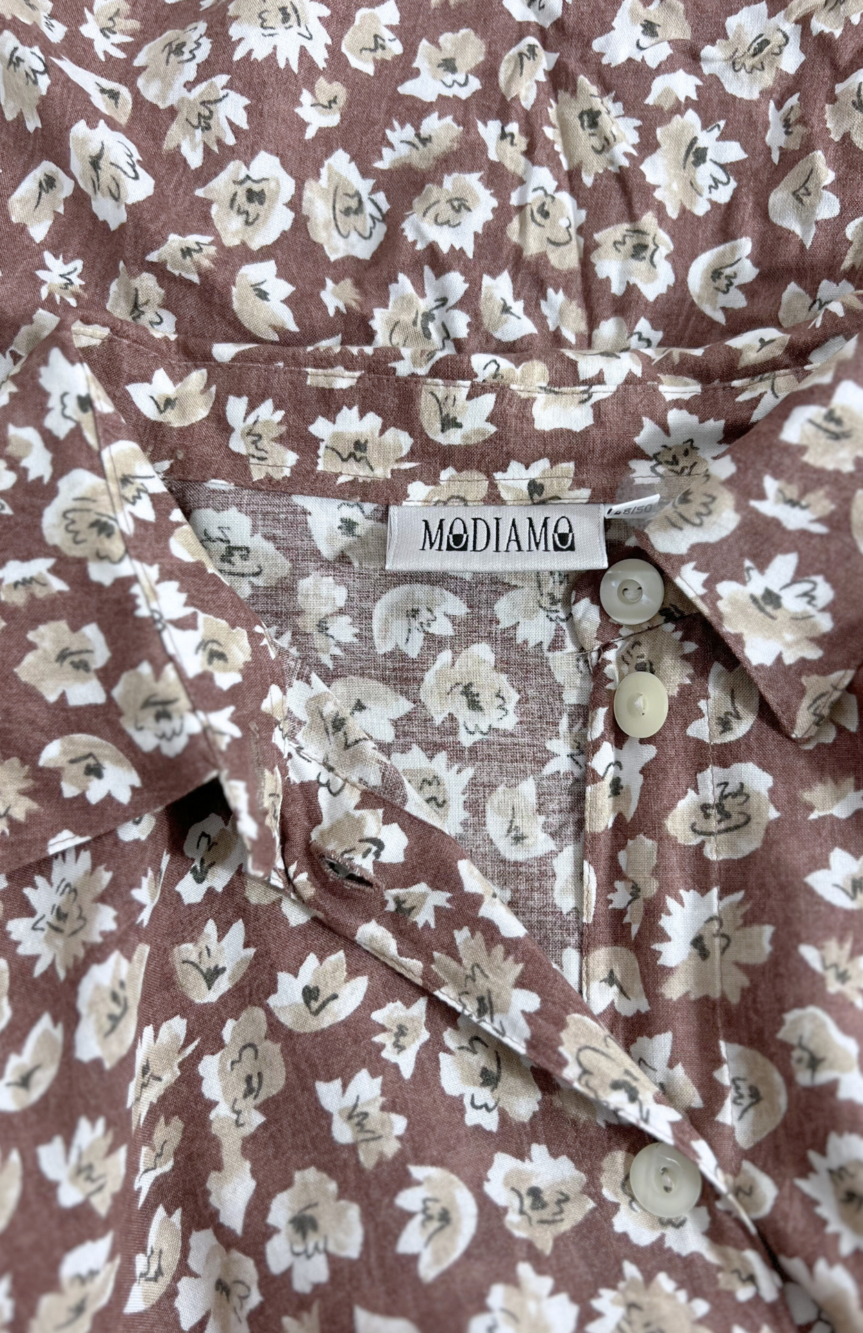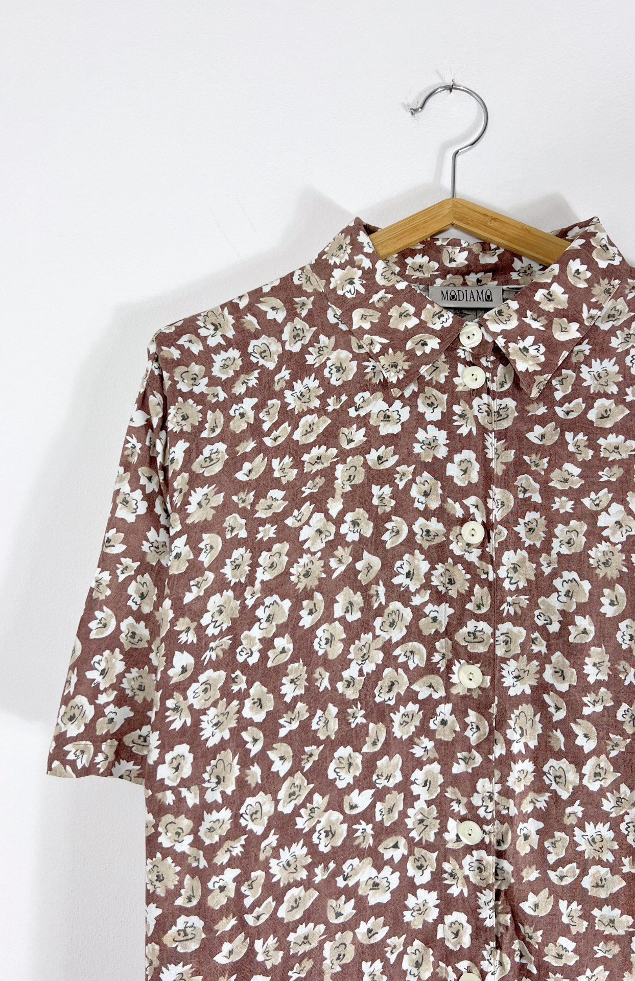 Květinový vintage košilový top. Má delší střih a propínání na krémové knoflíčky. Uvnitř tílková vrstva. Unisex kousek.