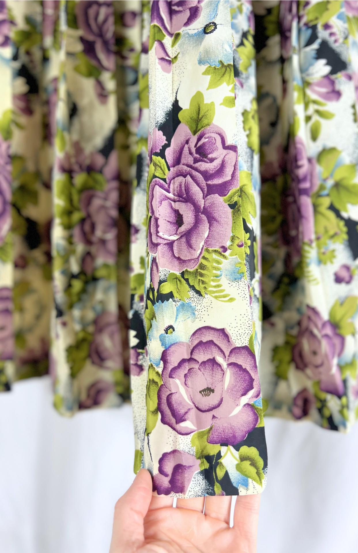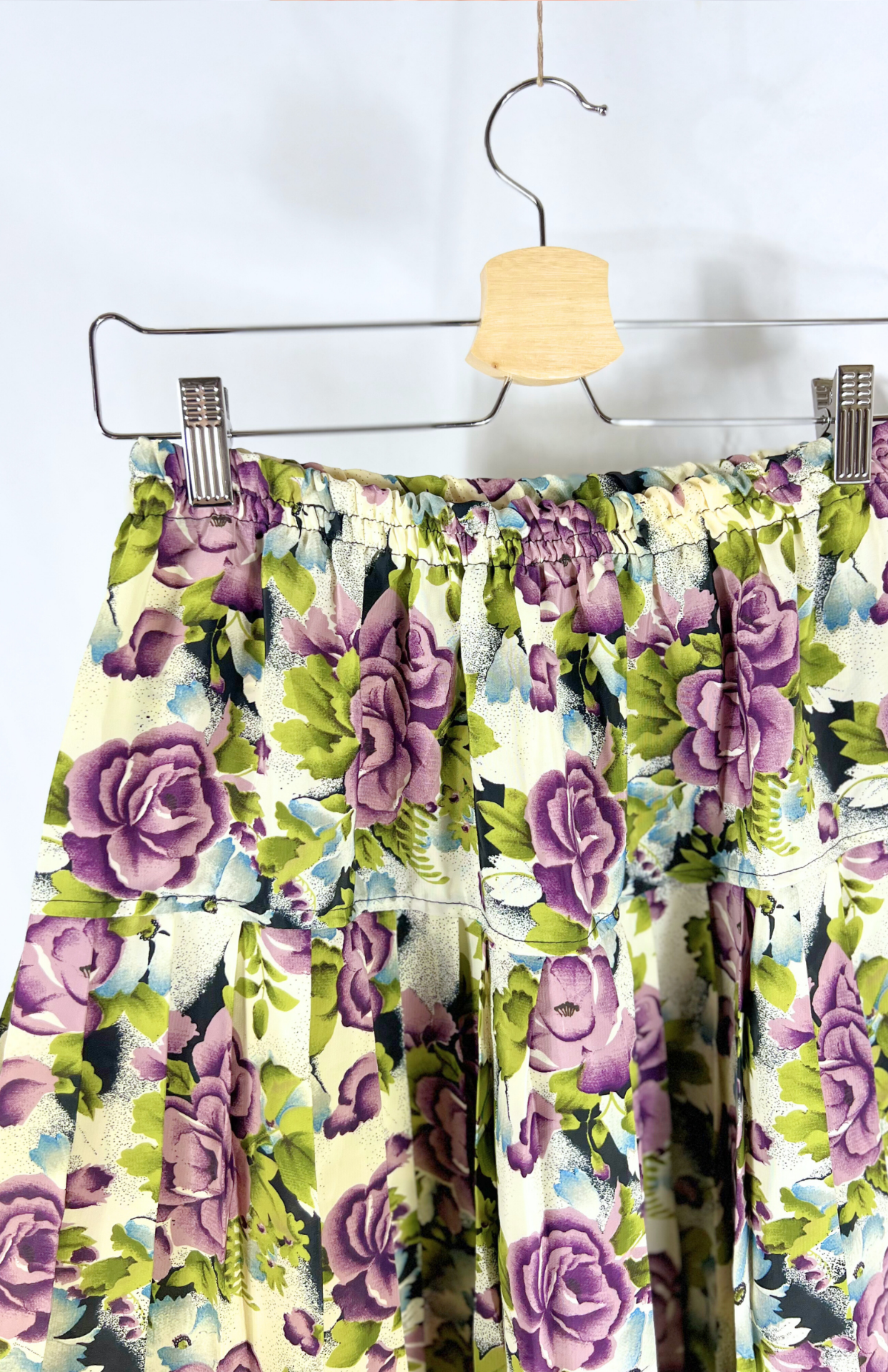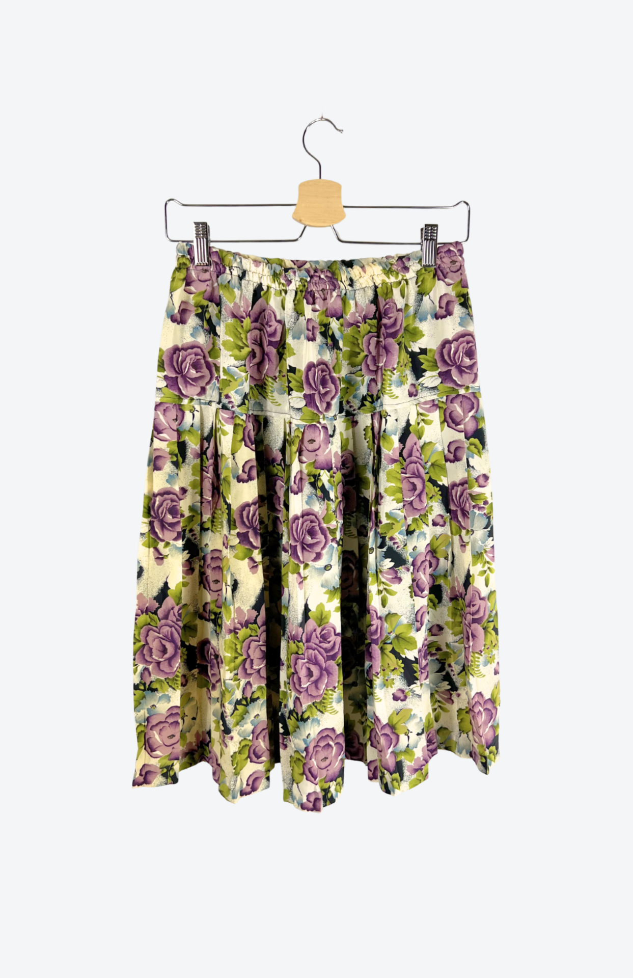 Originální 80´s sukně s květinovým vzorem. Má pružný pas, plisování pod boky a nemačkavý materiál.