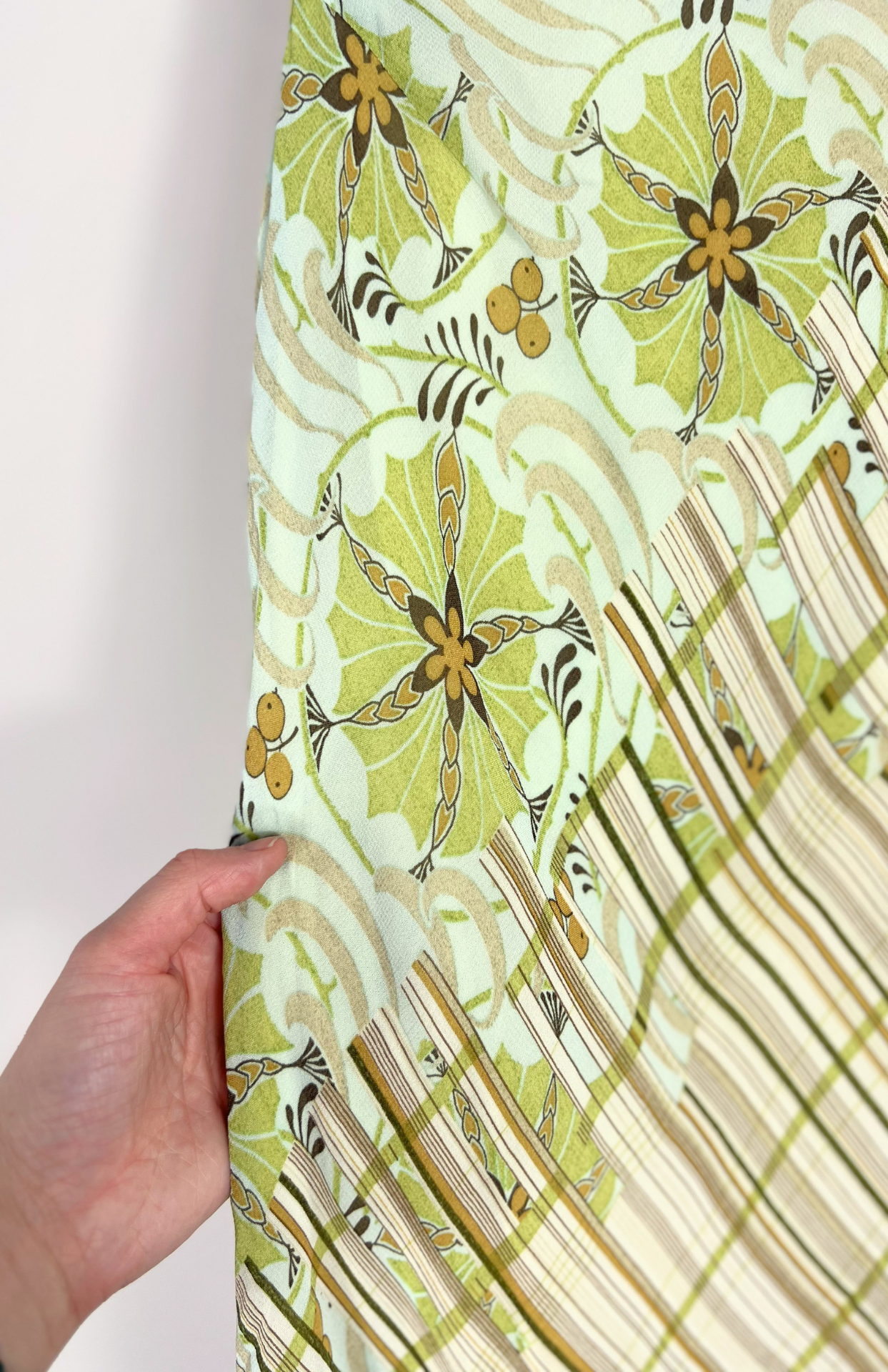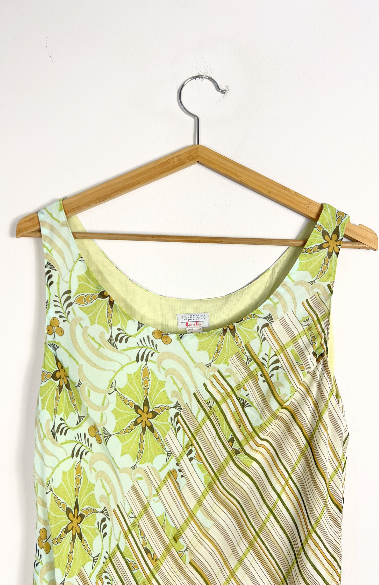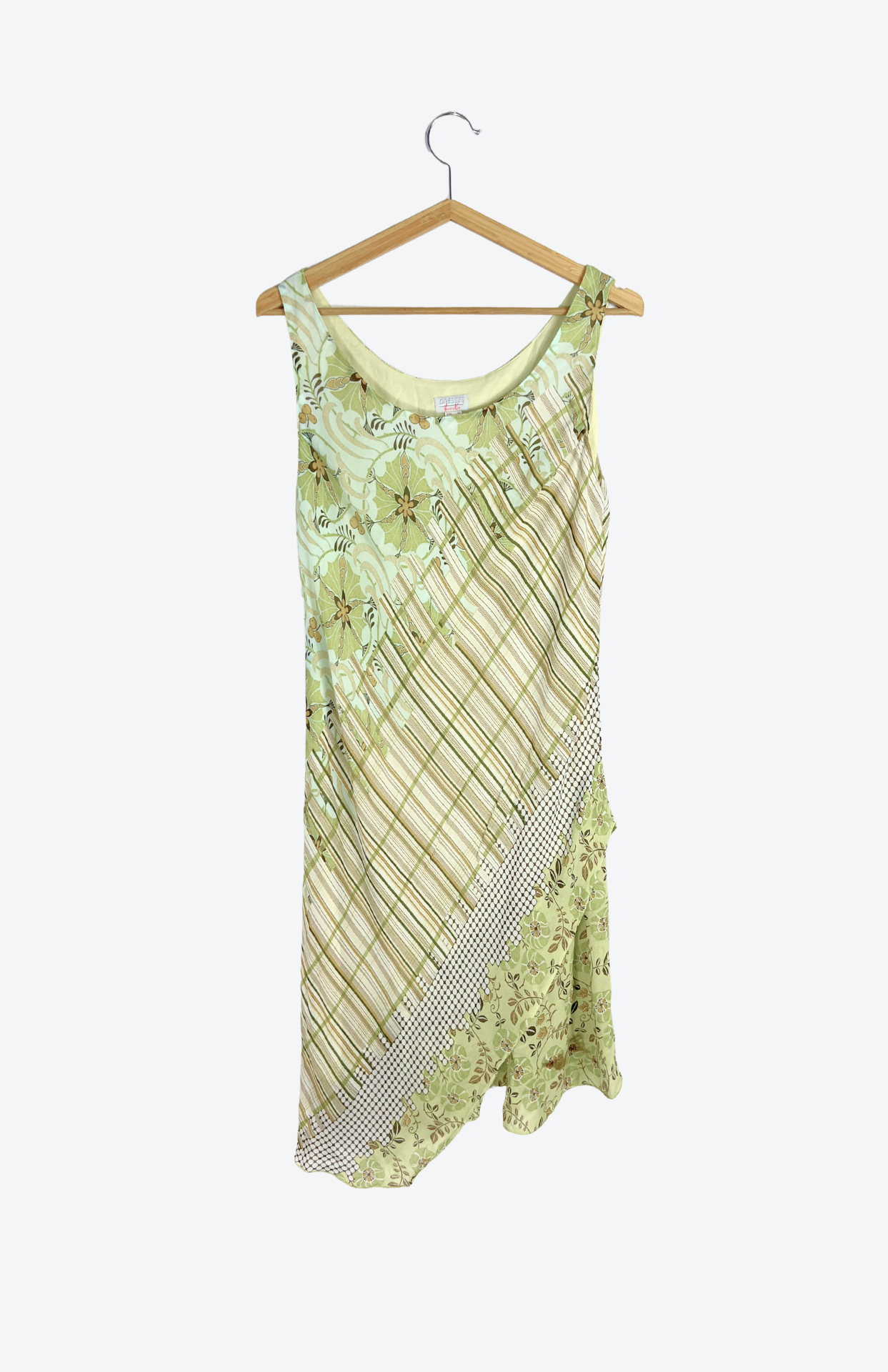 Květinové fairy zelené šaty. Mají asymetrický střih a vzor s proužky a květy. Trochu éterické, budou pěkné i k vrstvení.