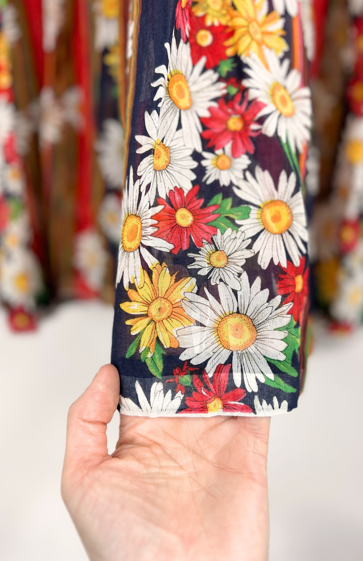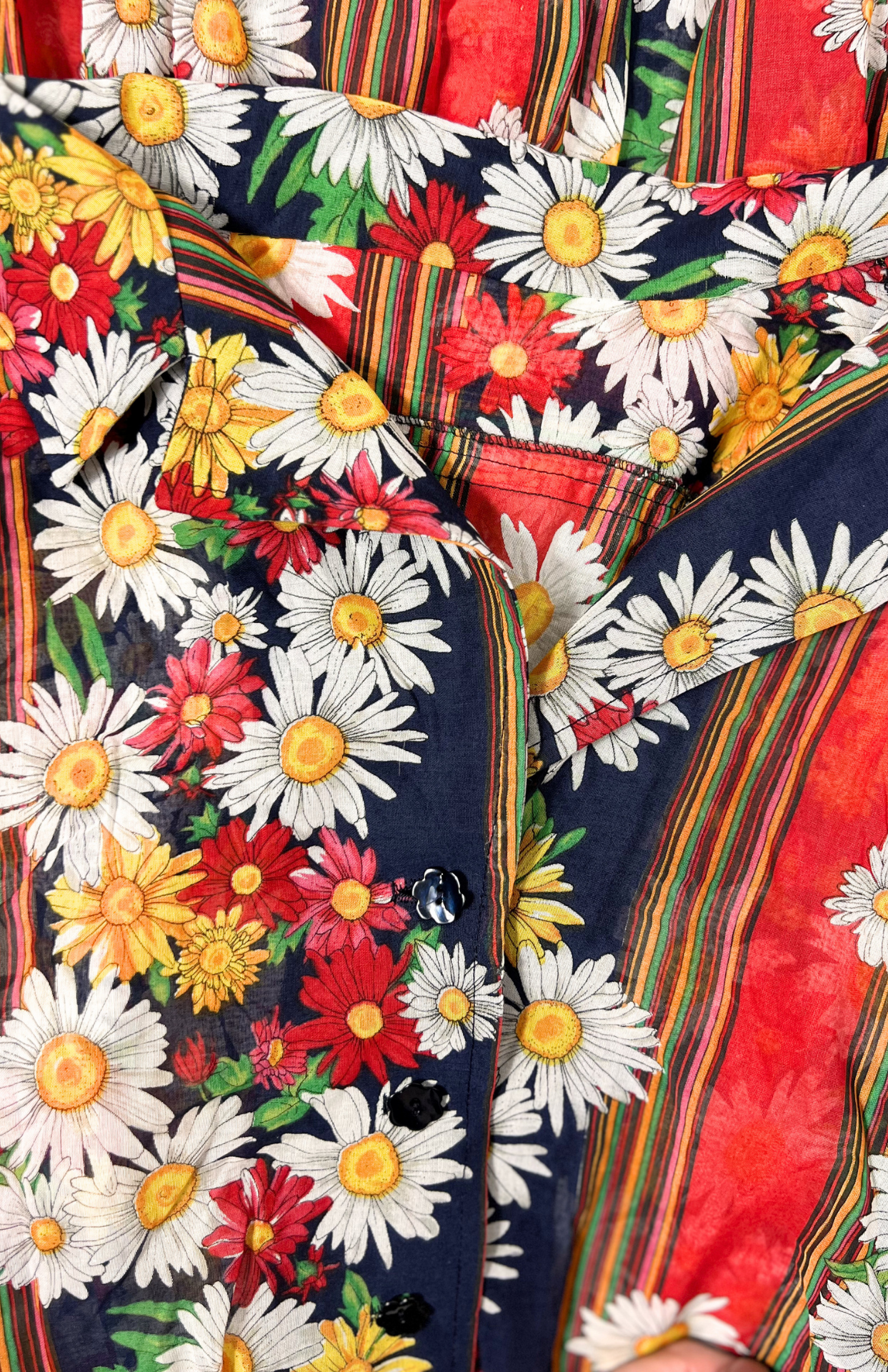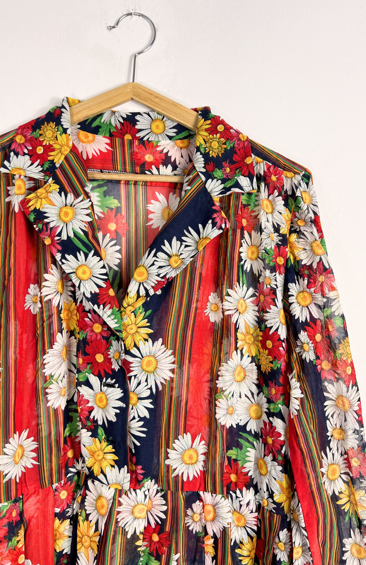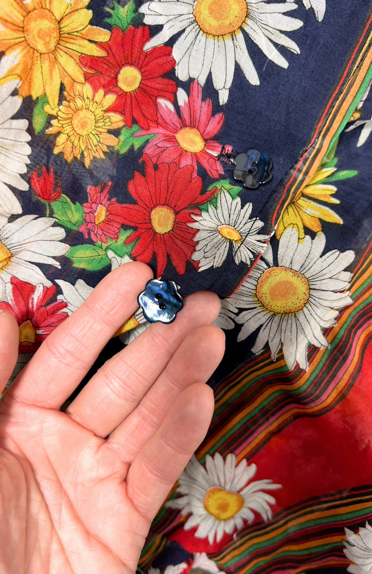 Květinové košilové retro šaty. Látka je lehce polotransparentní. Uprostřed propínací na modré květinové knoflíčky.
