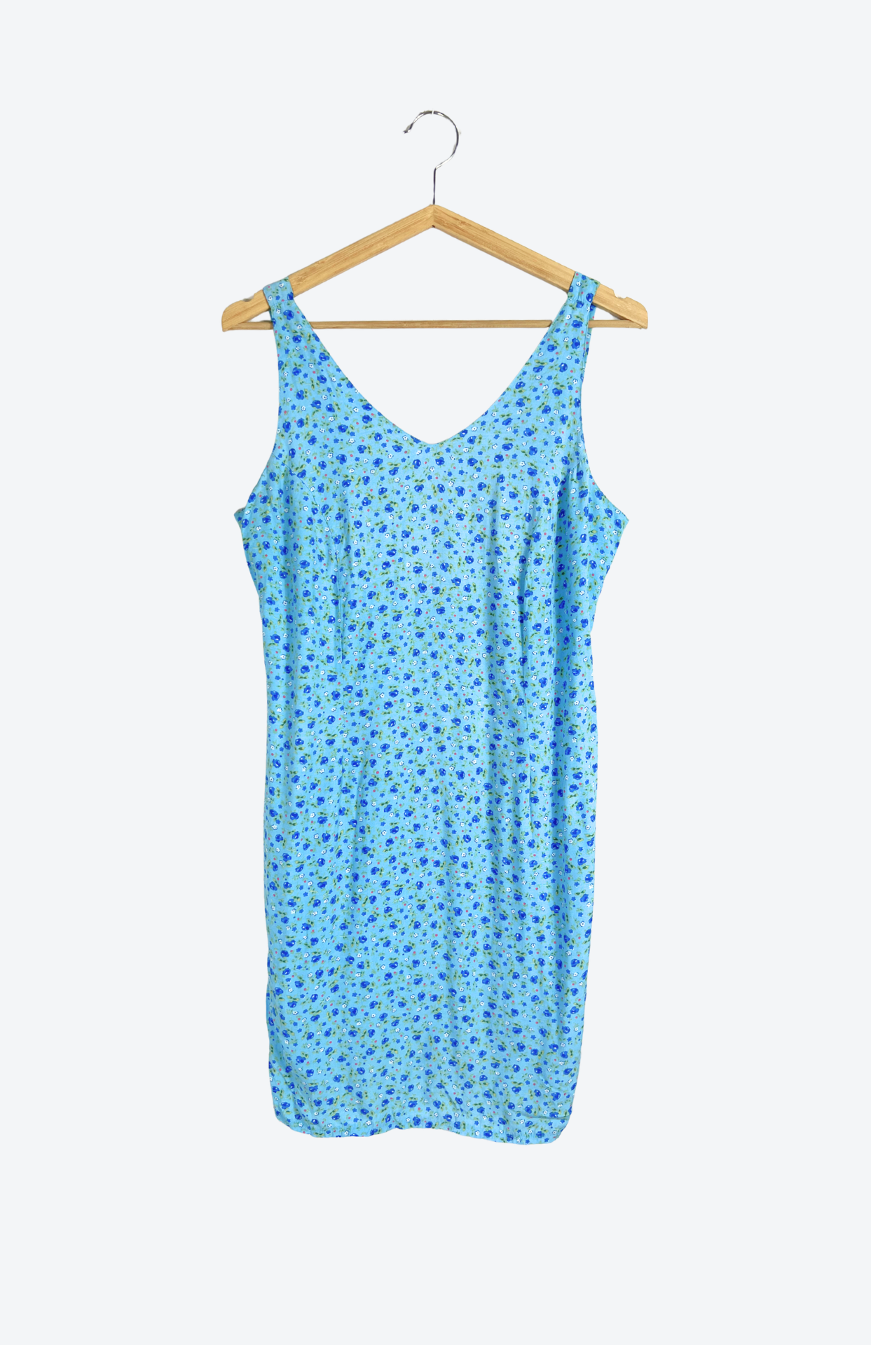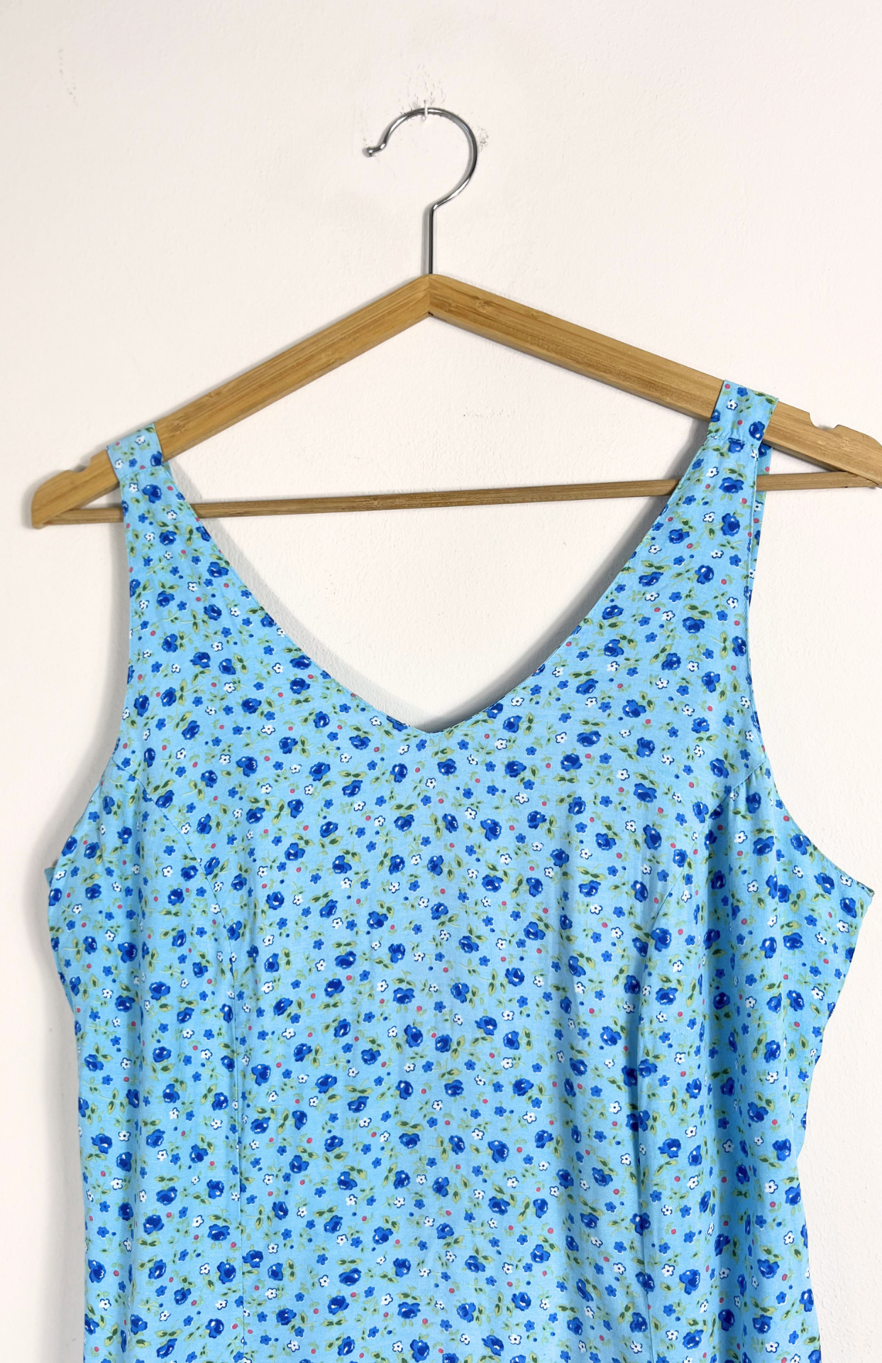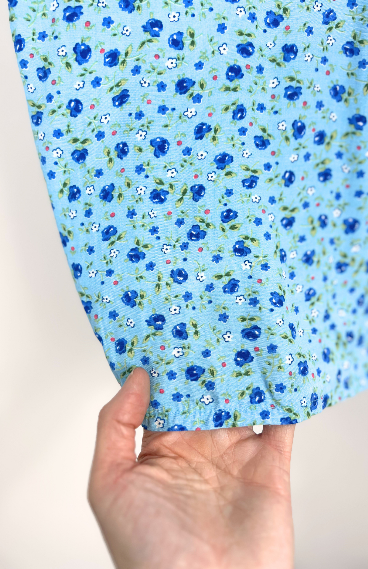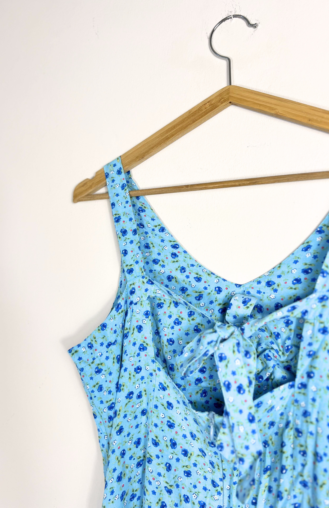Květinové nebesky modré retro šaty. Mají pěkně vykrojená ramínka s vázáním vzadu na mašli. Drobný květinový vzor.