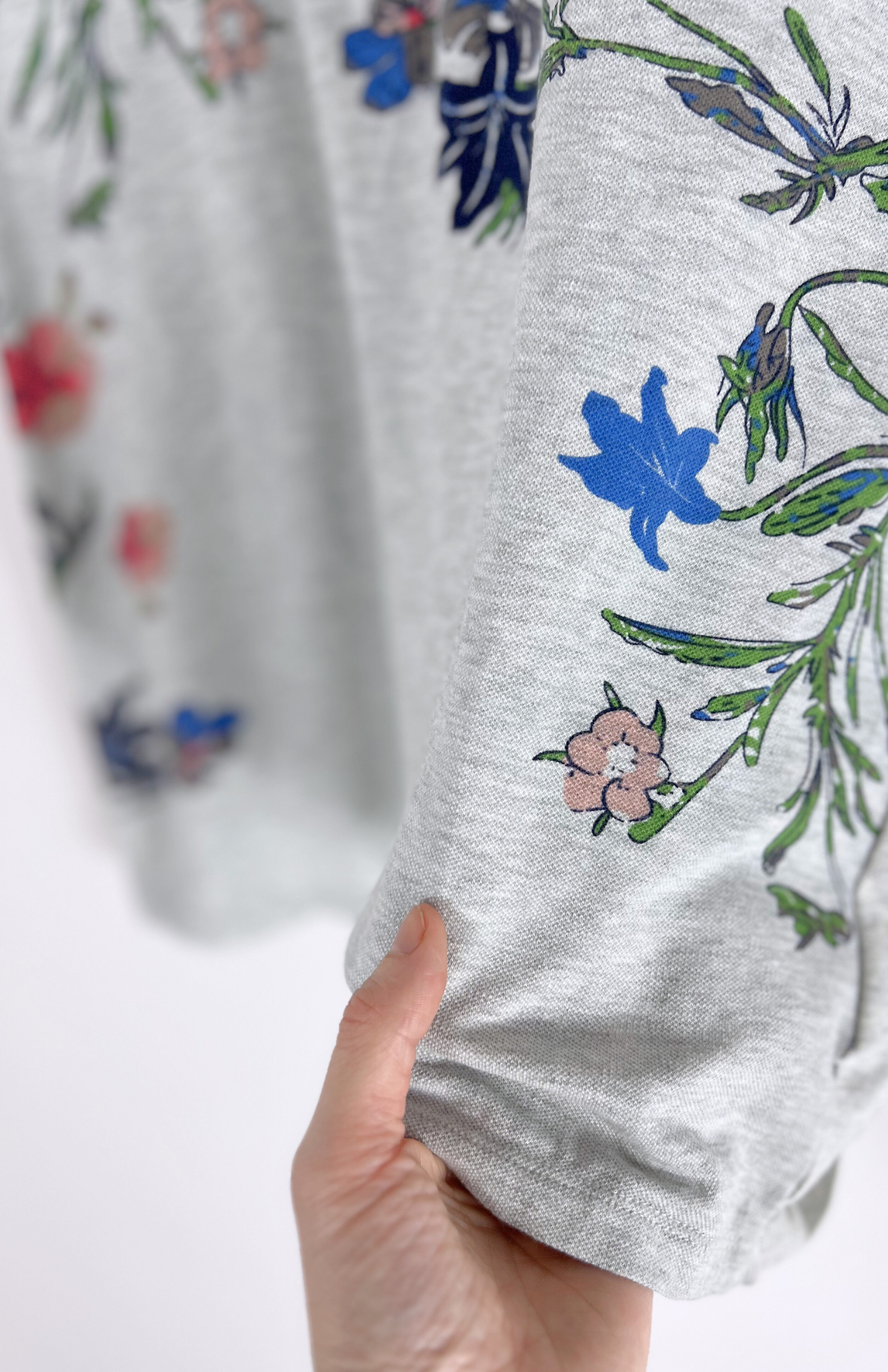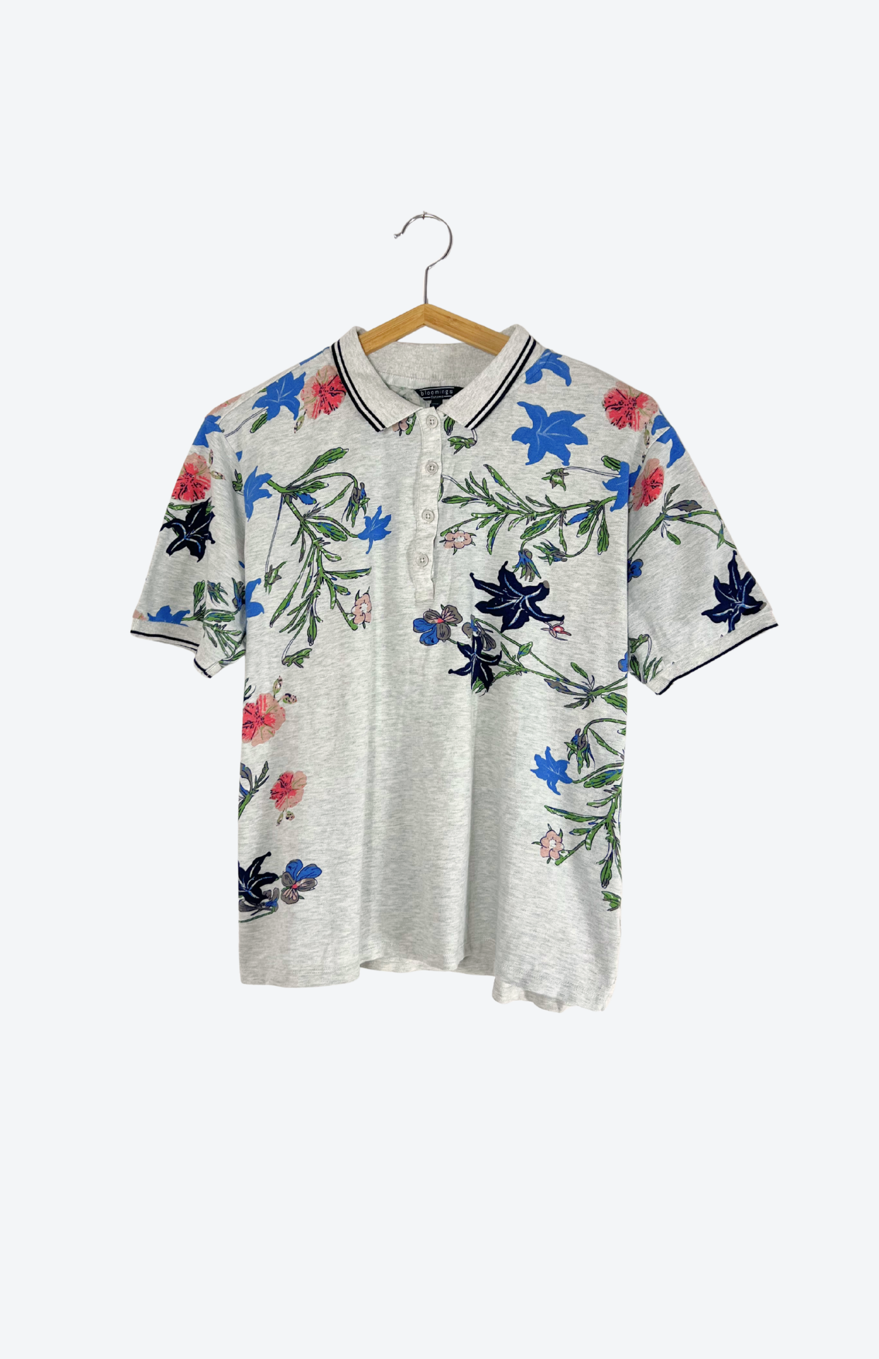 Květinový top ve střihu polo. Má límeček a knoflíky pod ním. Pěkný vzor s potiskem barevných květin.