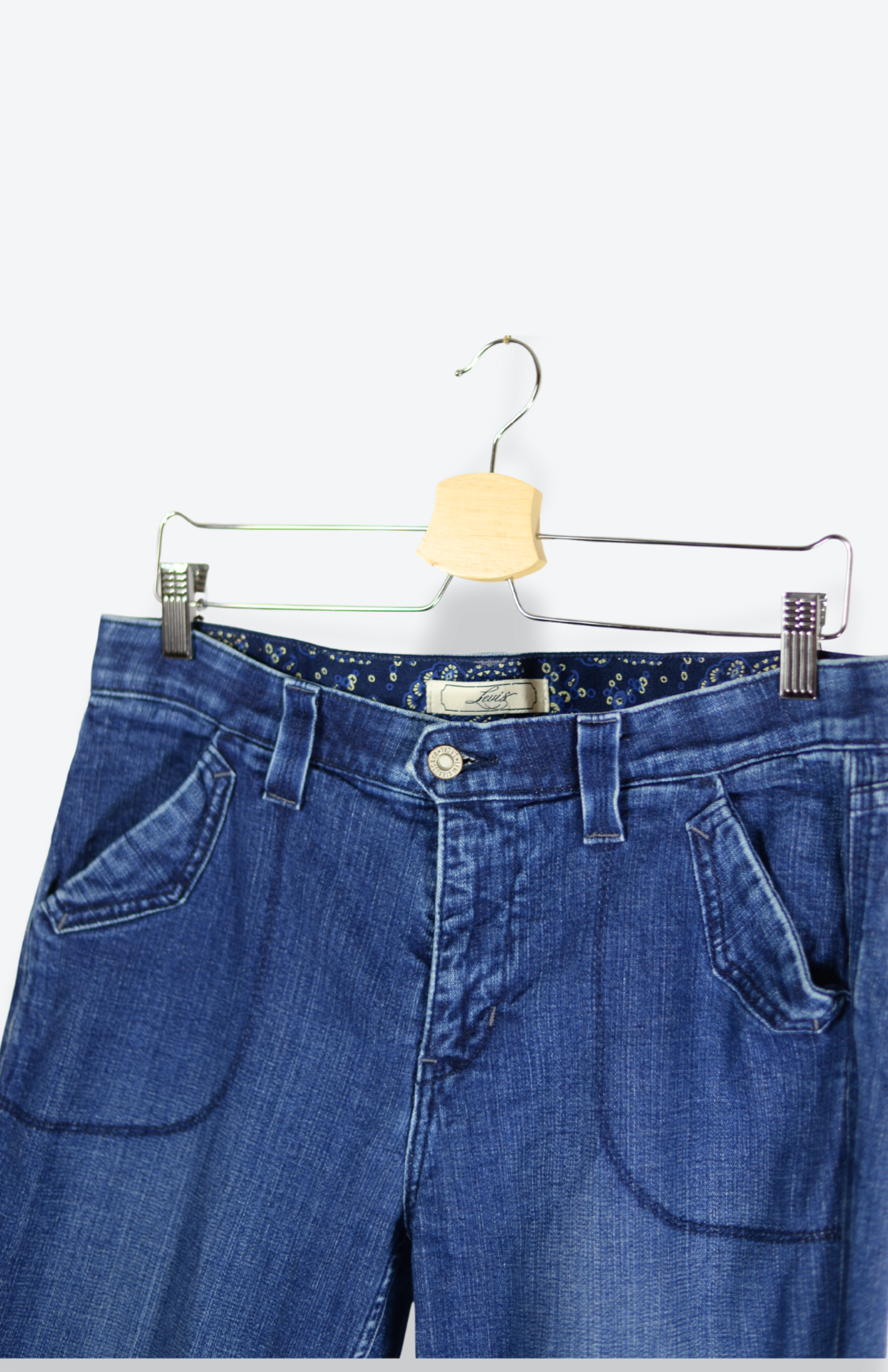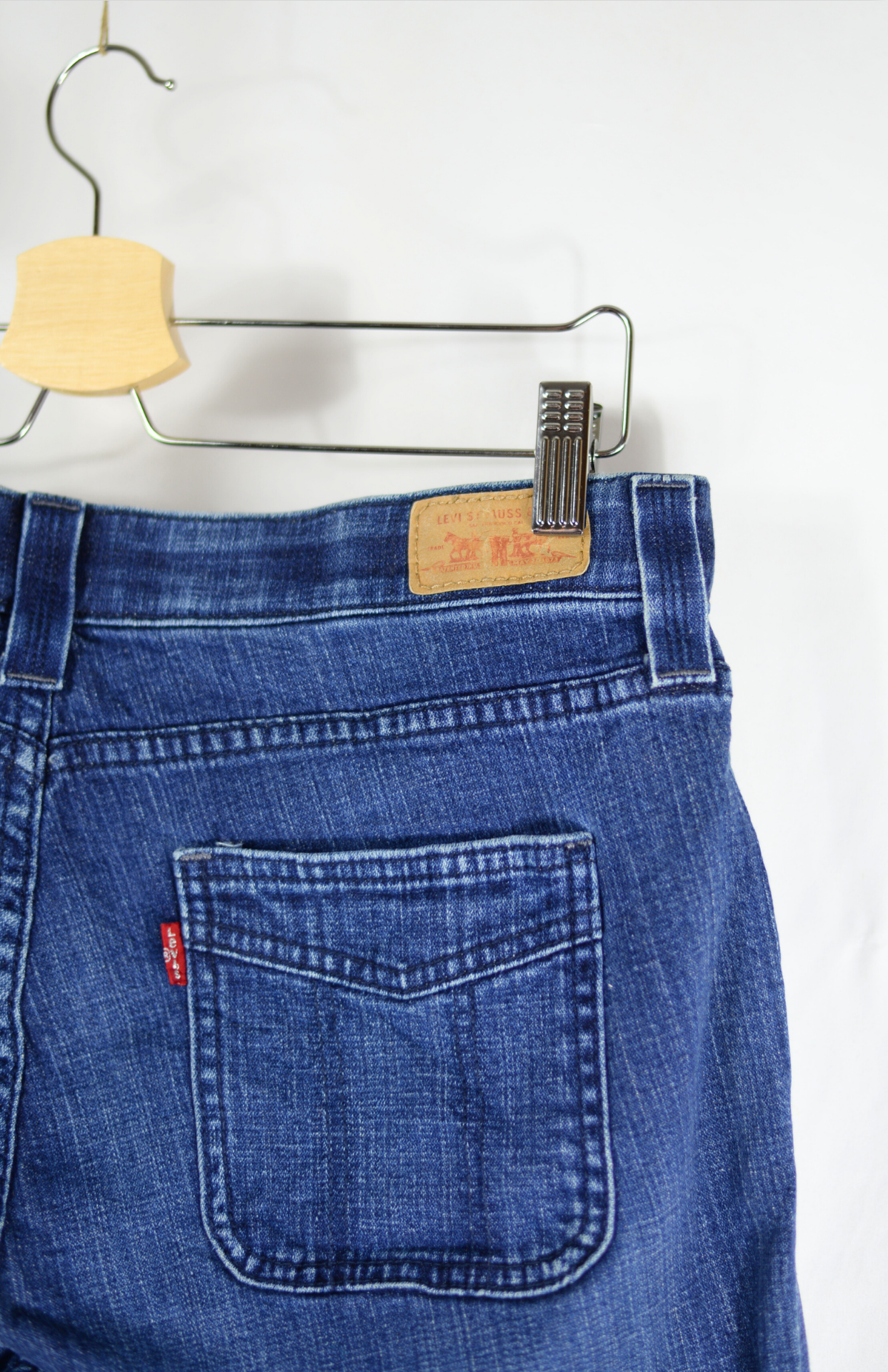 Retro Levi's džíny. Model capri, mají střední pas, kapsy vpředu i vzadu a volné nohavice. Denim je silnější a jemně pruží. Vzadu klasický červený label a malý kožený patch se zachovalou patinou.