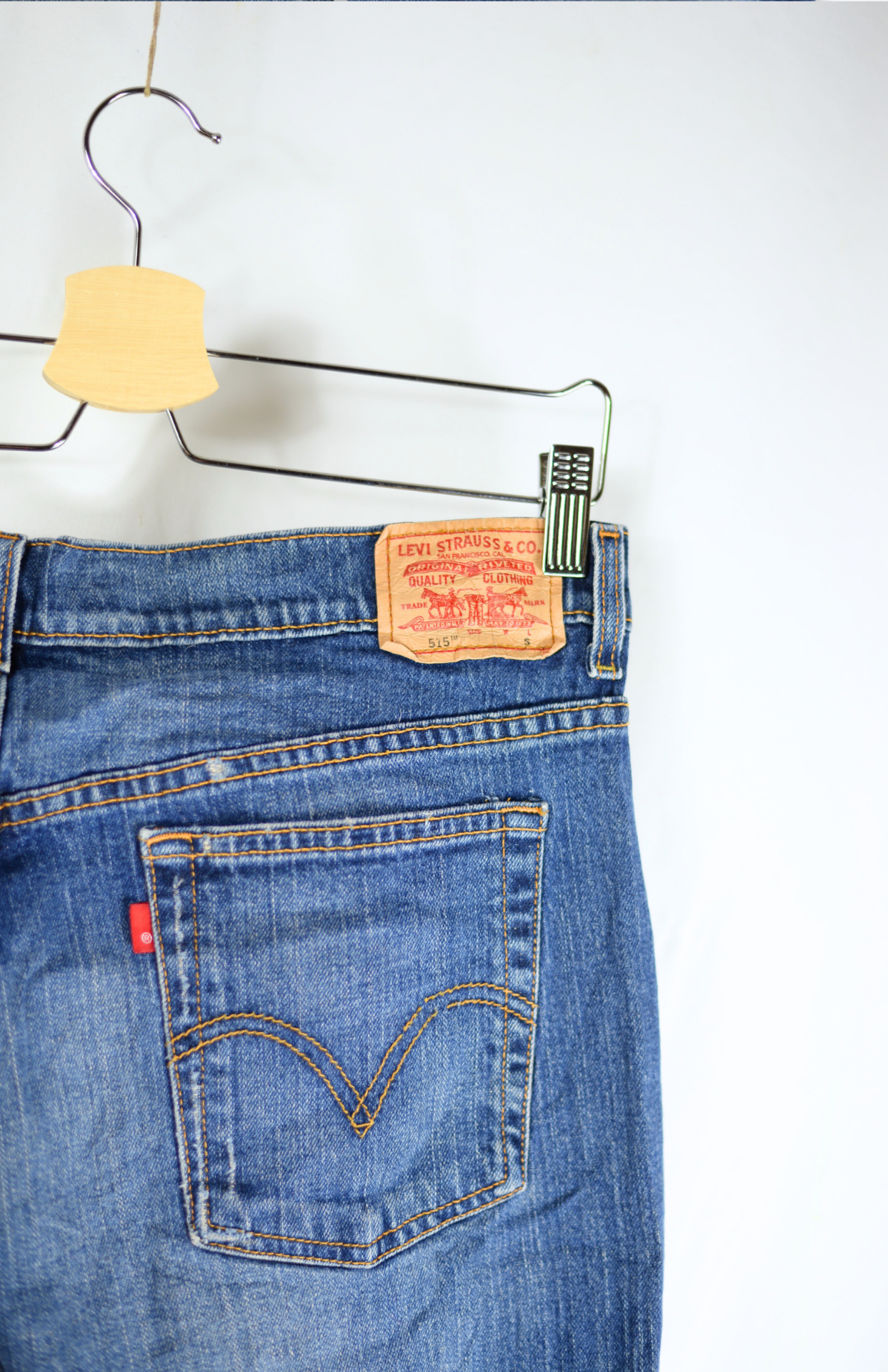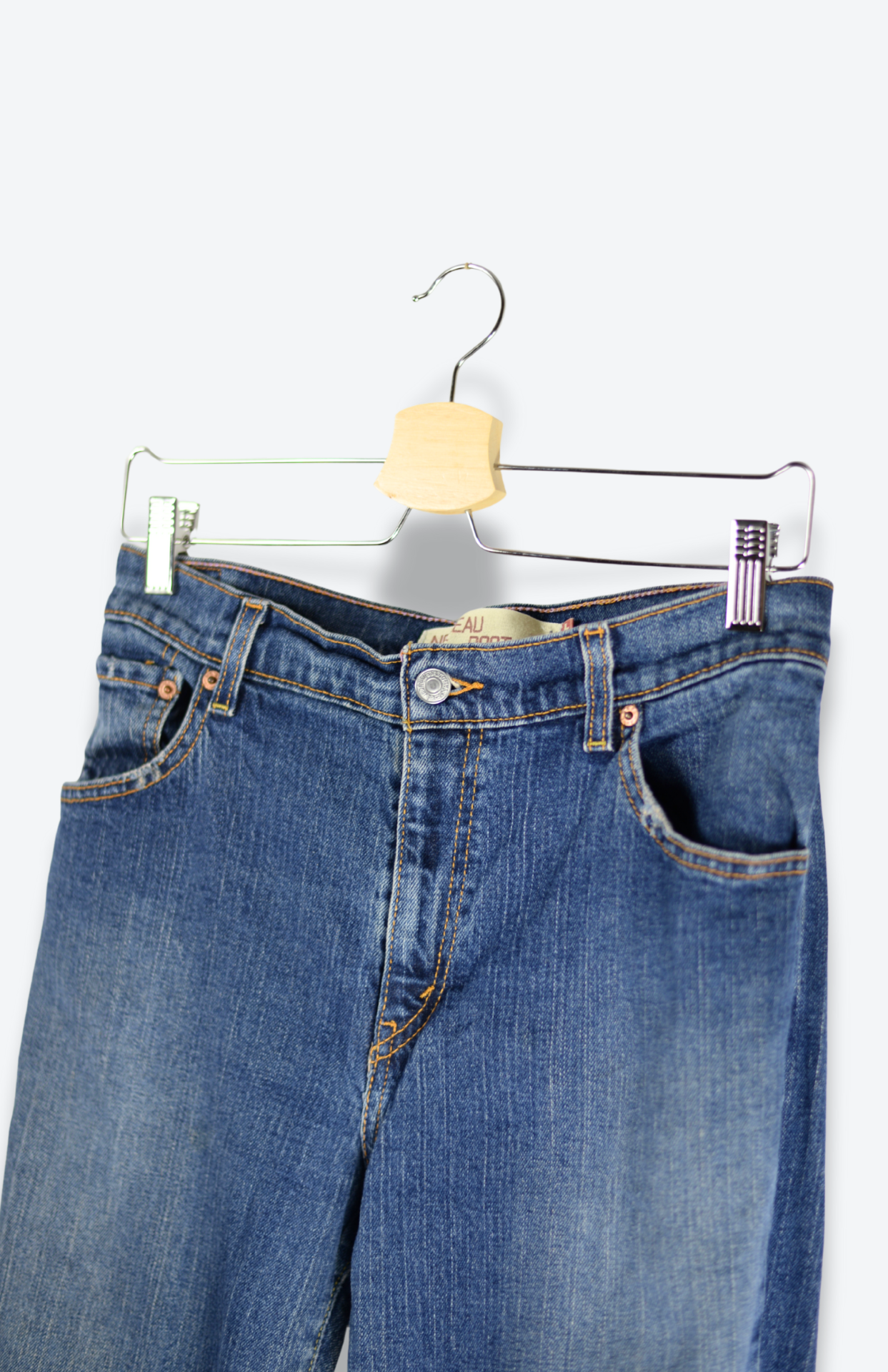 Retro Levi's džíny. Model 315, mají střední pas, kapsy vpředu i vzadu a volné nohavice se střapci na koncích. Denim je silnější a nepatrně pruží. Vzadu klasický červený label a kožený patch se zachovalou patinou.