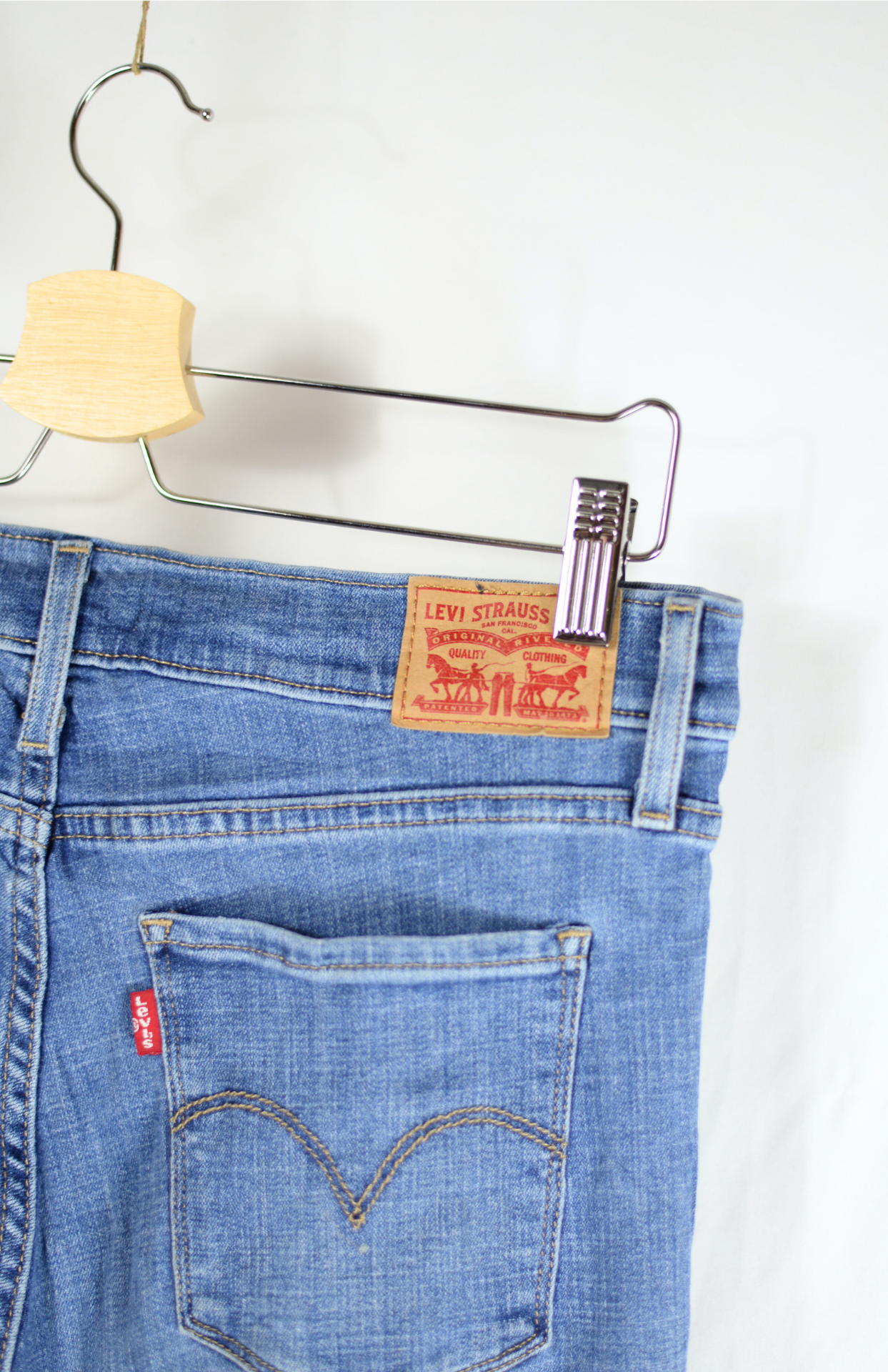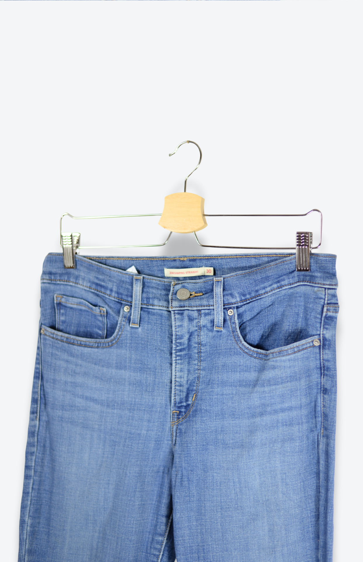 Retro Levi's džíny. Model 314, mají střední pas, kapsy vpředu i vzadu a klasické - lehce volné nohavice. Denim je měkký, středně silný a jemně pruží. Vzadu klasický červený label a kožený patch se zachovalou patinou.