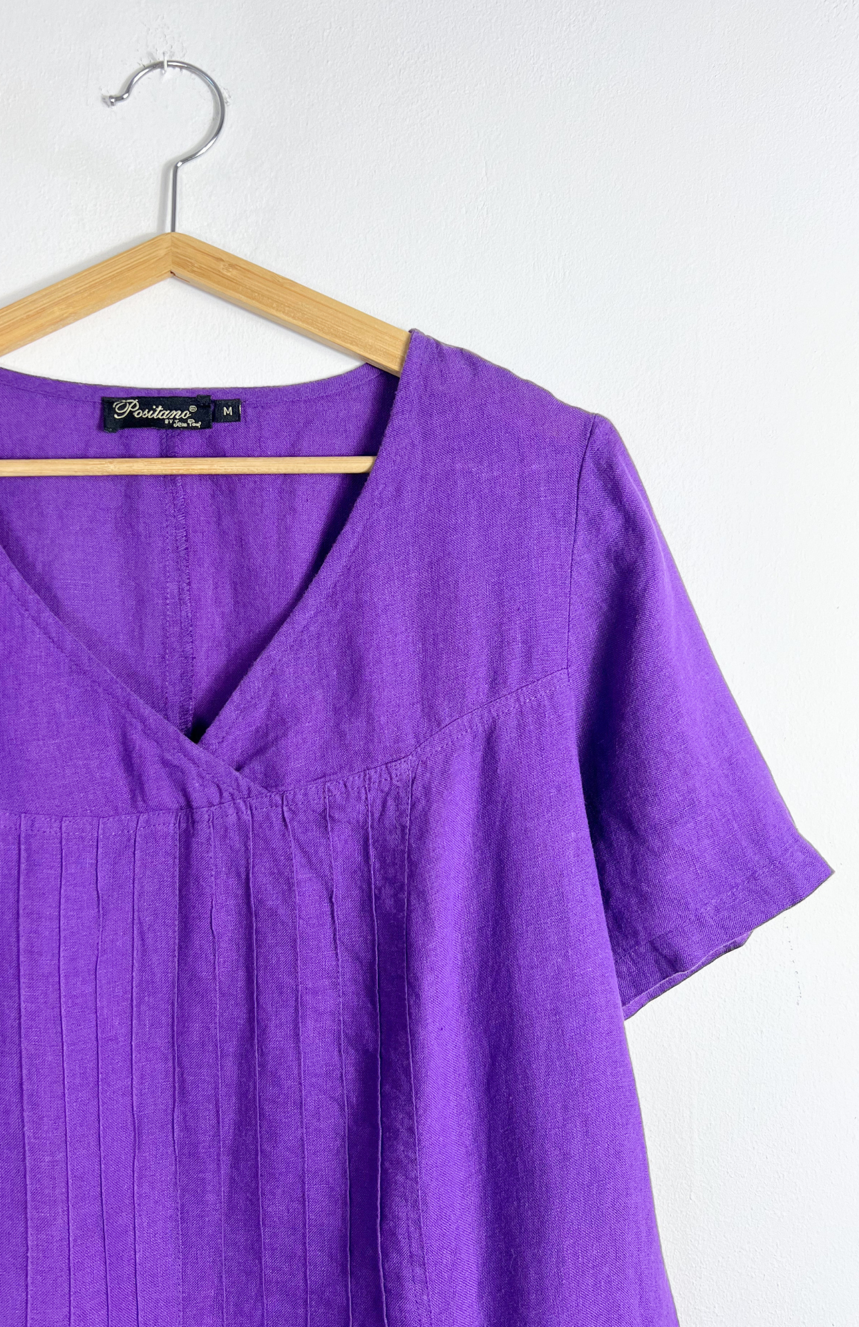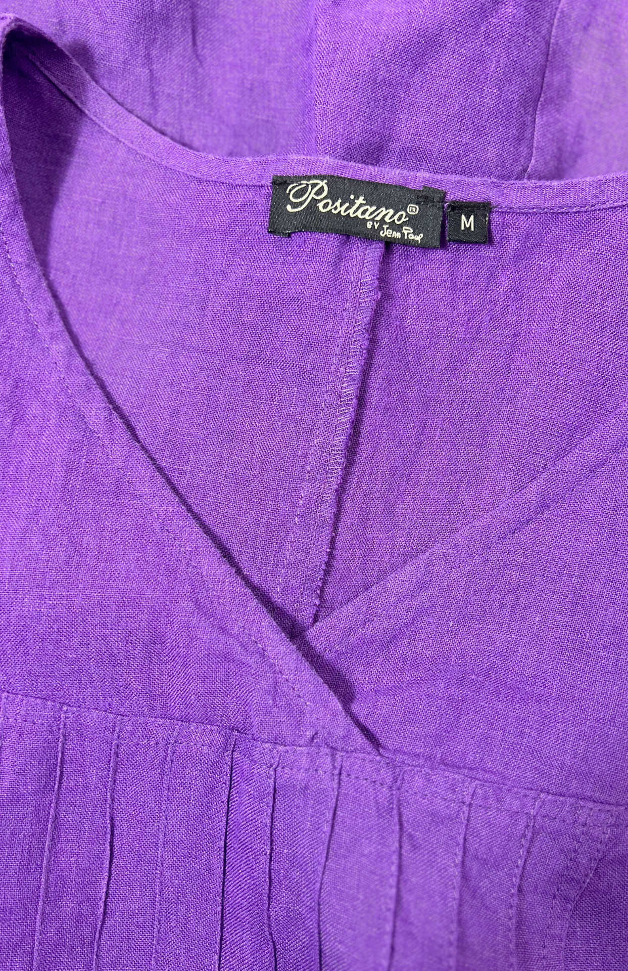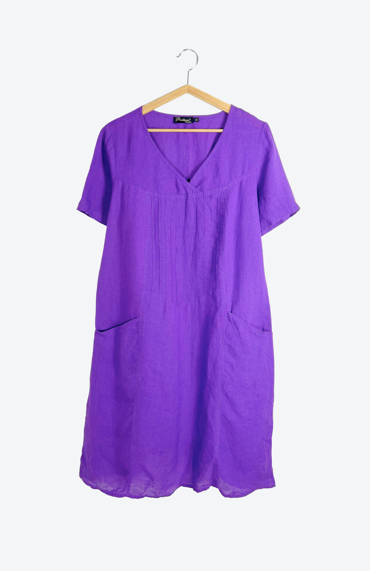 Čistě lněné fialové šaty s velkými kapsami. Mají volný střih a pěkný detail ve výstřihu.