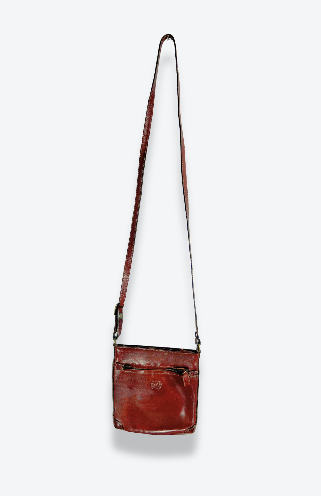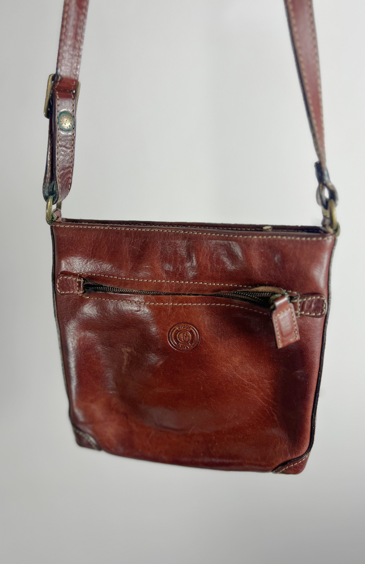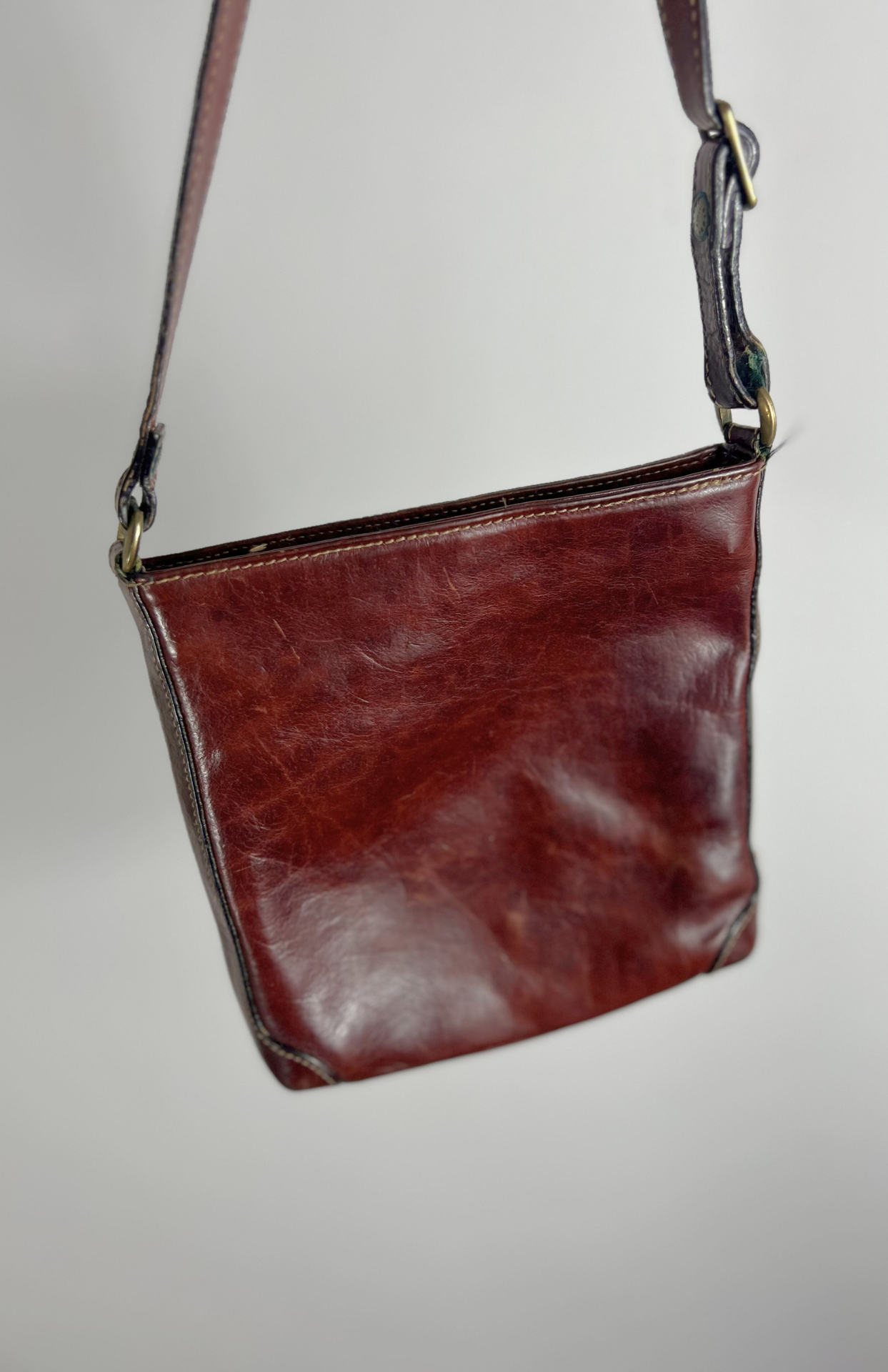 Mahagonová kožená retro kabelka. Ze silné hladké kůže v krásném odstínu rezavě hnědé. Má nastavitelný popruh a kapsy na zip.