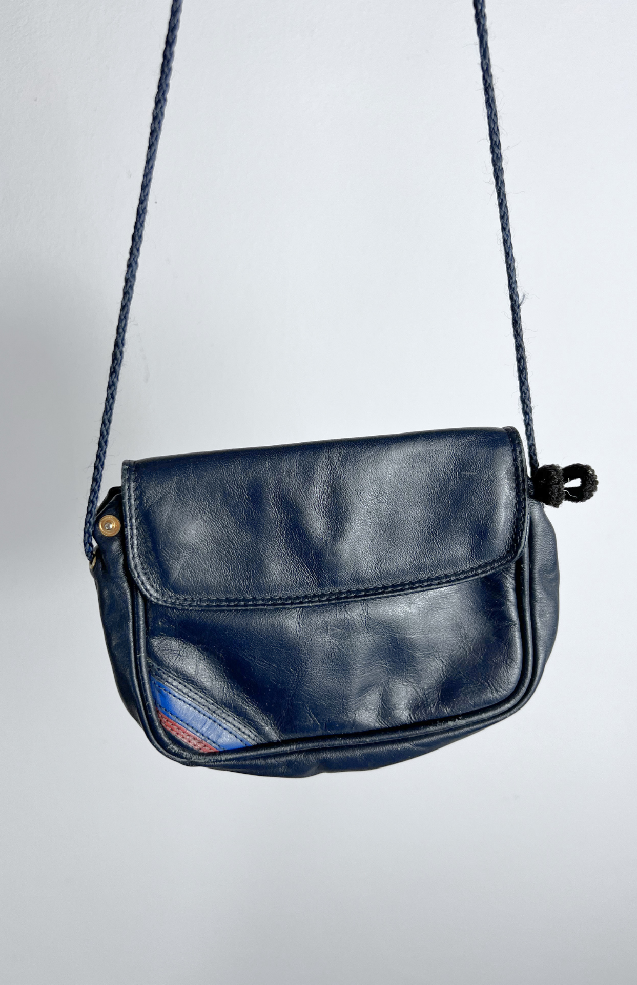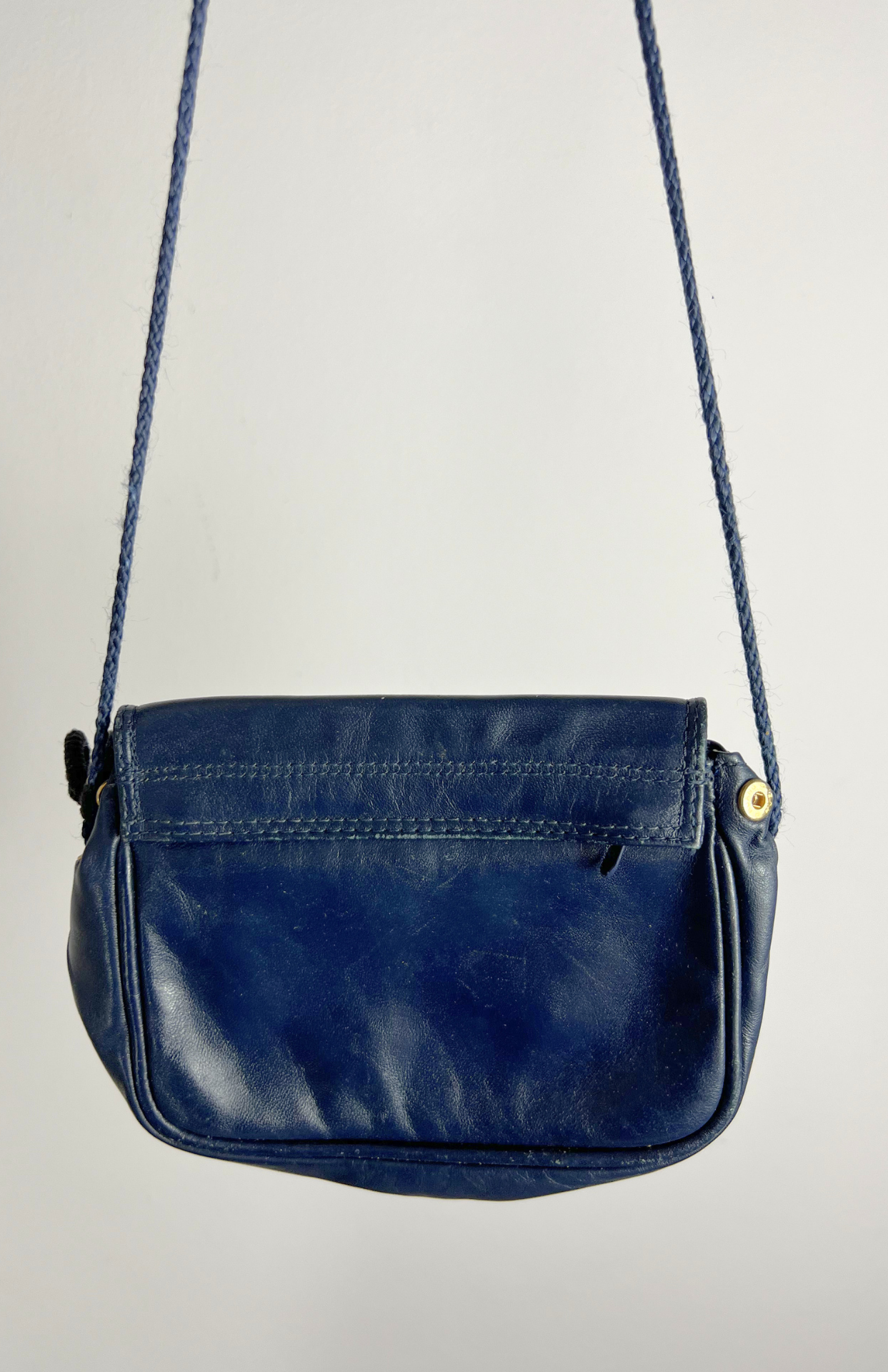 Malá tmavě modrá retro kožená kabelka. Má kapsu na zip a šňůrku jako popruh.