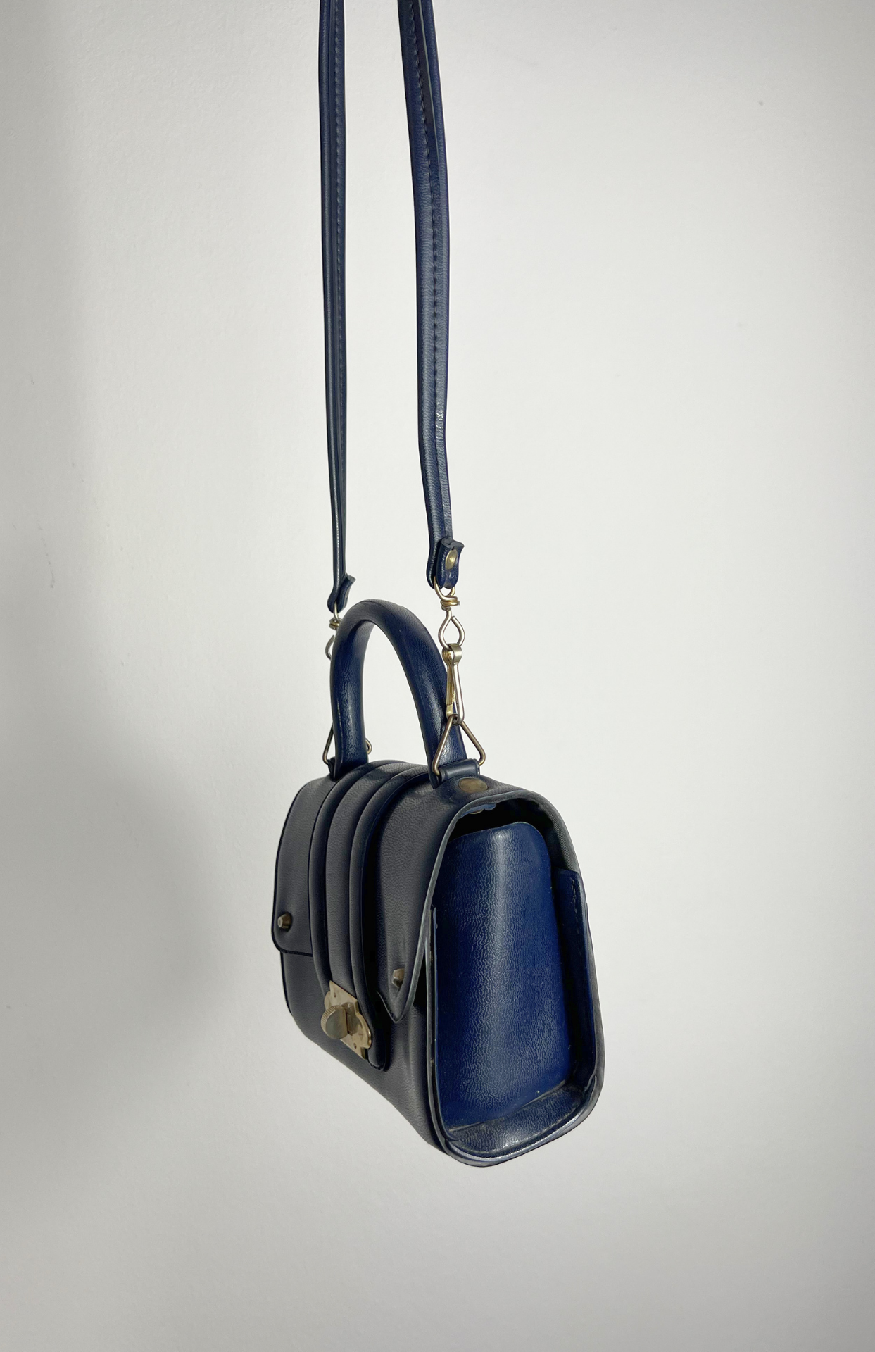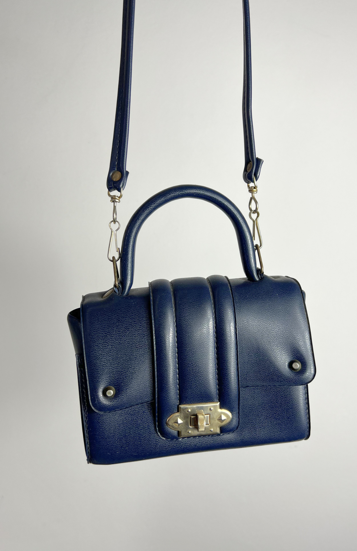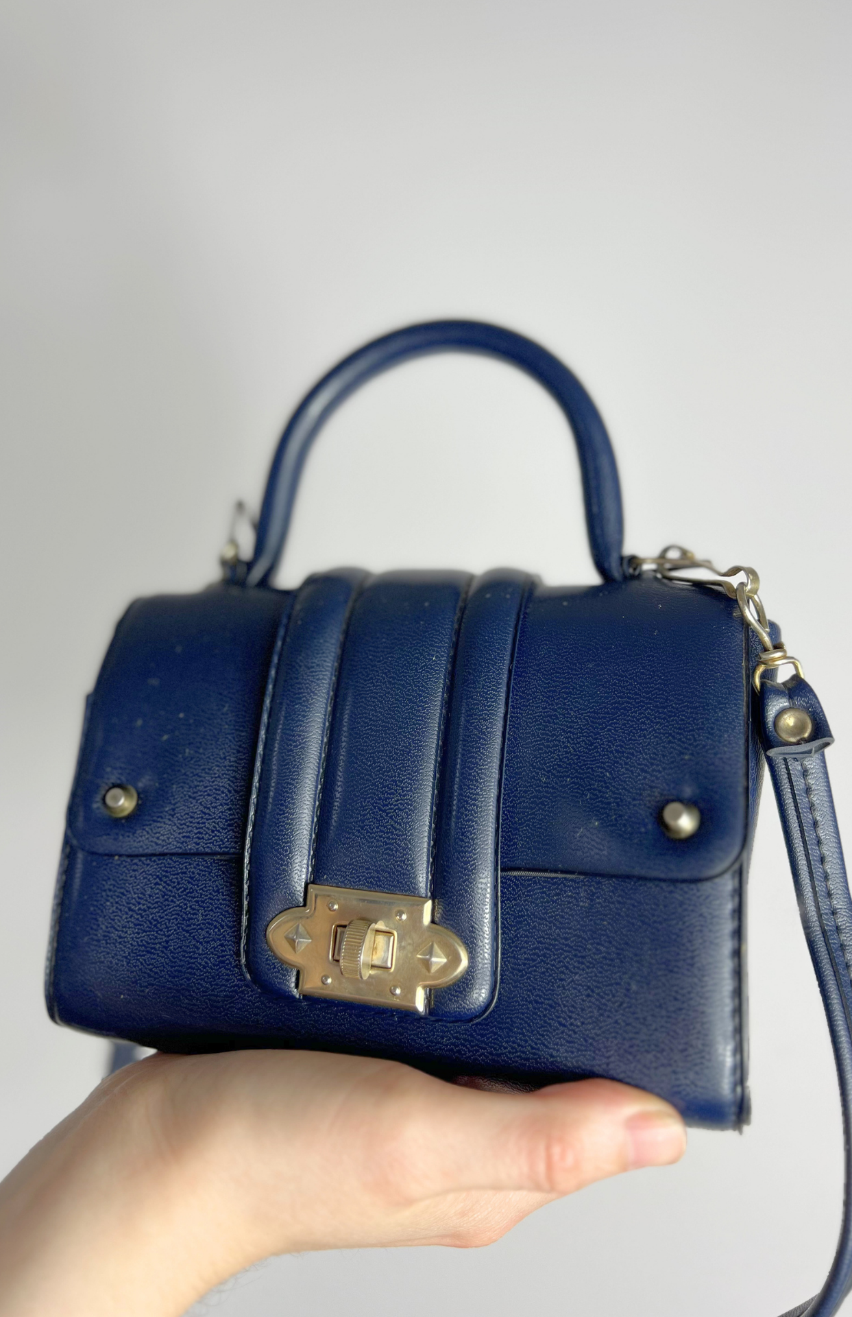 Malá tmavě modrá retro kožená kabelka. Má odnímatelný popruh a pěkné zapínání.