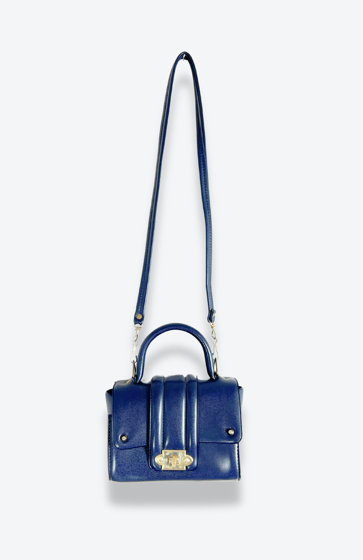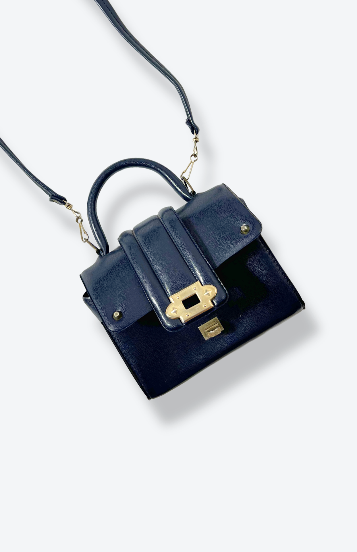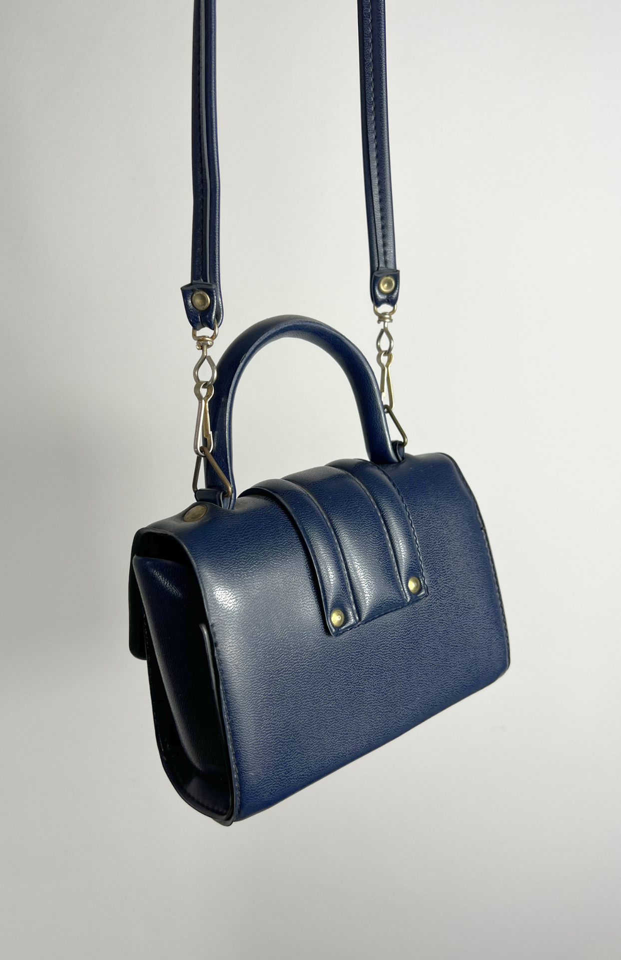 Malá tmavě modrá retro kožená kabelka. Má odnímatelný popruh a pěkné zapínání.
