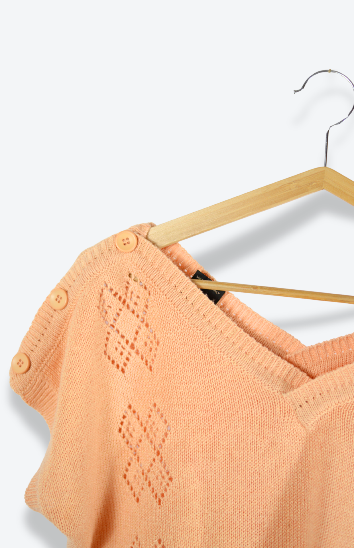 Vintage meruňkový svetřík / úpletový top. Má lehce netopýří střih, knoflíky na ramenou a pěkný vzor v úpletu.