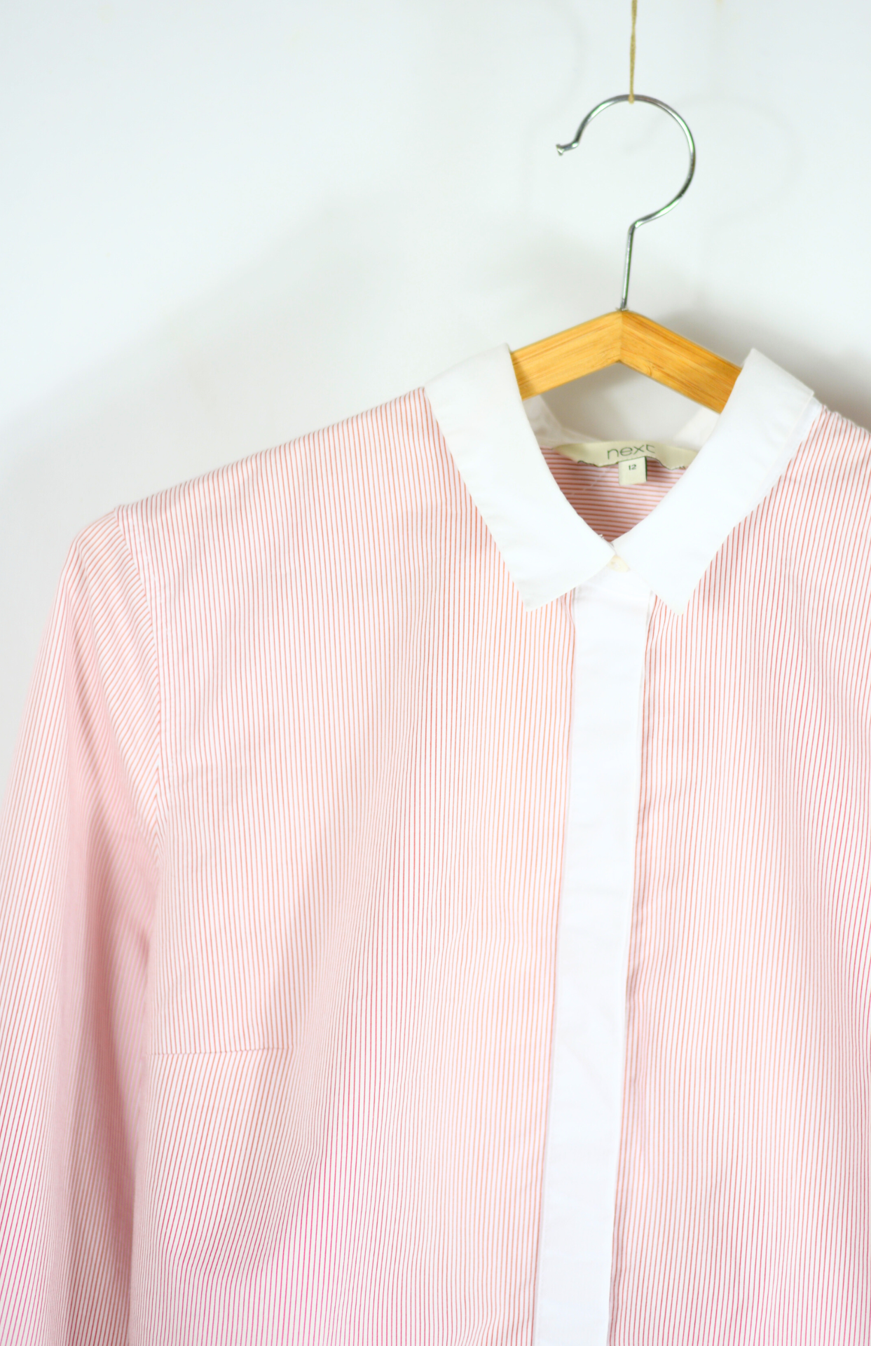 Šik košile s bílými detaily a tenkým růžovým proužkem. Skryté zapínání na knoflíčky. Pěkně zpracovaný elegantní kousek.