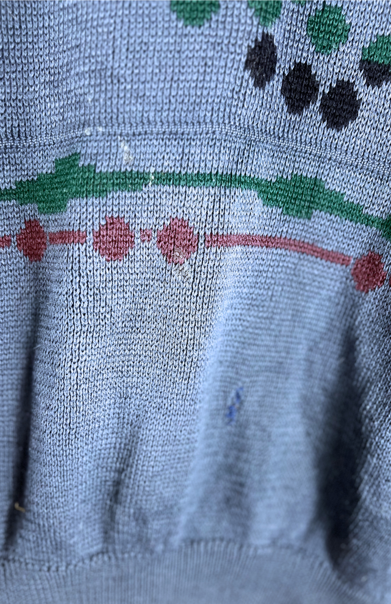 Modrý vlněný vintage svetr se vzorem. Má volný střih a silnější úplet. Unisex kousek.
