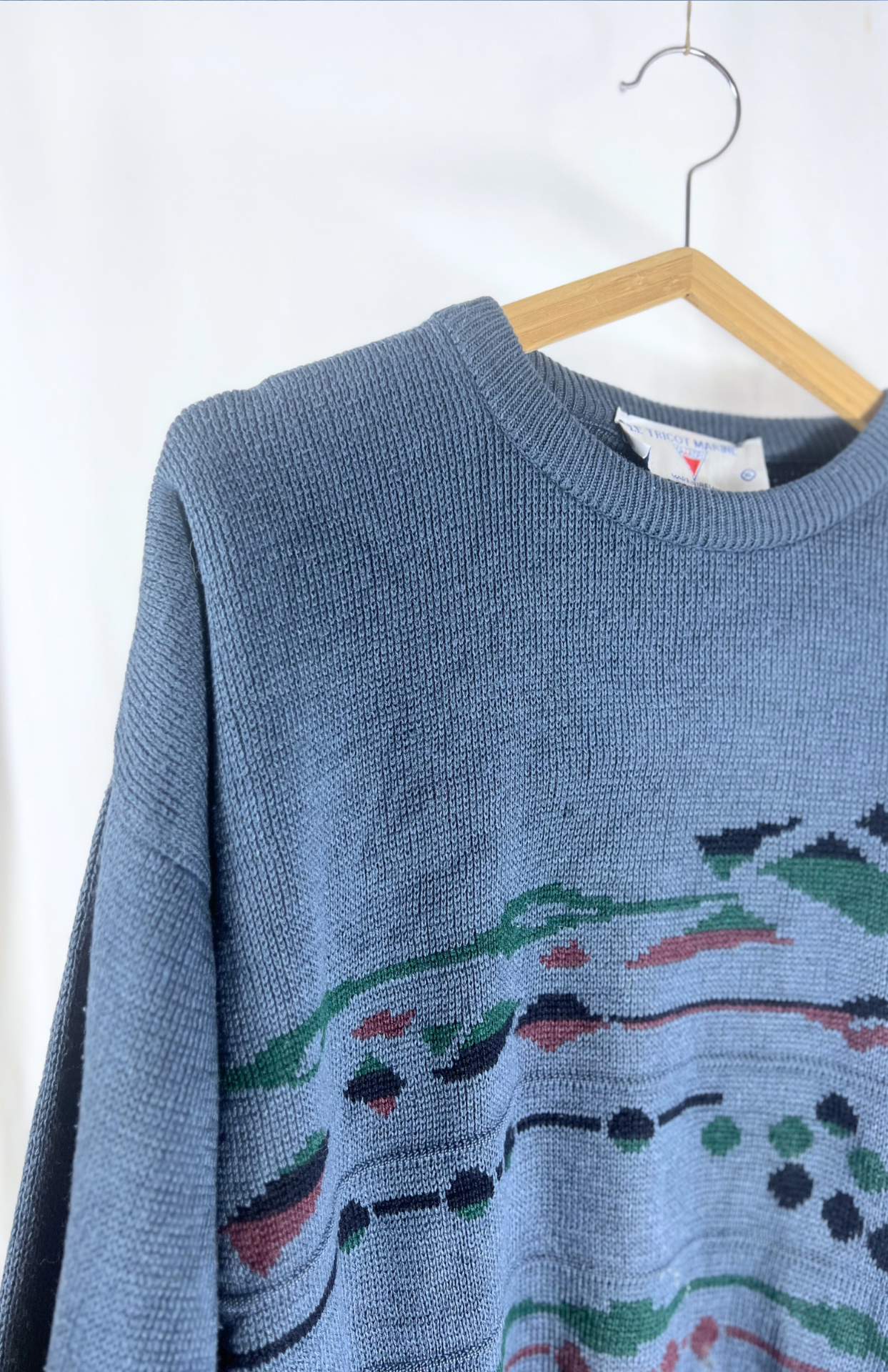 Modrý vlněný vintage svetr se vzorem L/XL