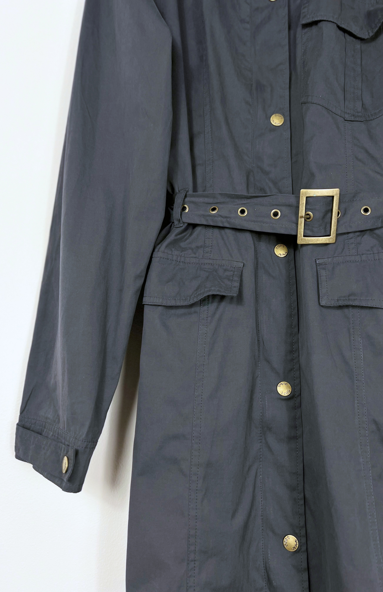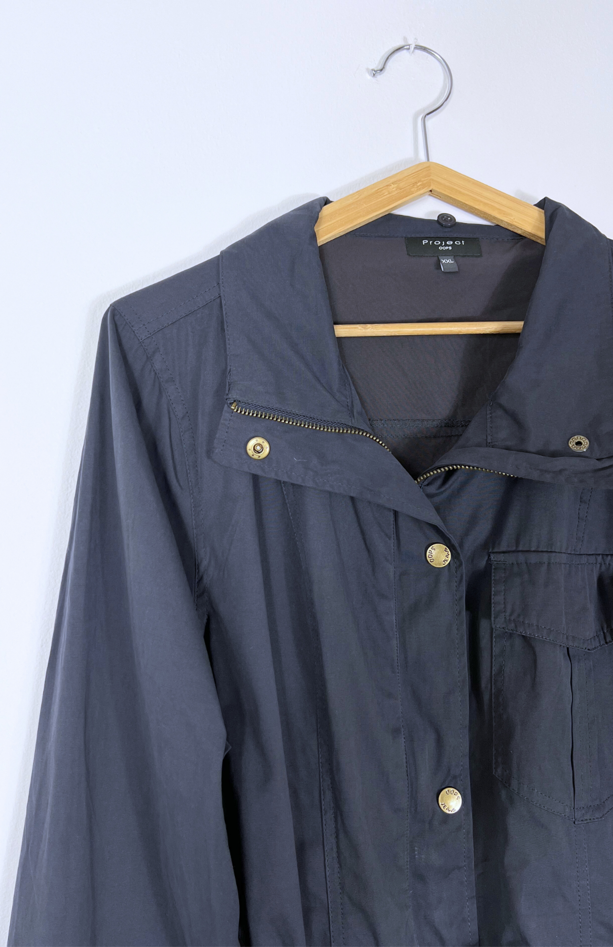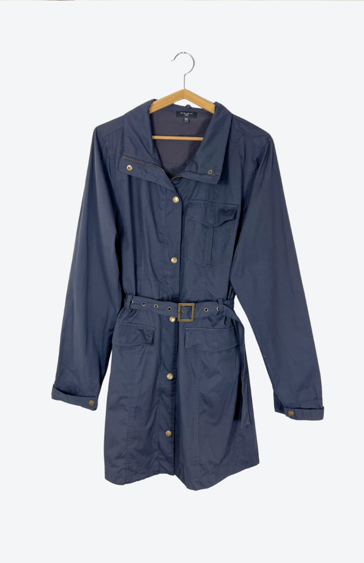 Navy modrý retro trench coat. Má odnímatelný pásek v pase a bronzové kovové detaily. Zapíná se na zip a patenty. Příjemný semišový textil.