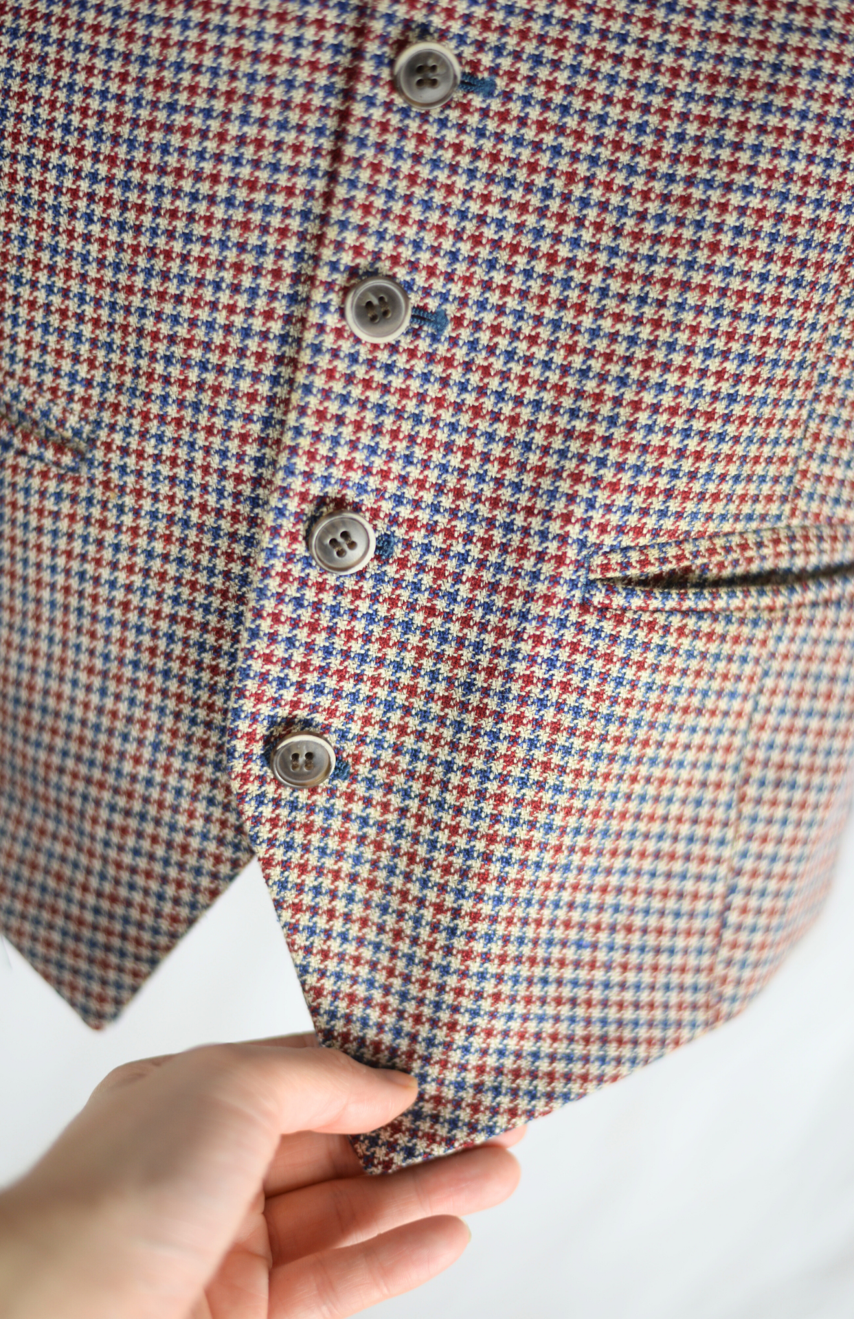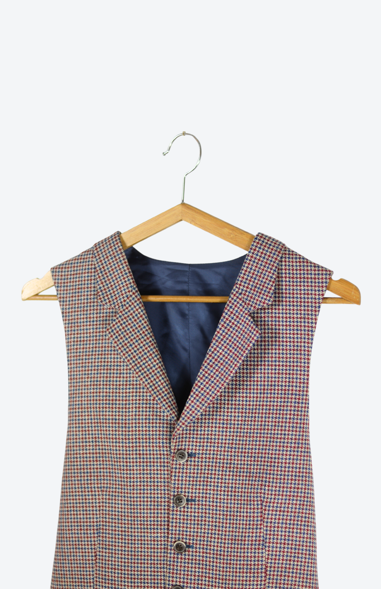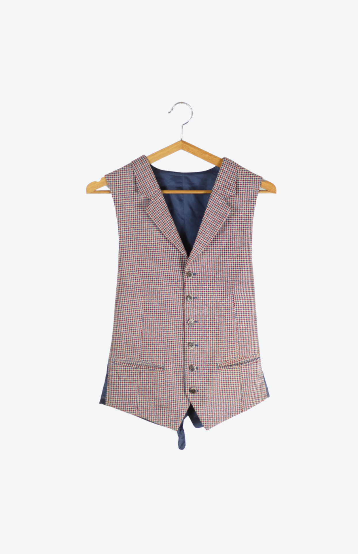 Vesta s drobným pepitovým vzorem. Krémová, červená, modrá. Má saténovou modrou podšívku i záda, vzadu s páskem pro přizpůsobení v pase. Má menší kapsy po stranách.