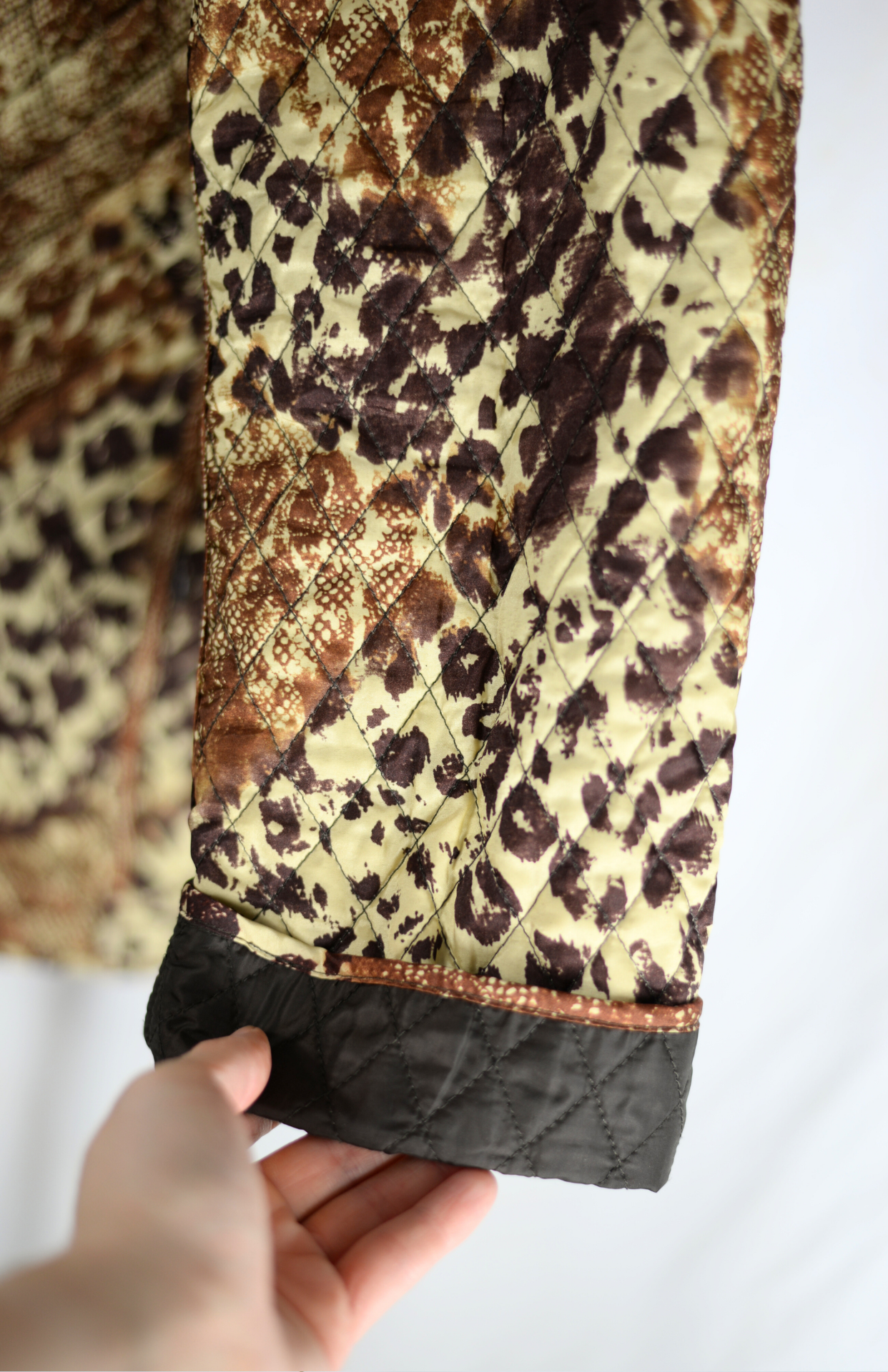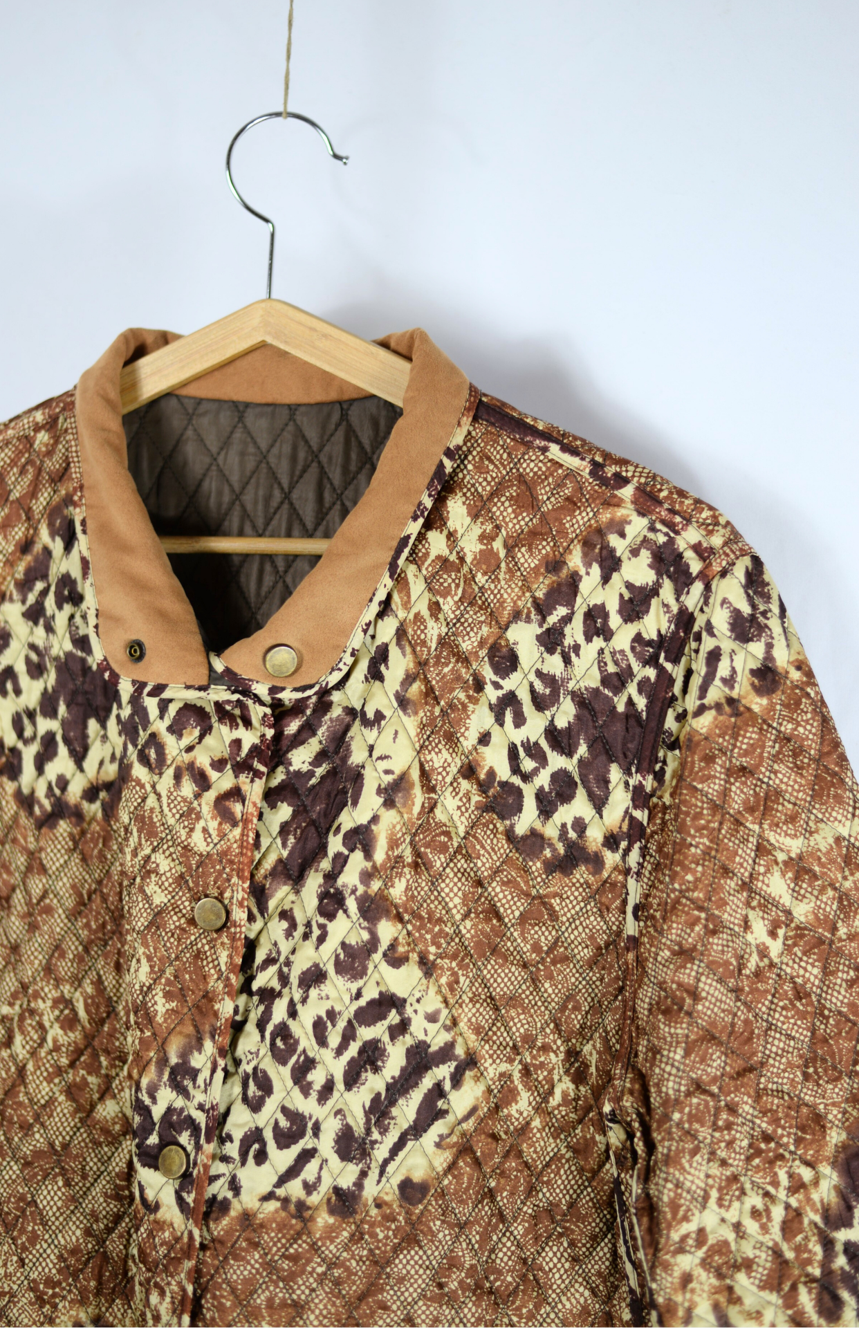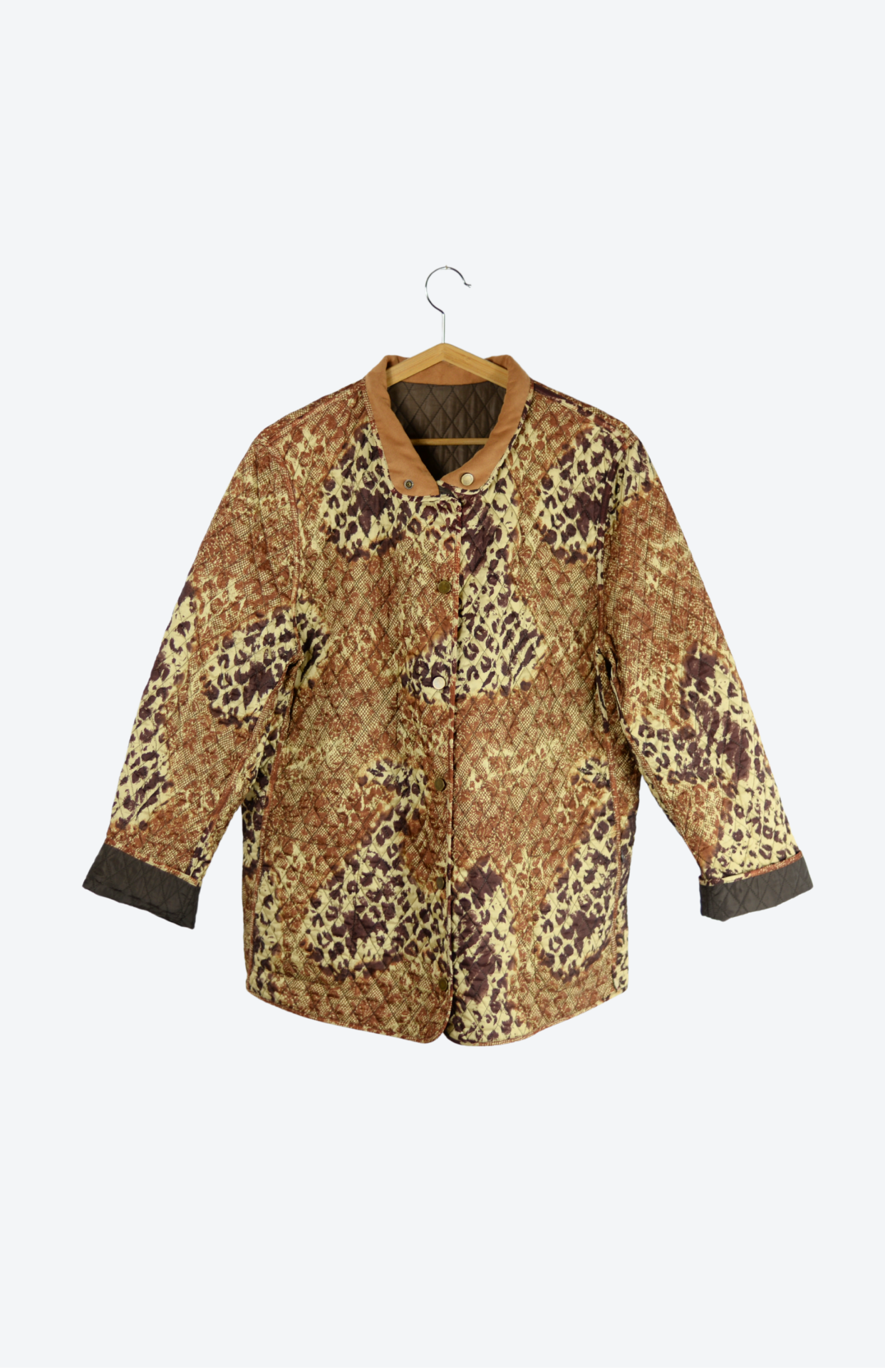 Jednou prošívaná hnědá, podruhé leo print. Stačí obrátit. Má kapsy a drobný semišový límeček. Stav: Ve skvělém stavu, bez vad.