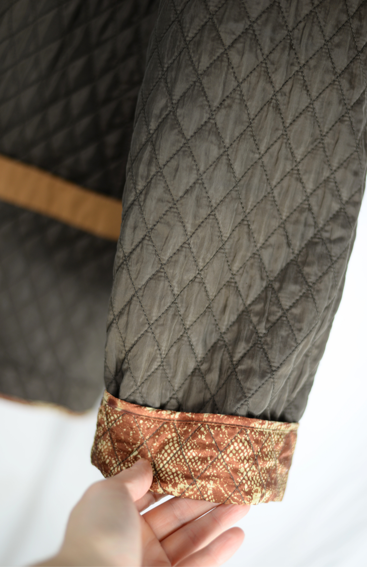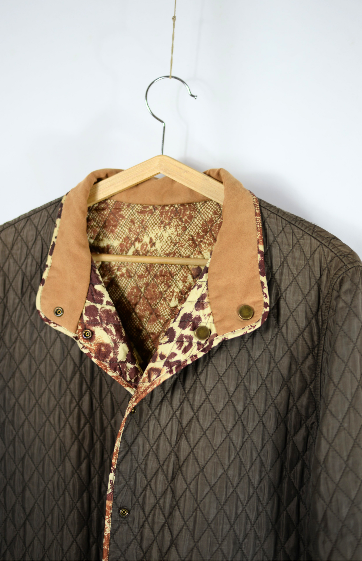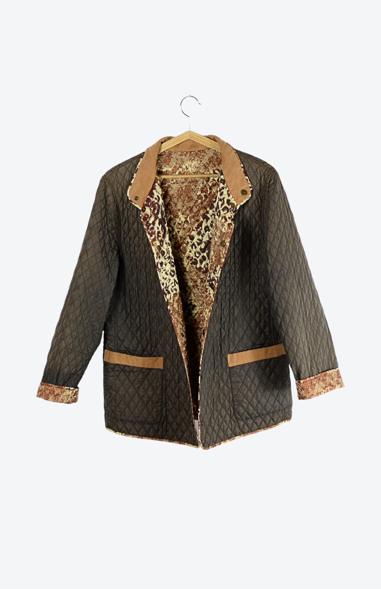 Jednou prošívaná hnědá, podruhé leo print. Stačí obrátit. Má kapsy a drobný semišový límeček. Stav: Ve skvělém stavu, bez vad.