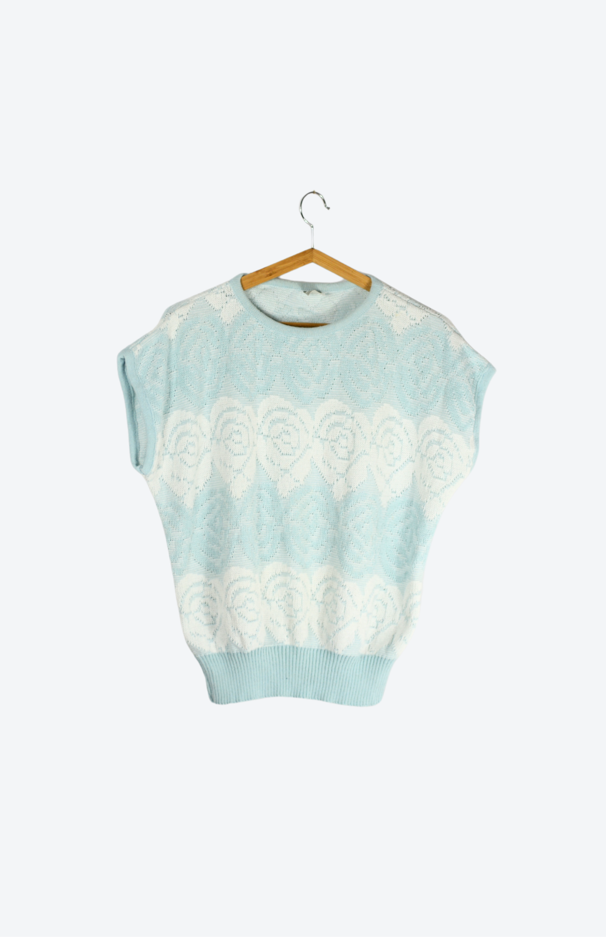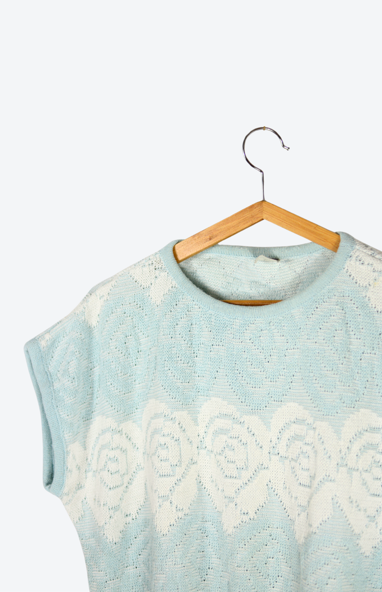 Pastelový květinový svetr s krátkým rukávem. Květy ala krajka a pastelový odstín modré.