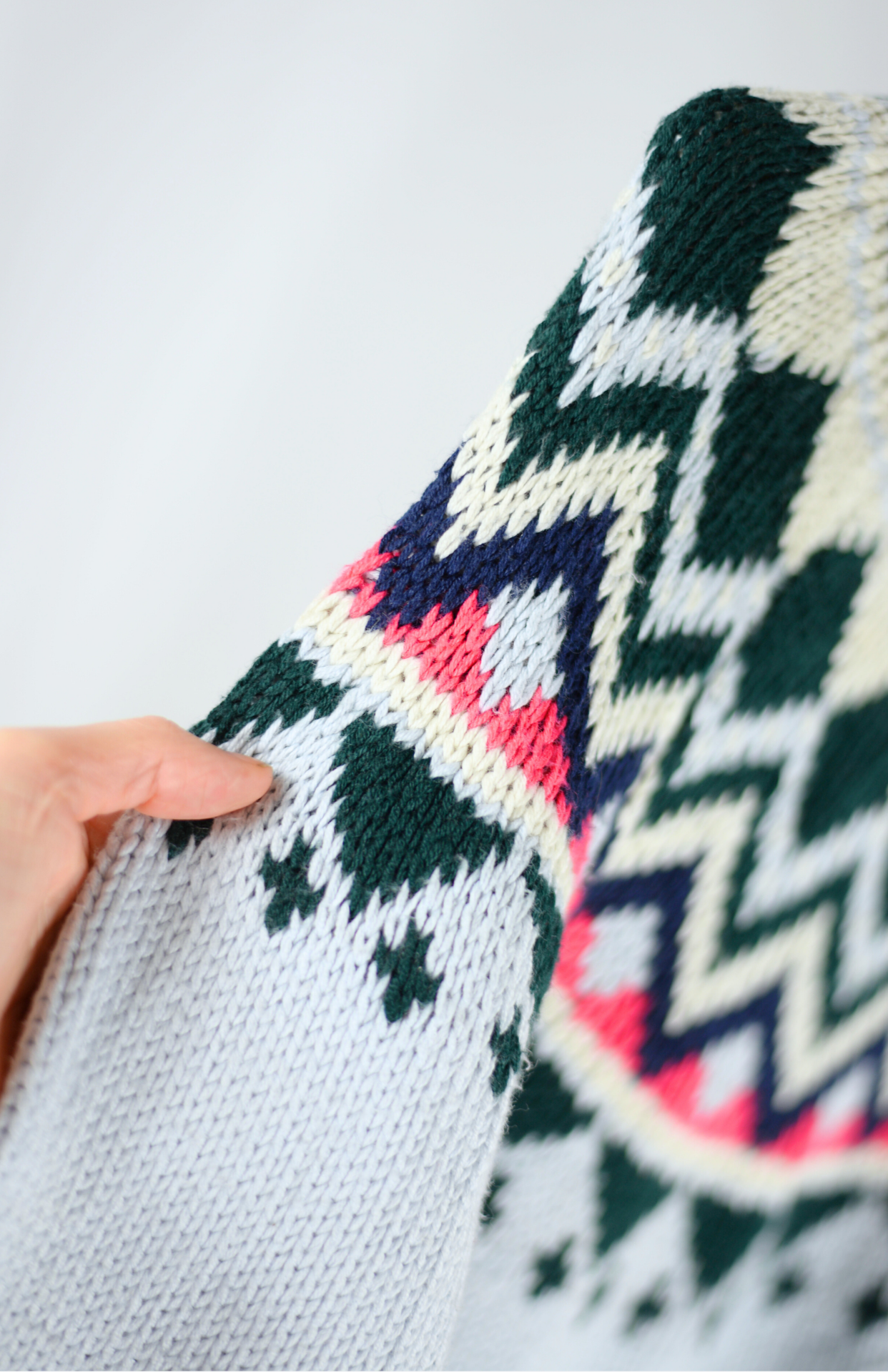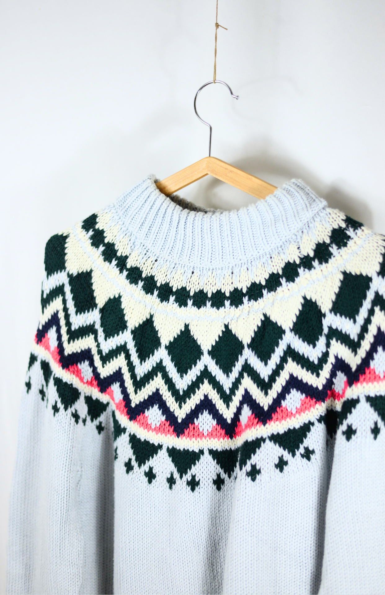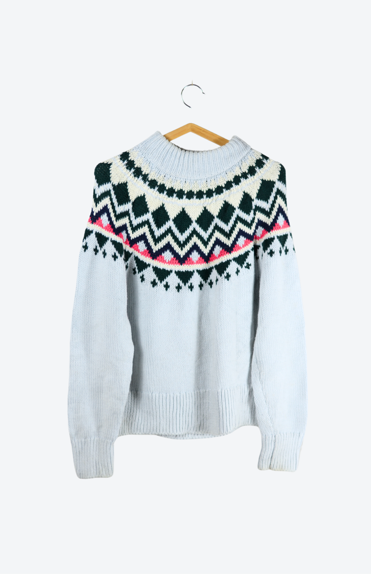Vintage svetr s funky barevným, kontrastním vzorem. Má lehce nabíraný rukáv a silný teplý úplet.