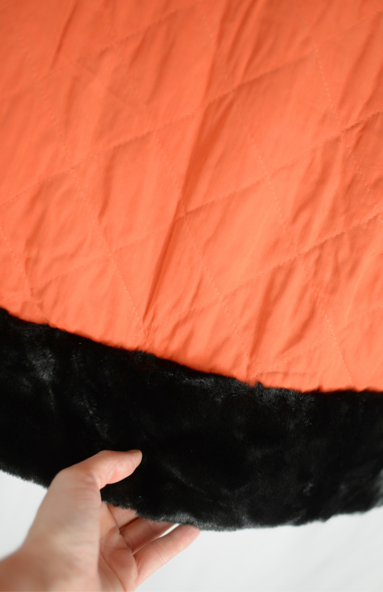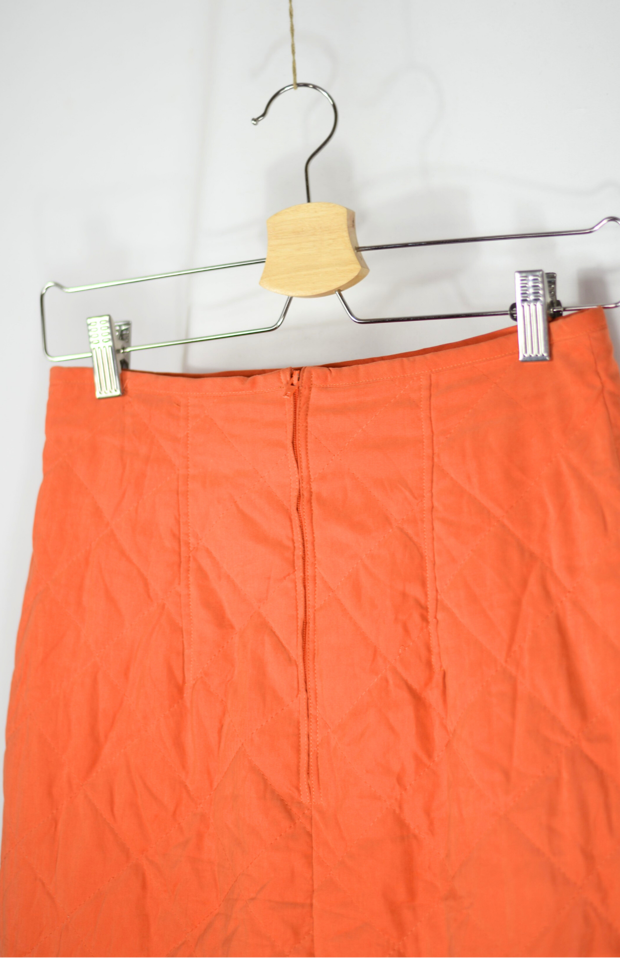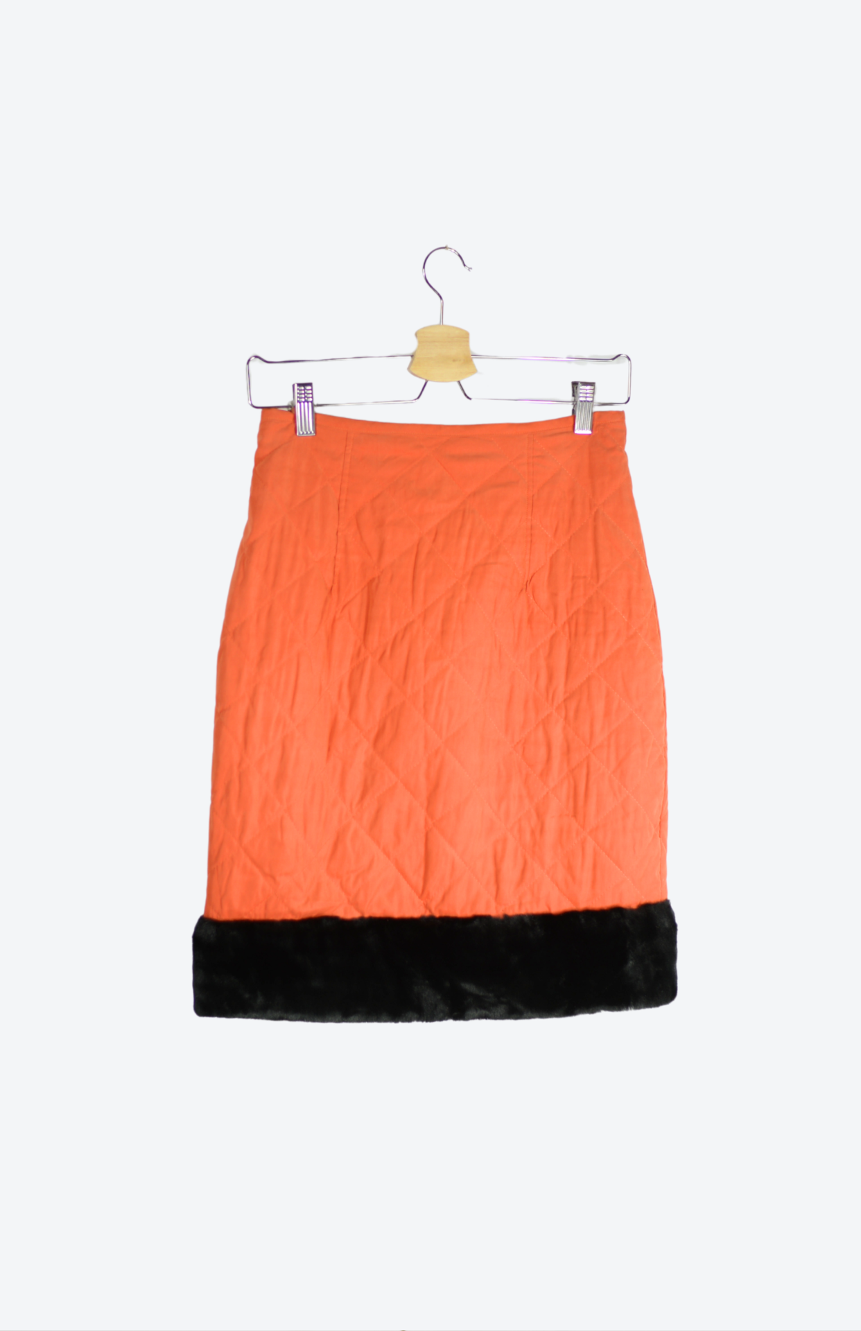 Prošívaná cihlová sukně s pevným pasem a zapínáním na zip vzadu. Má černý fluffly lem ala umělá kožešinka. Originální zimní kousek.