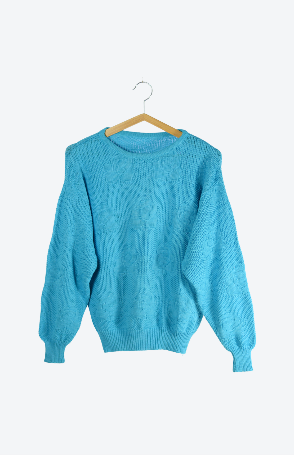 Retro azurový svetr s květinami. Má nabíraný rukáv a oblíbený 80´s střih.Stav: Ve skvělém stavu, bez vad.Materiál: 30% bavlna, 70% polyakryl