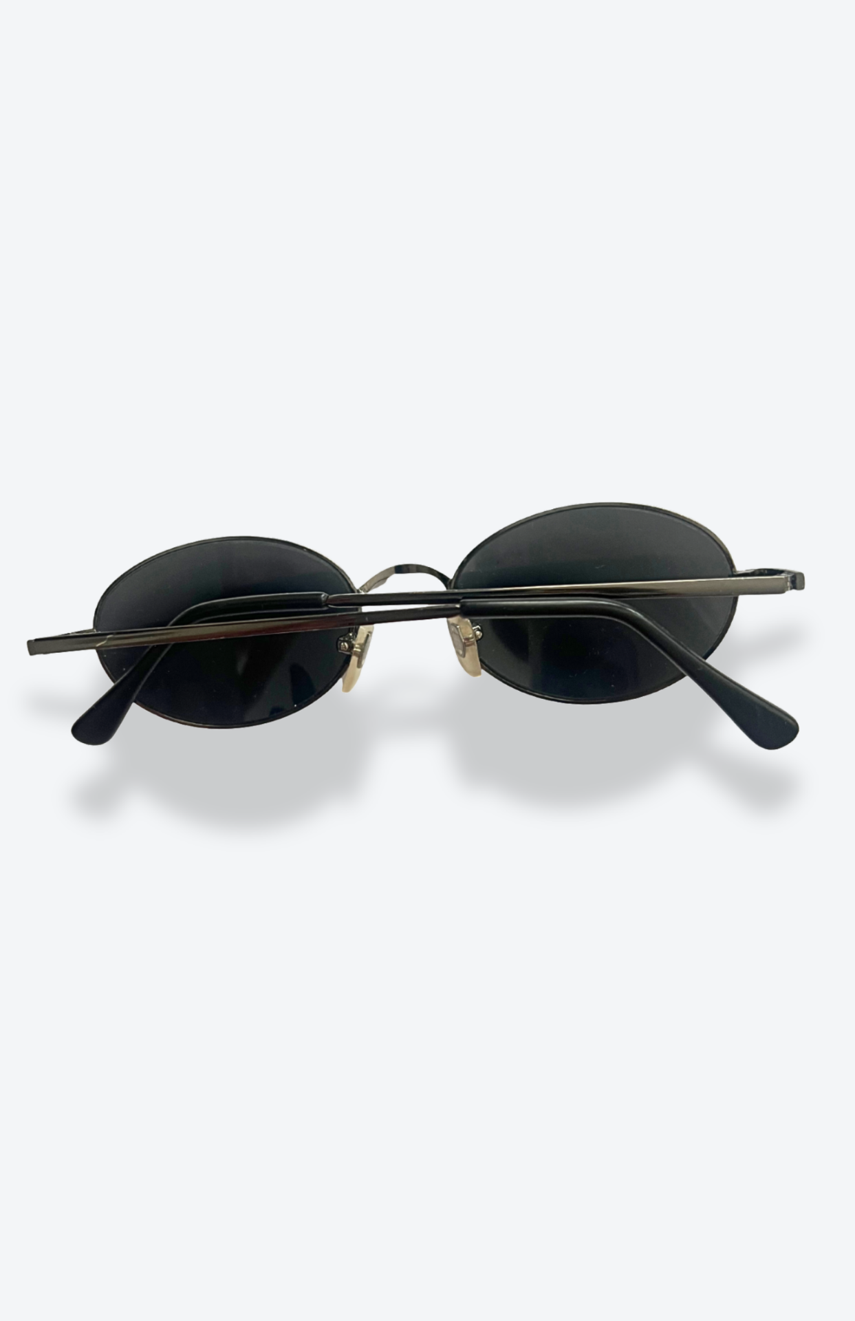 Retro brýle s tenkými žíhanými rámečky a tmavými hladkými kovovými detaily. Kulatější tvar sklíček, černá skla.