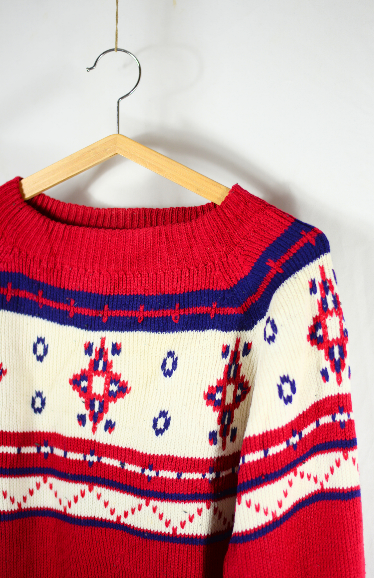 Sytě červený retro svetr s výrazným vzorem. Volnější rovný střih. Stav: V pěkném stavu, pouze lehčí známky nošení.Materiál: 100% akryl