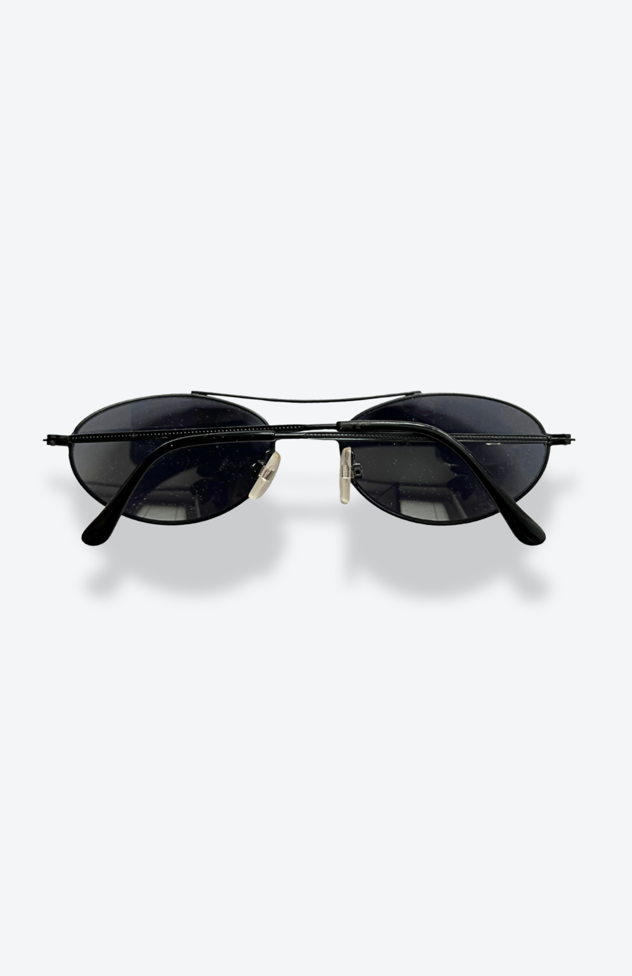 Čistě černé retro brýle s podlouhlými skly a tenkým dlouhým vrchním nosníkem. Originální kousek.