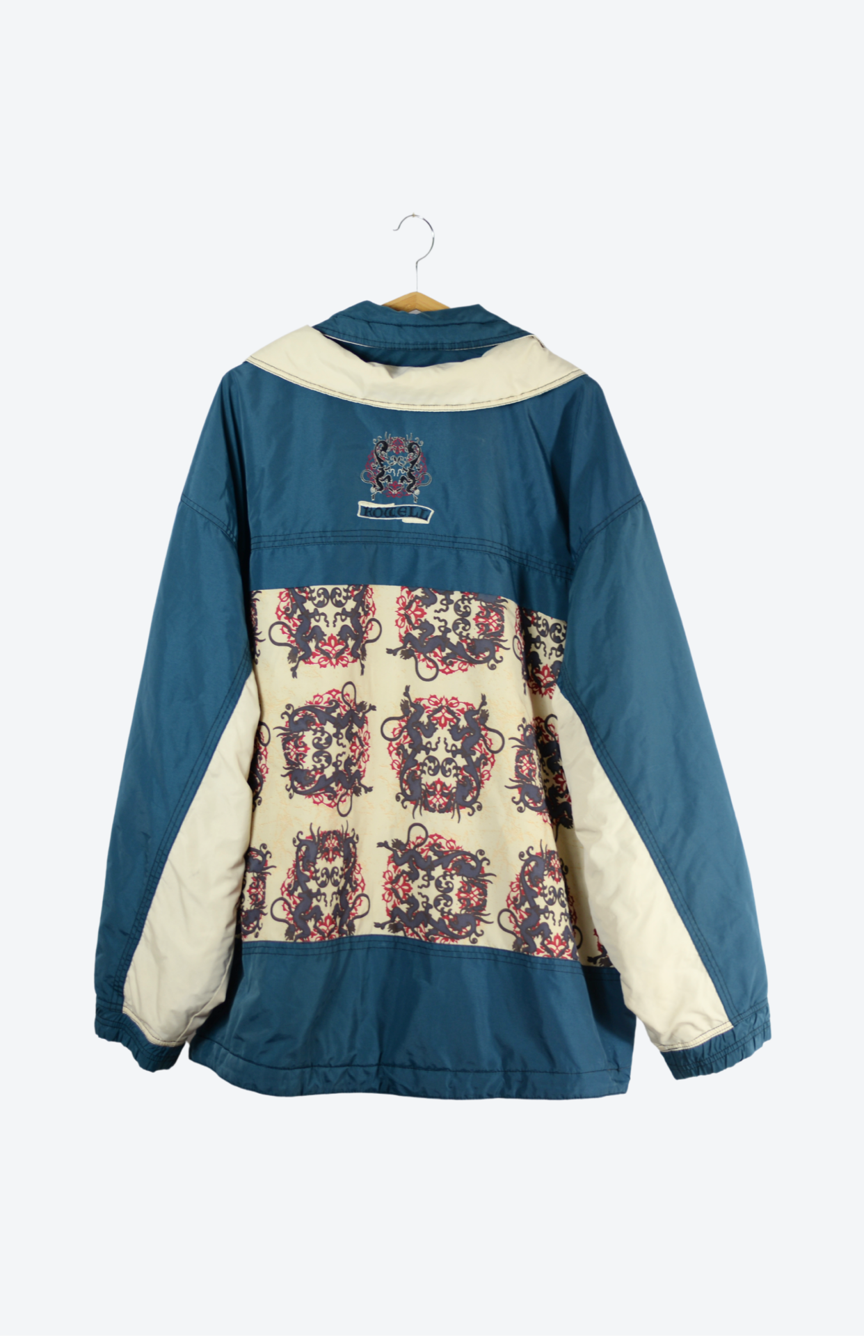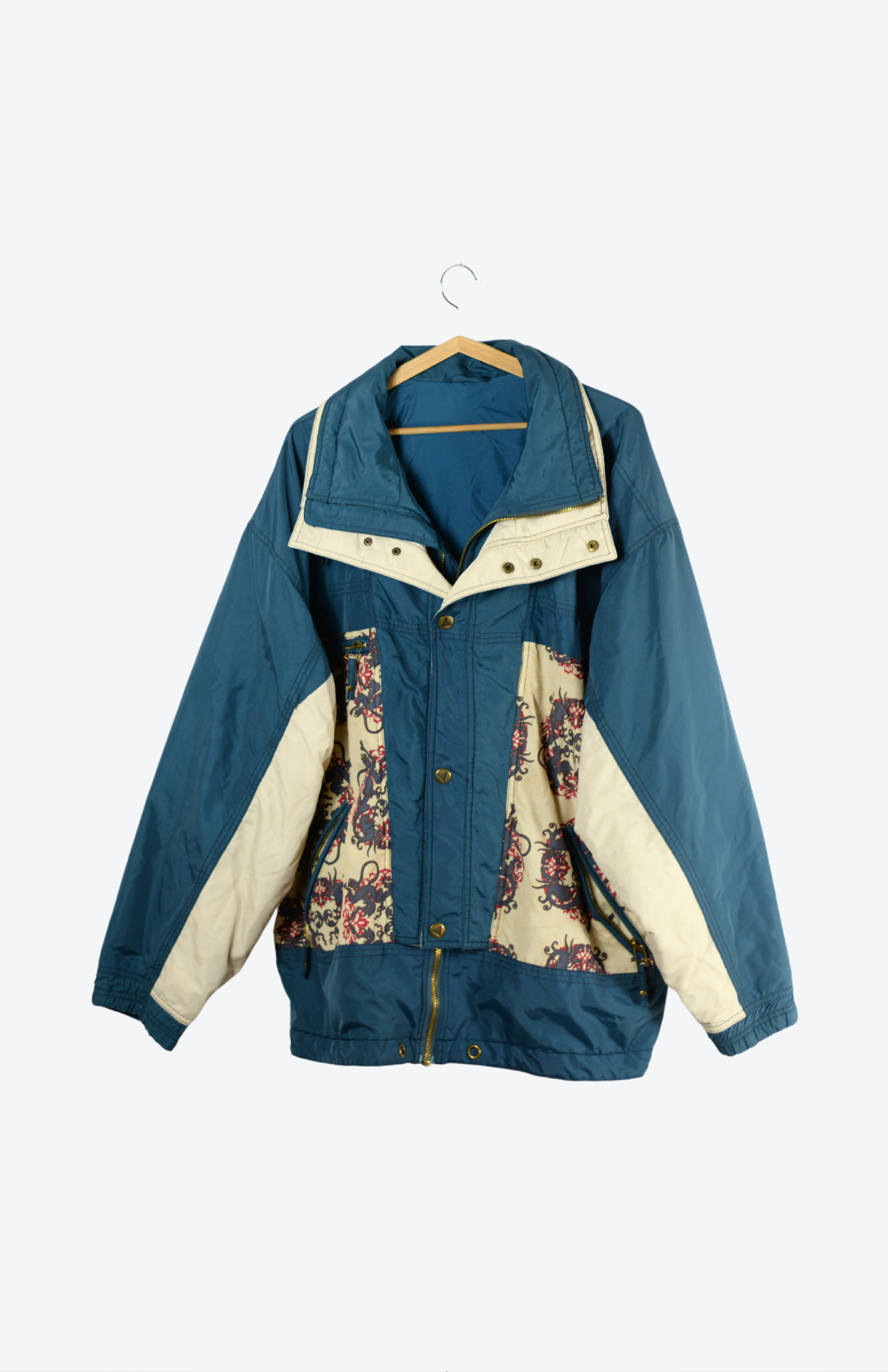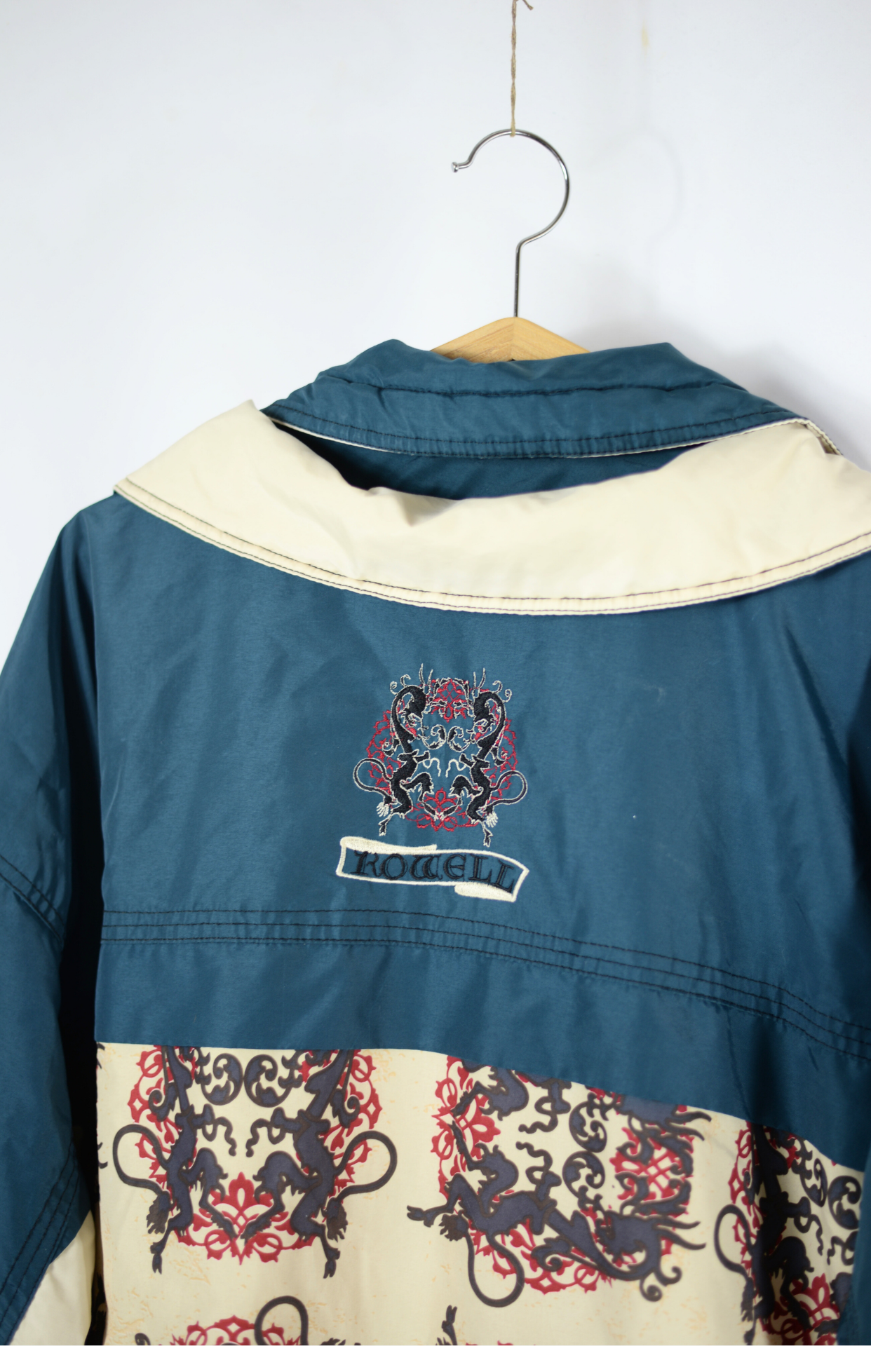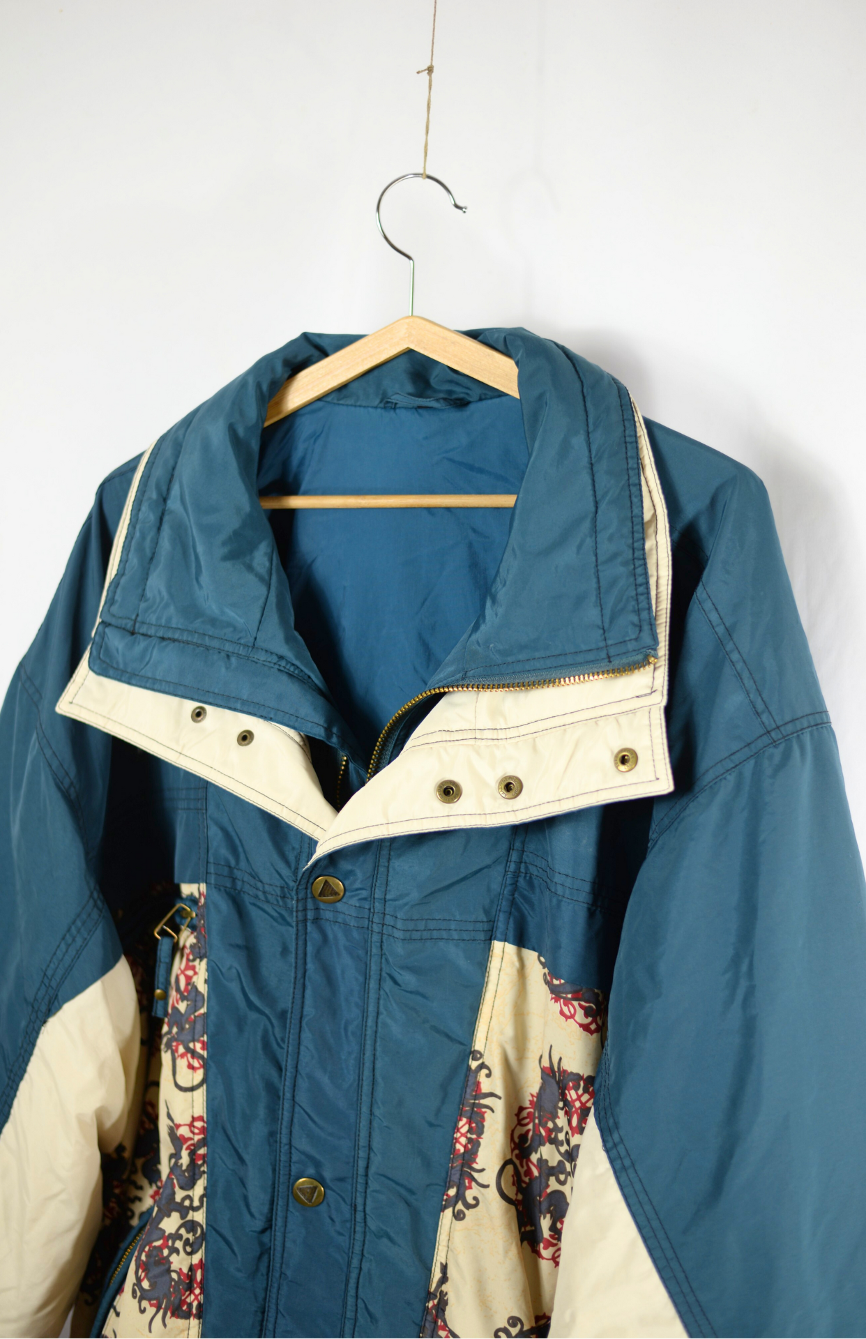 Retro petrolejová bunda. Lehce nabíraný 80’s střih, zapínání na druky a zip. Po stranách má kapsy a na zádech výšivku. Pánská / unisex oversize.