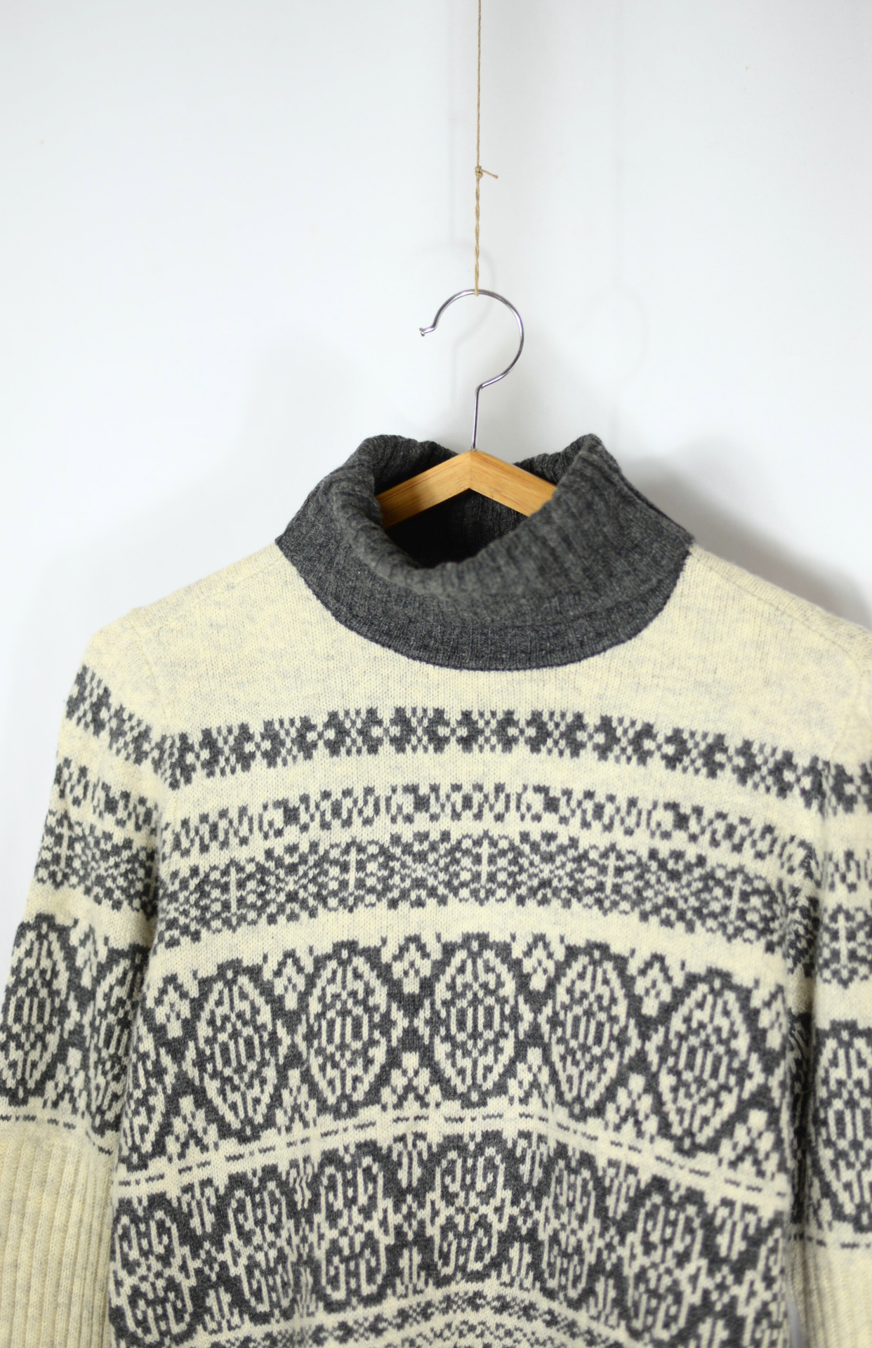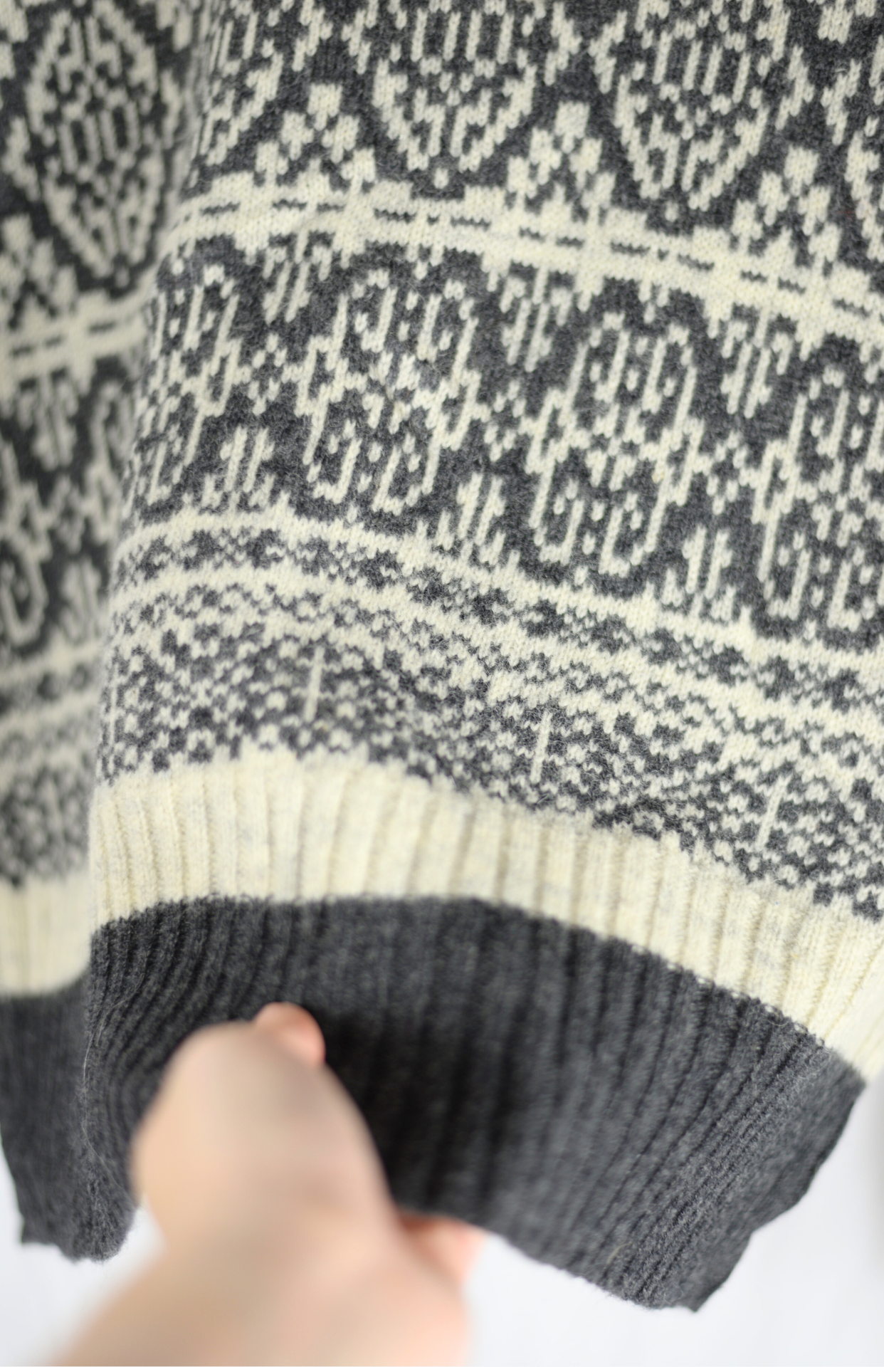 Vintage vlněný retro vzorovaný rolák. Má drobný šedý vzor a tmavě šedé lemování. Příjemný tenčí úplet a přiléhavý střih.
