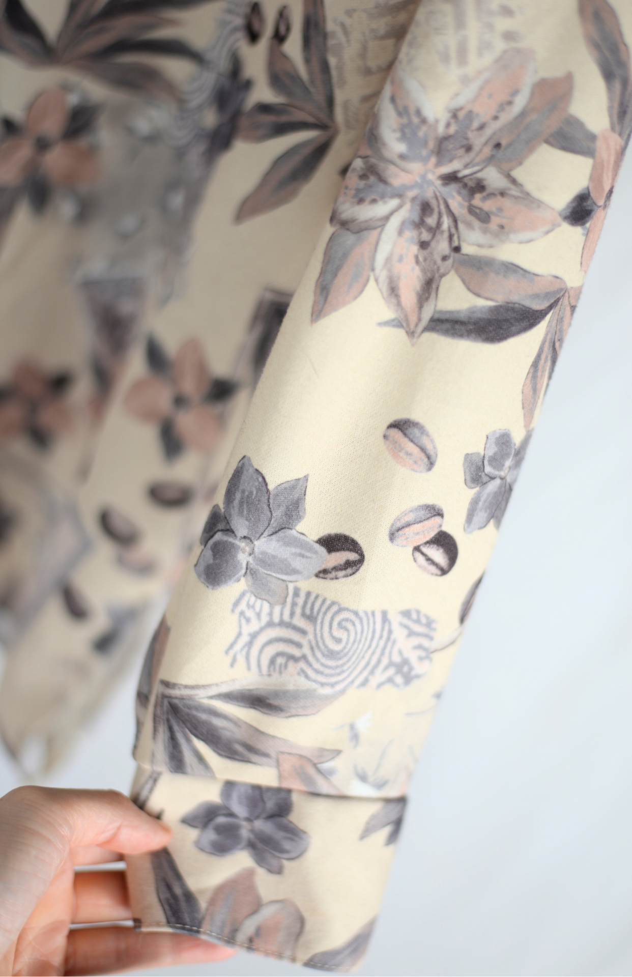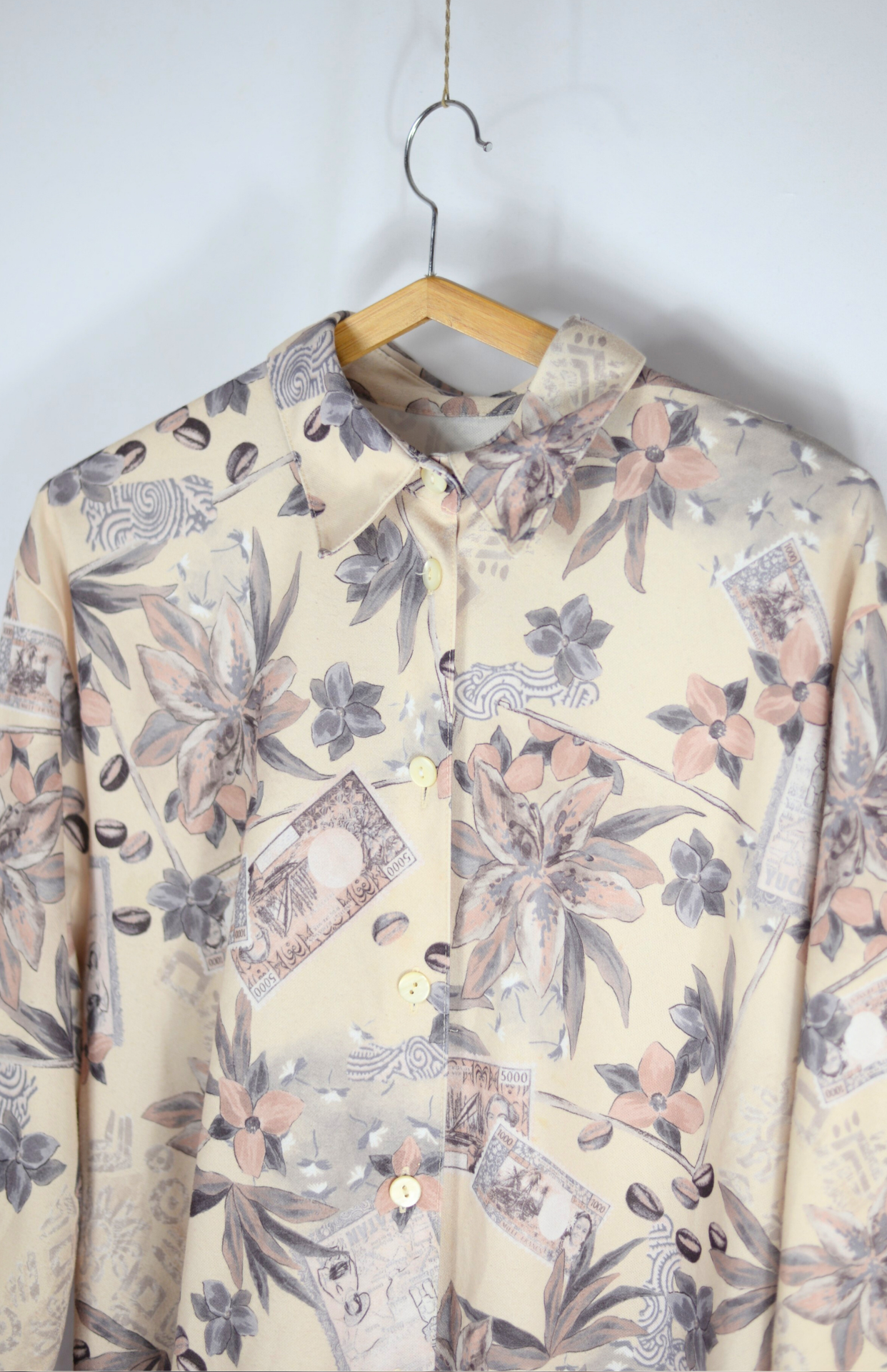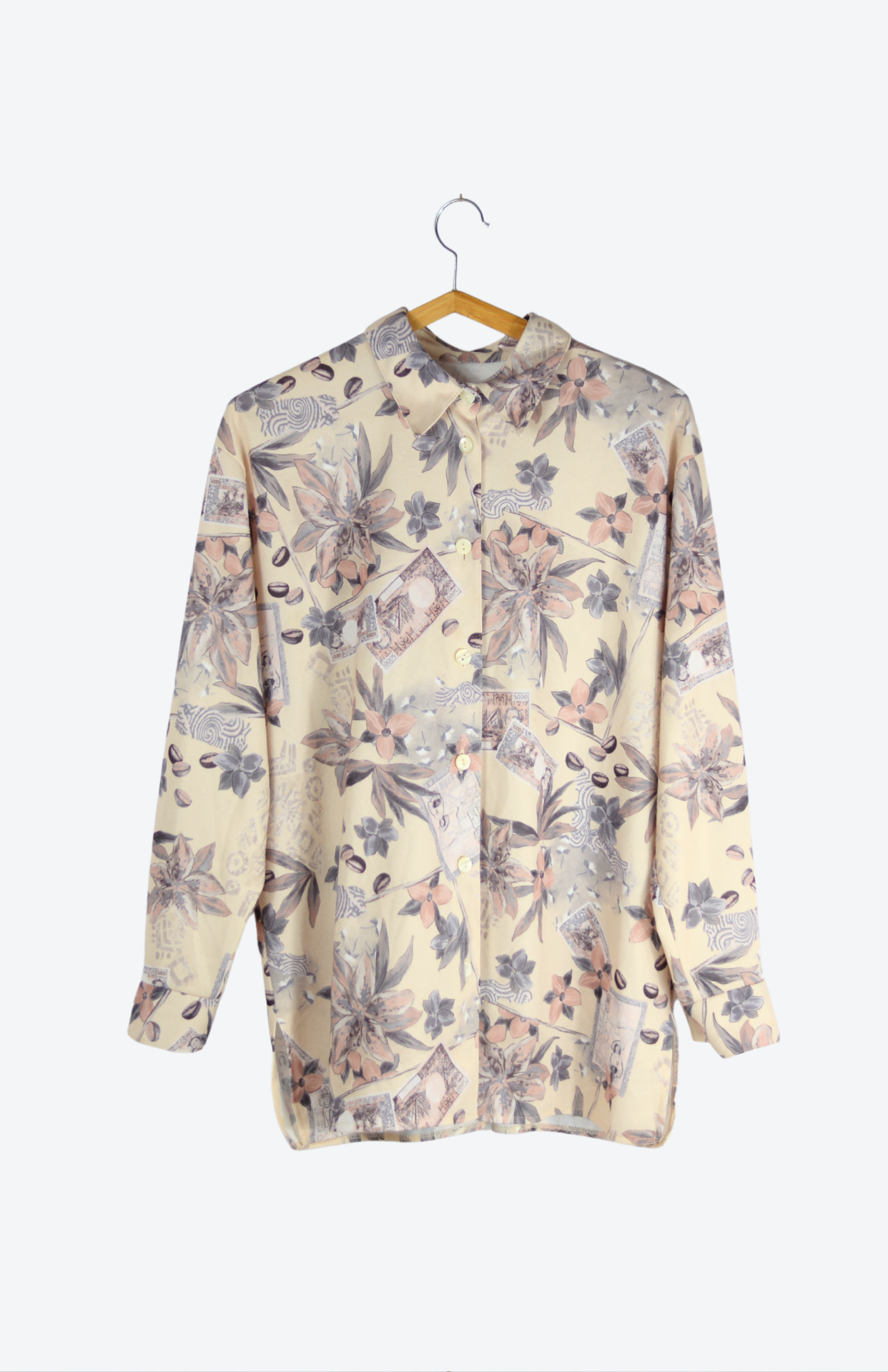 Vintage propínací košile s límečkem, kvítky a kávovými zrnky. Má dlouhý rukáv, teplejší materiál. Stav: Ve skvělém stavu, pouze drobné známky nošení, náznak žmolků.