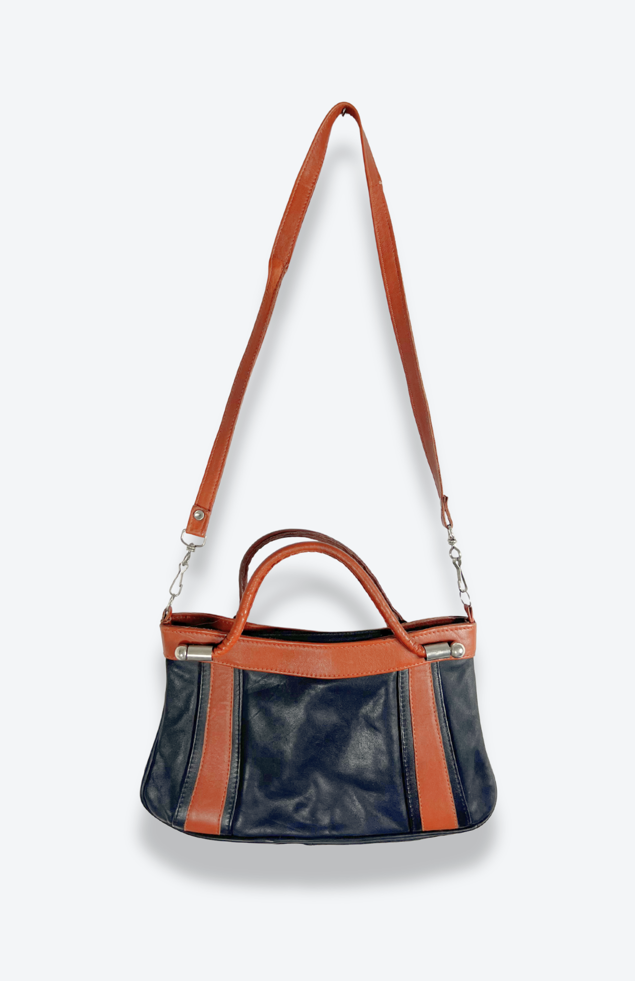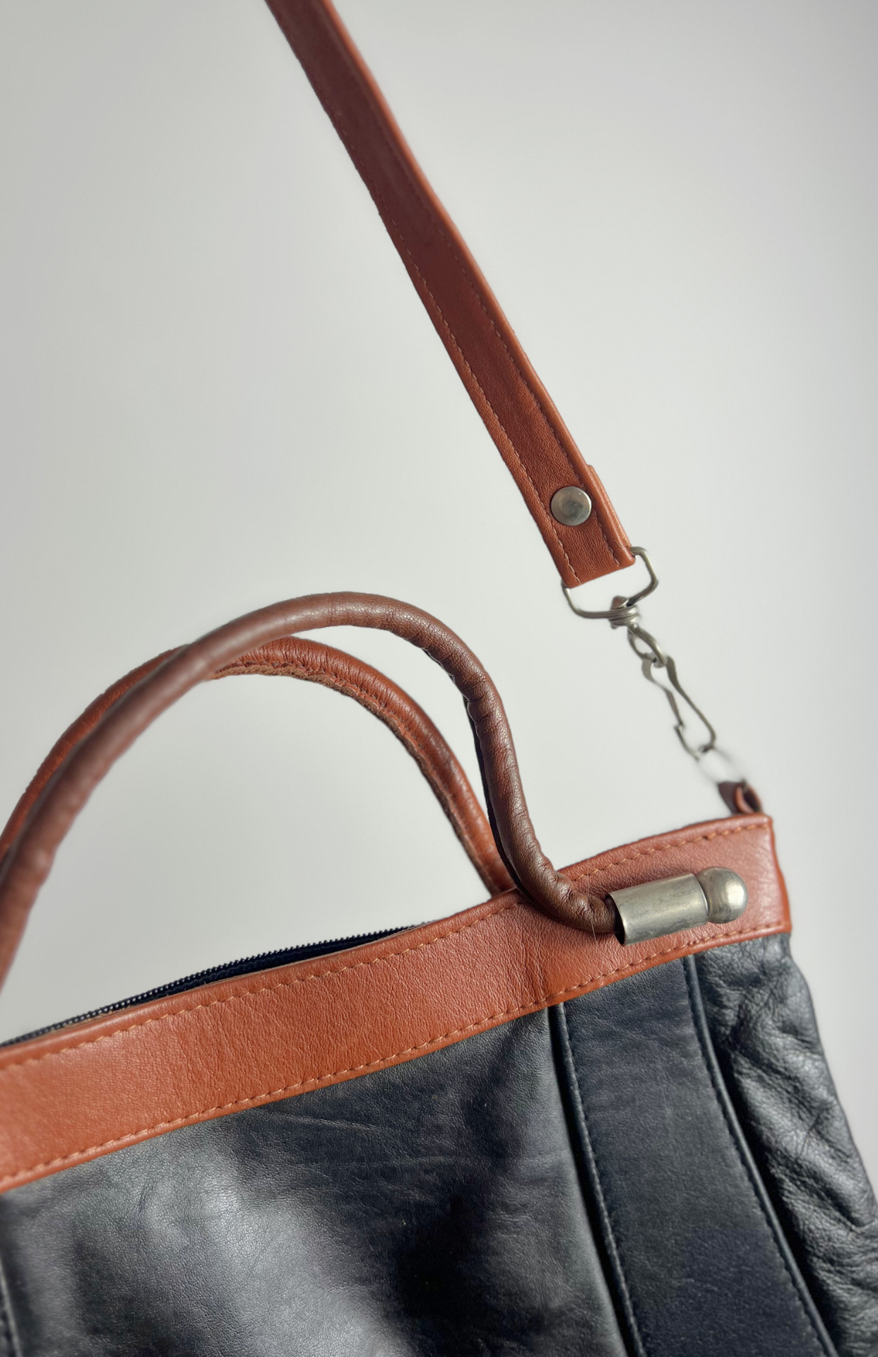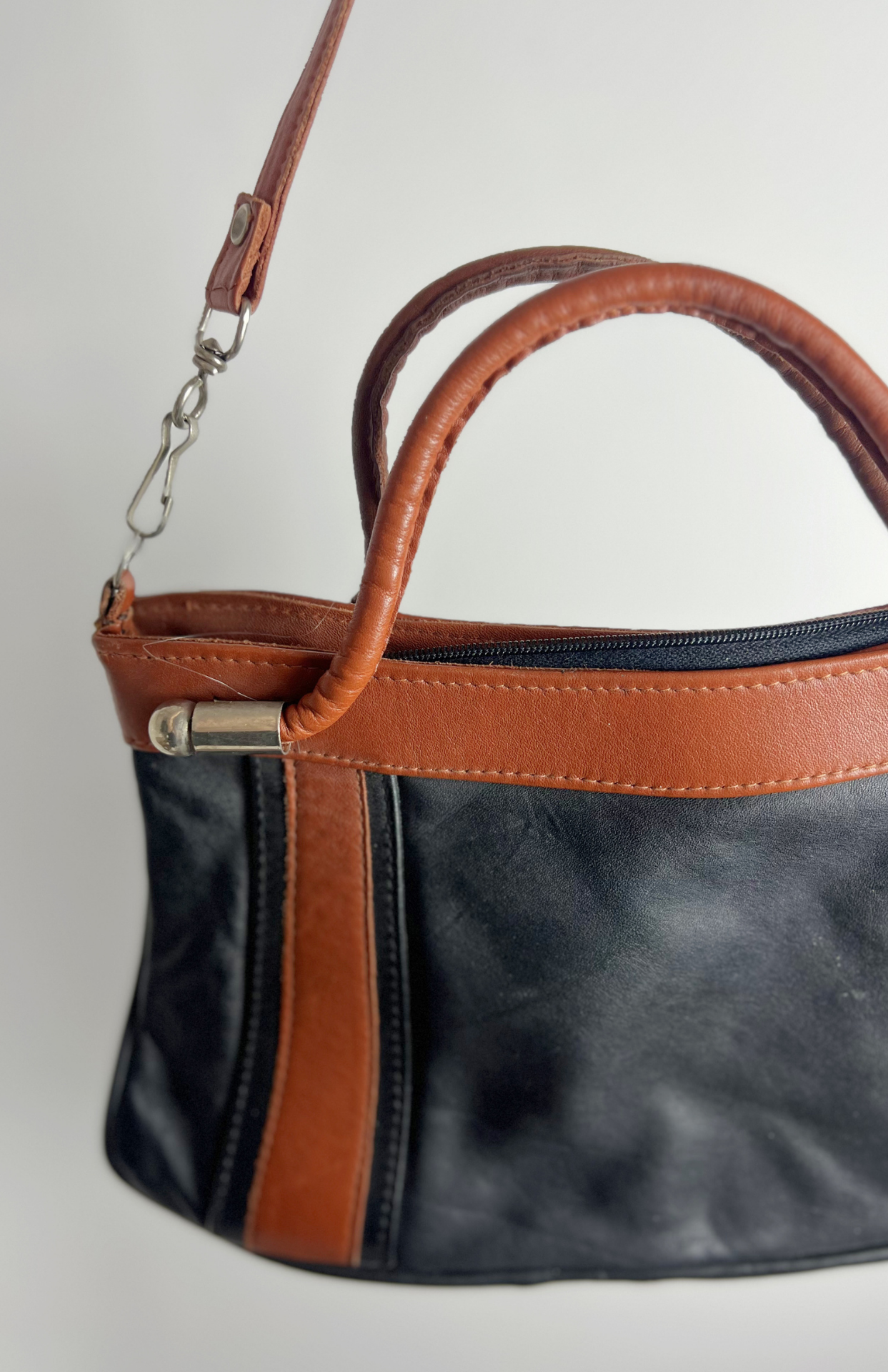 Retro kožená kabelka s hnědým lemováním. Má ouško do ruky a odnímatelný popruh. Zapínání na zip.