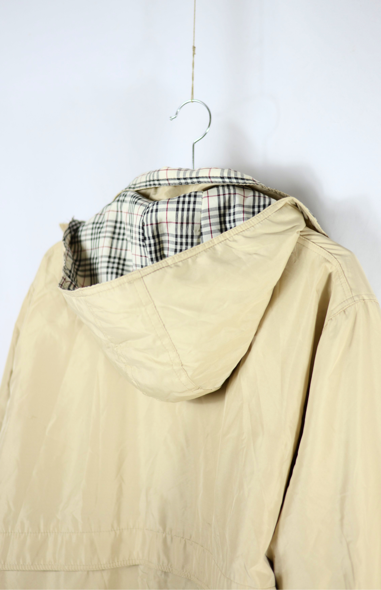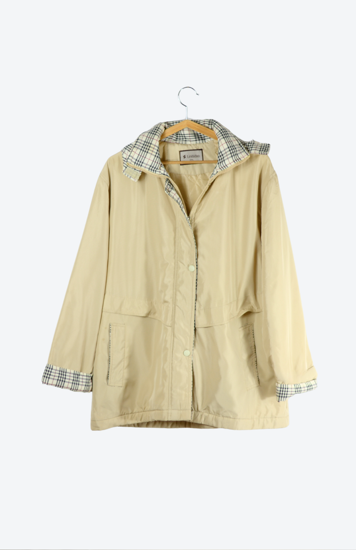 Retro krémová bunda s klasickou kostkou. Má volný střih, skryté zapínání a kapsy s klopami. Vzadu s odnímatelnou kapucí.Stav: Ve skvělém stavu, bez vad.