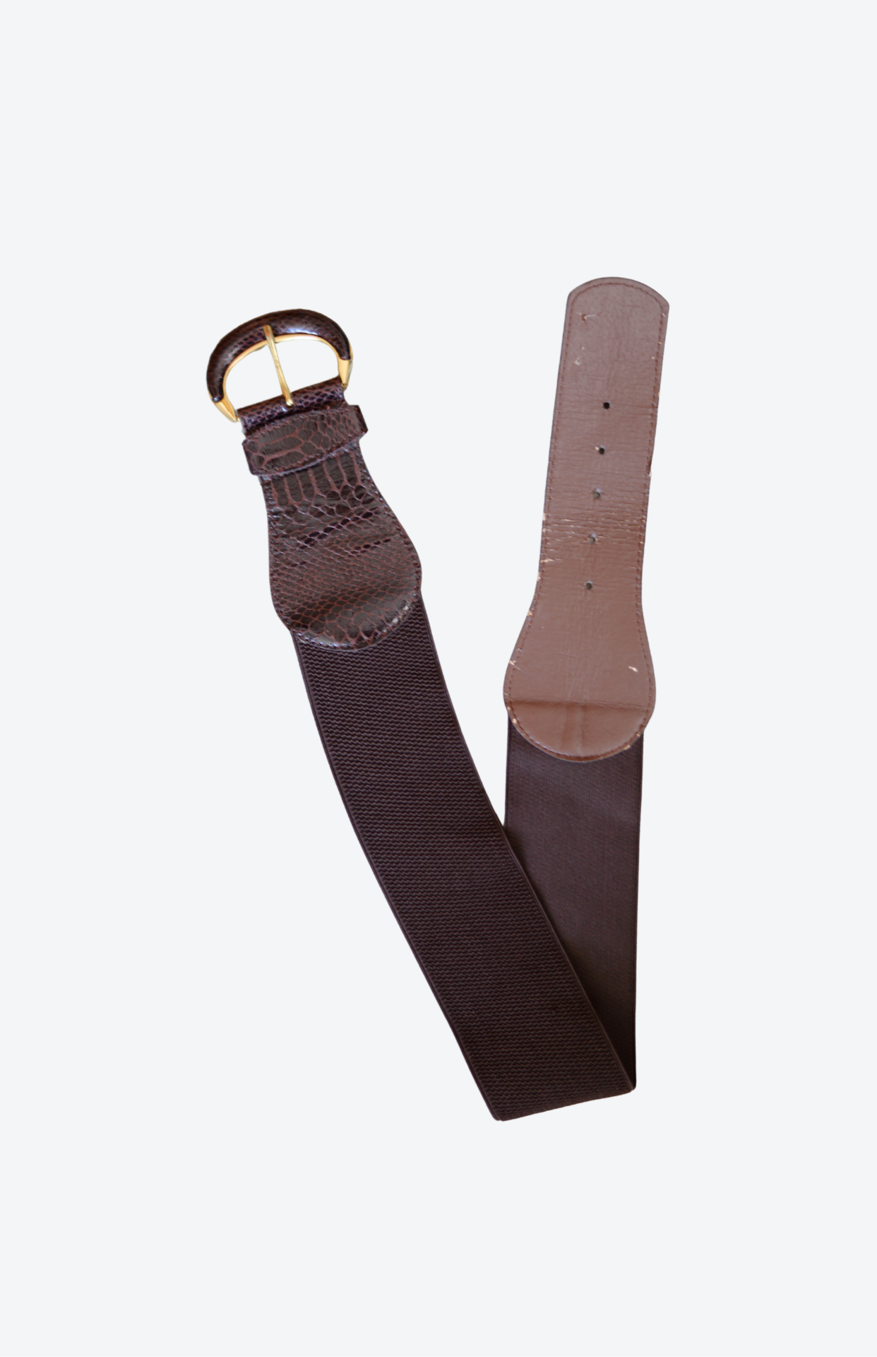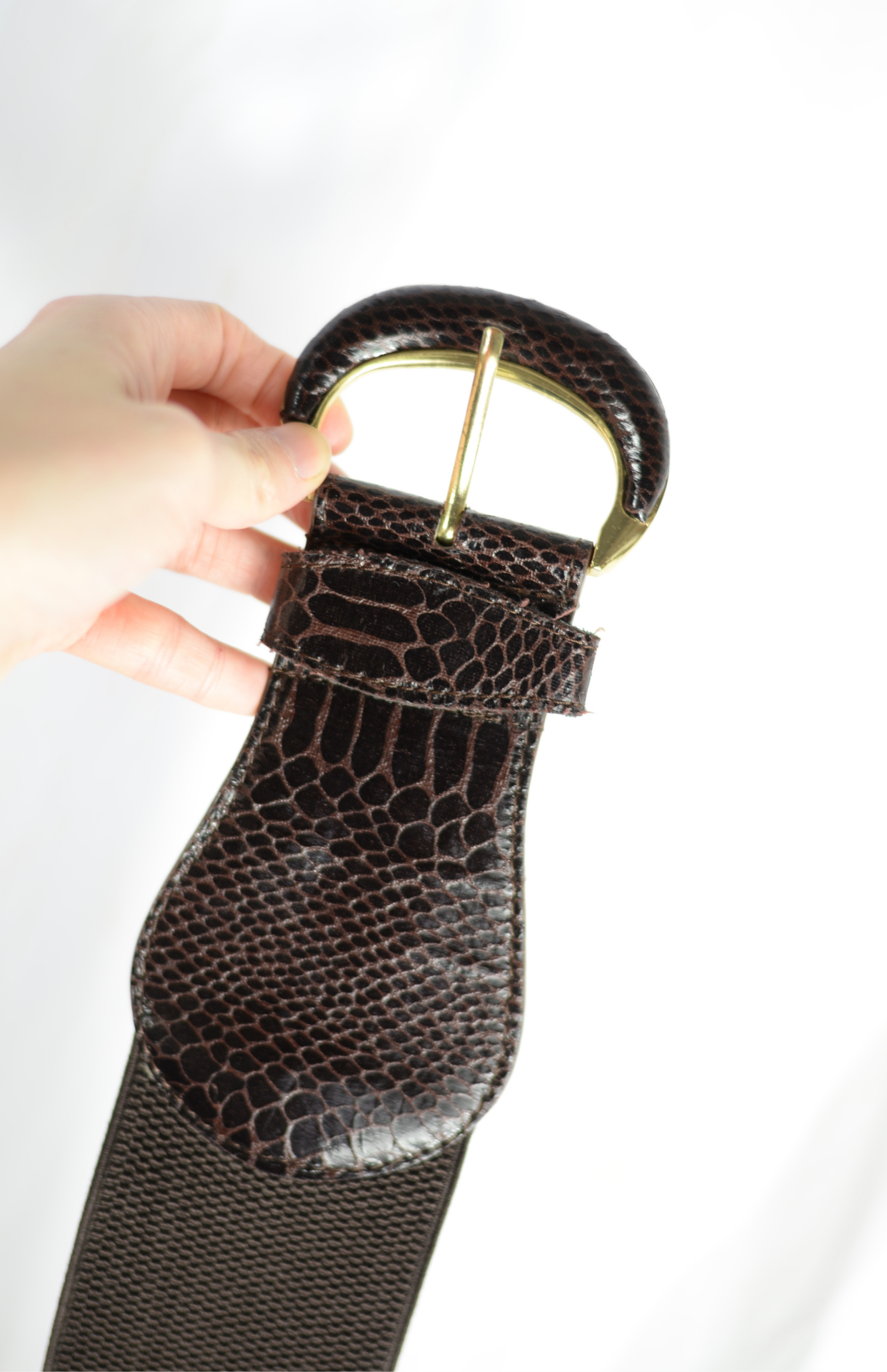 Retro výrazný pásek ala krokodýlí kůže. Má pružný střed a přizpůsobí se velikostněStav: Ve skvělém stavu, pouze drobné oděrky na vnitřní části - při nošení skryté.Materiál: lakovaná koženka
