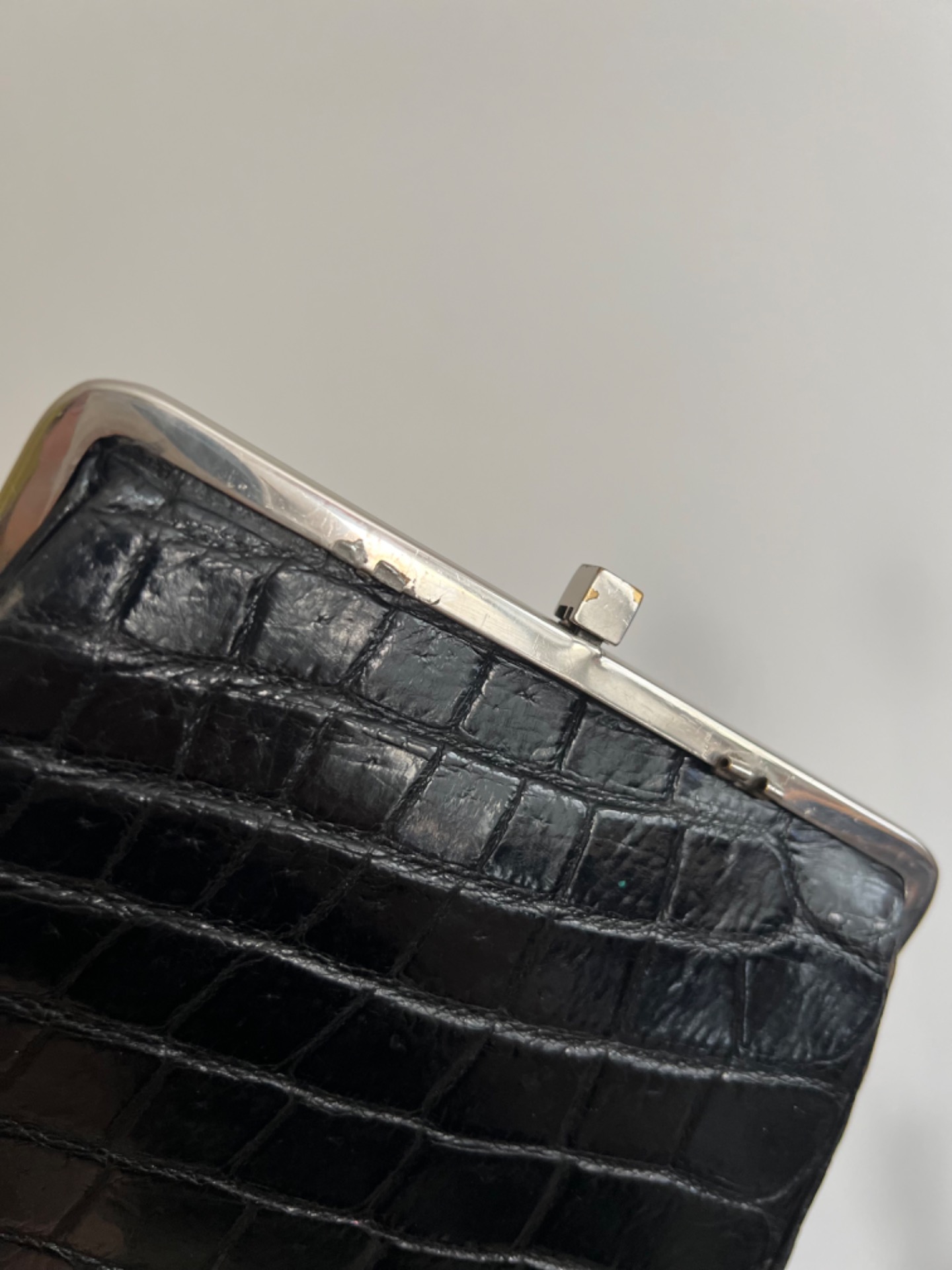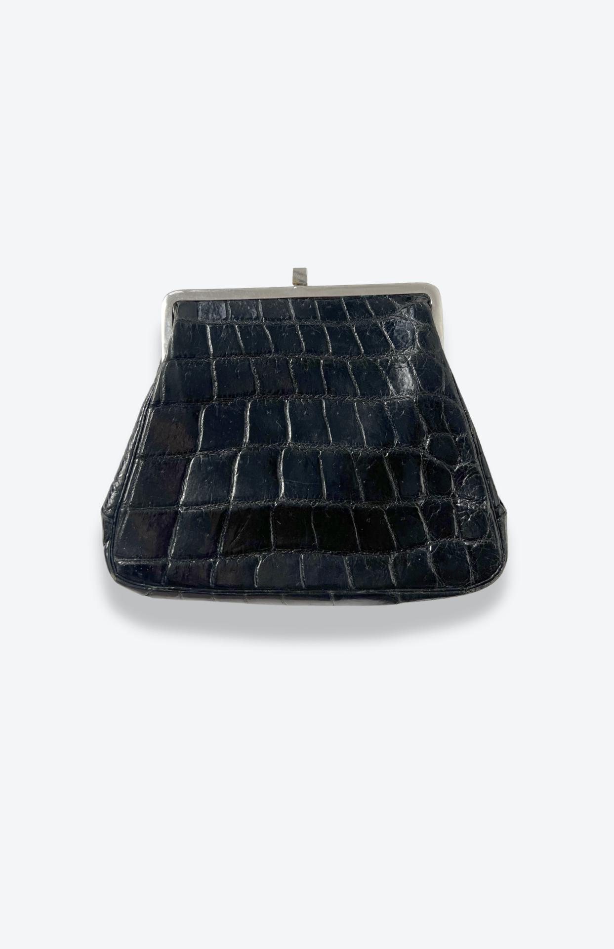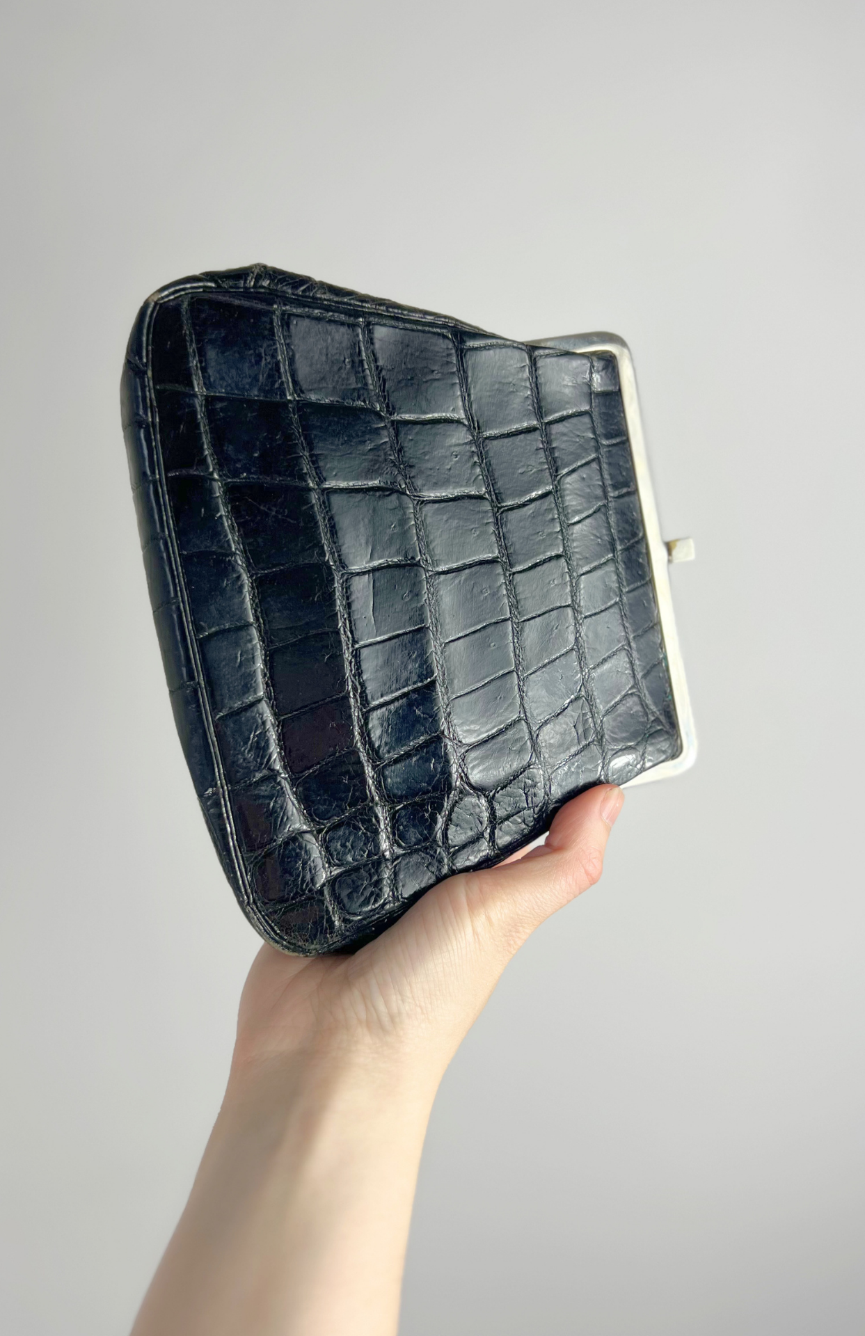 Retro psaníčko do ruky ala lakovaná krokodýlí kůže. Stříbrné kovové detaily, uvnitř kapsa na zip a volná kapsička. Podšívka z broušené kůže. BONUS: malá burgundy peněženka na drobné.
