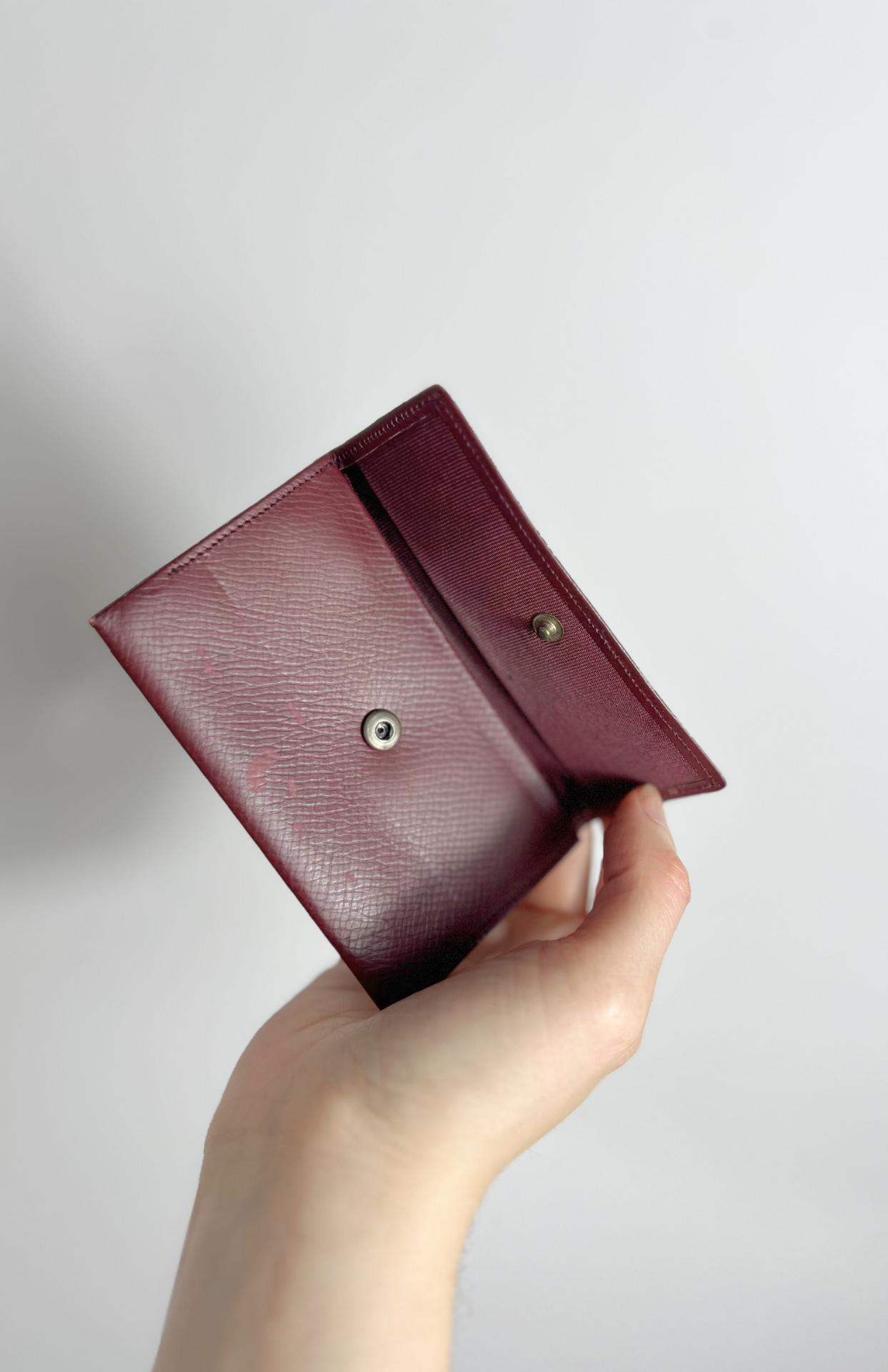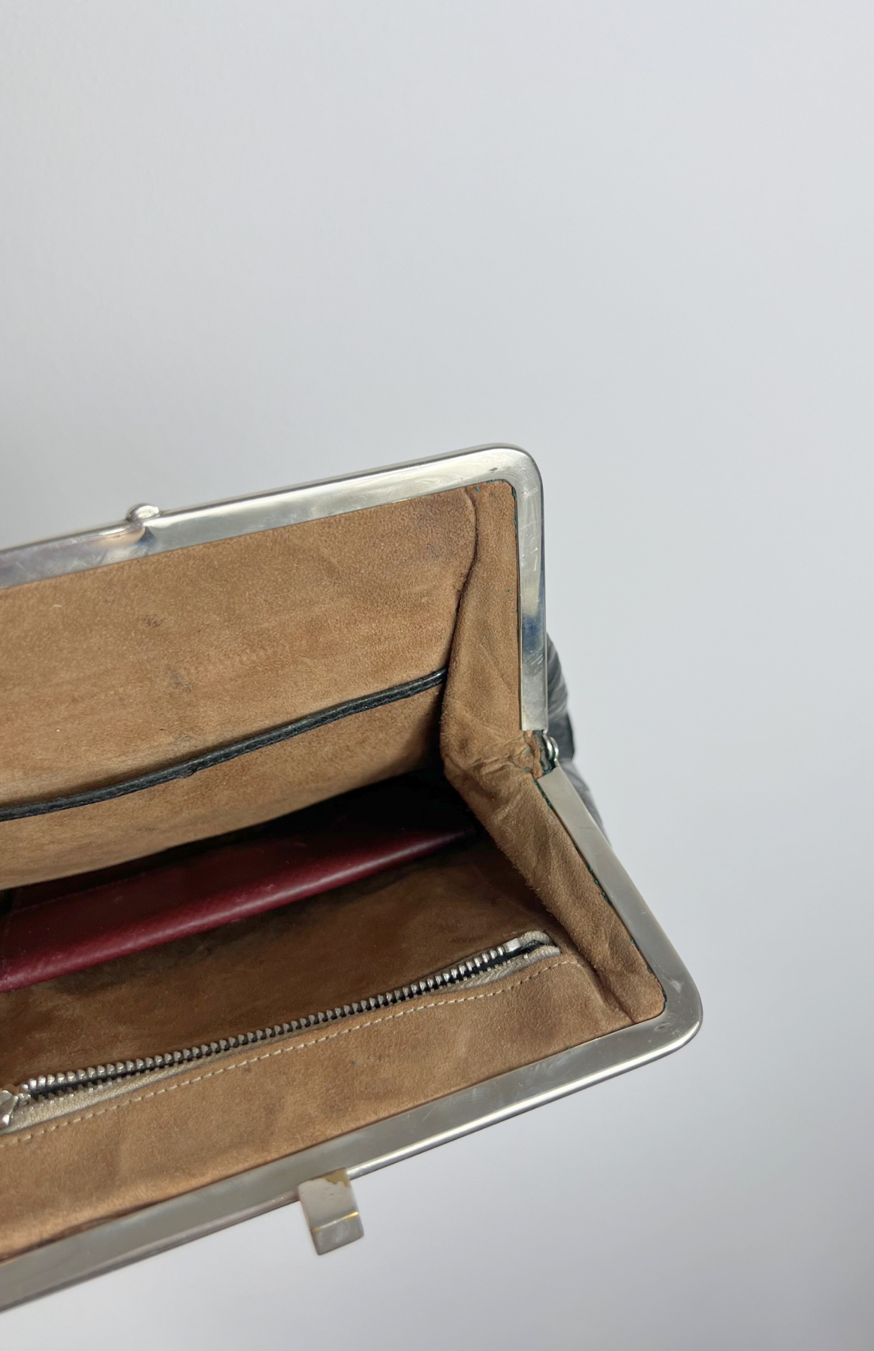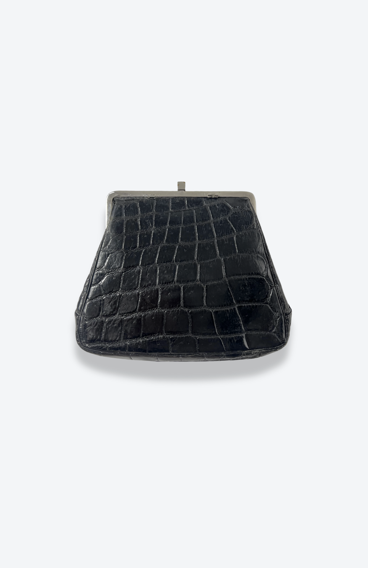 Retro psaníčko do ruky ala lakovaná krokodýlí kůže. Stříbrné kovové detaily, uvnitř kapsa na zip a volná kapsička. Podšívka z broušené kůže. BONUS: malá burgundy peněženka na drobné.