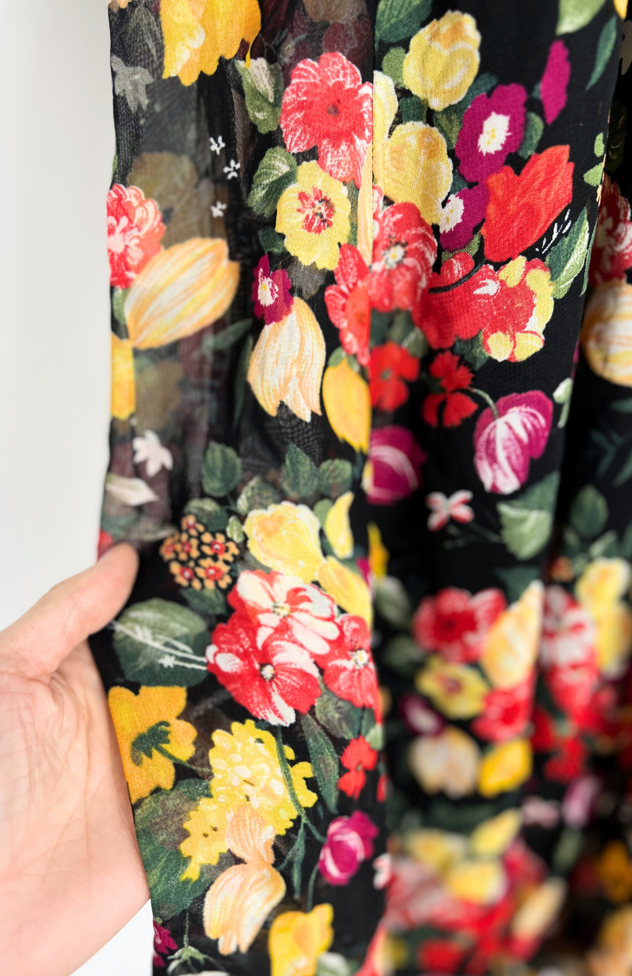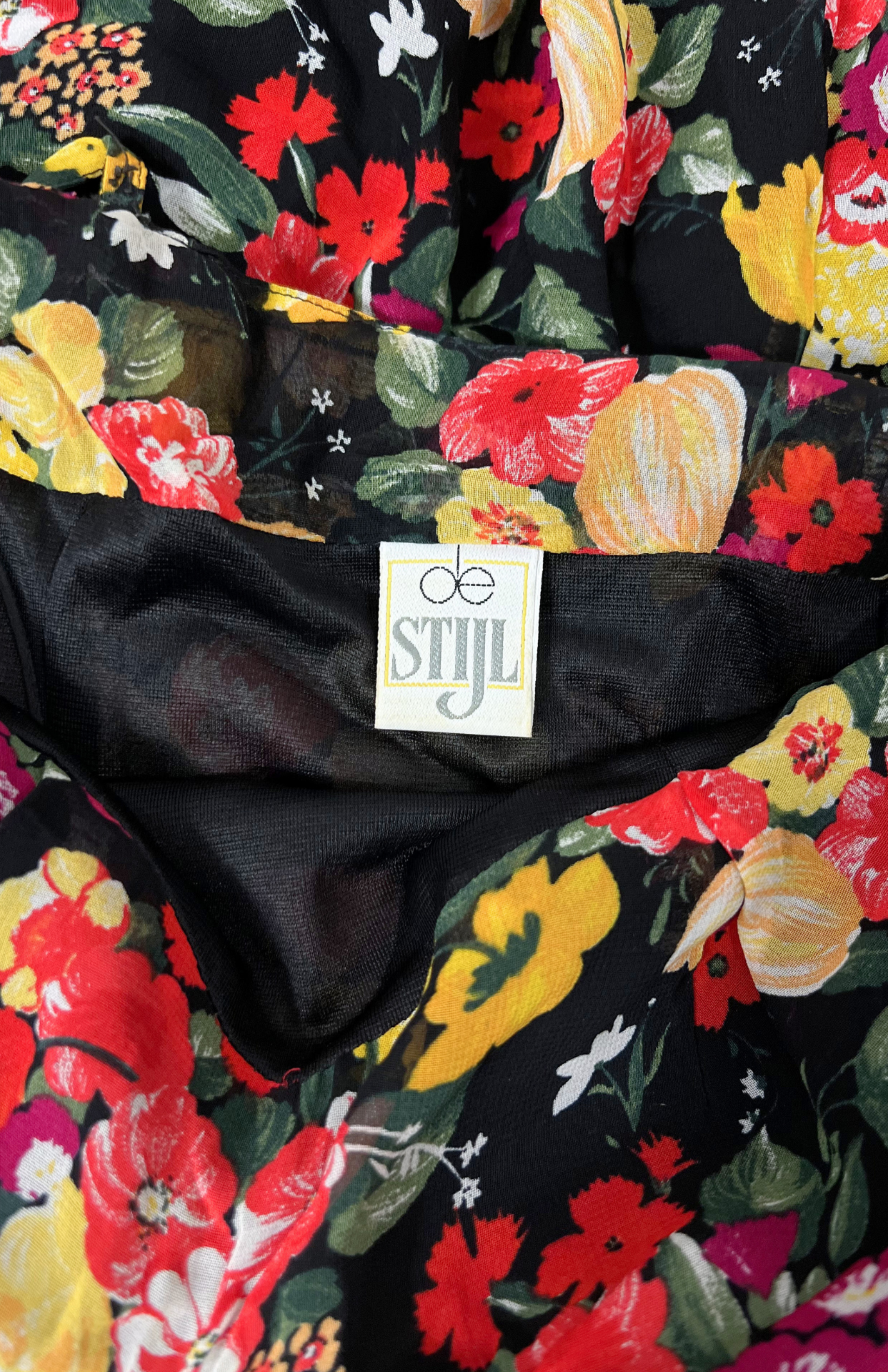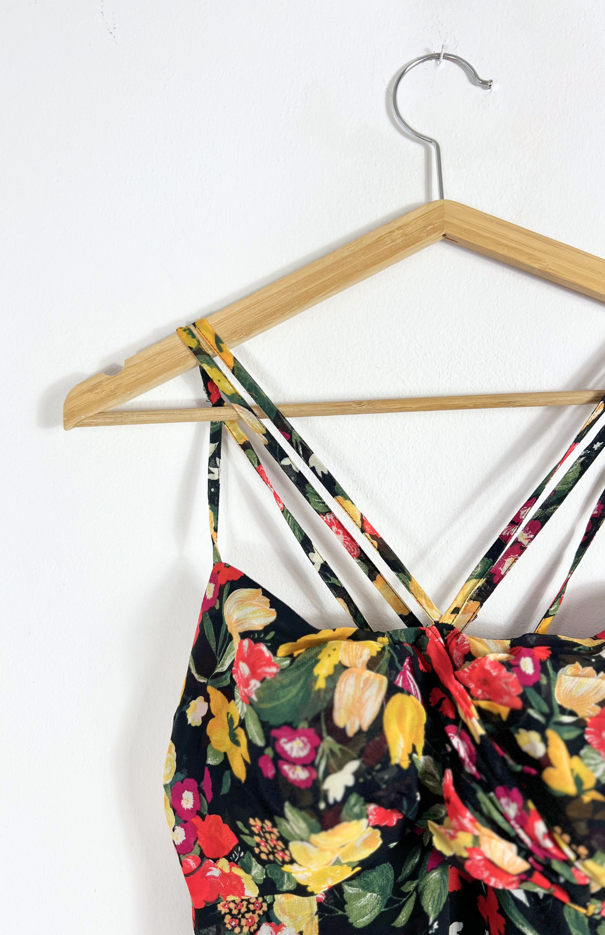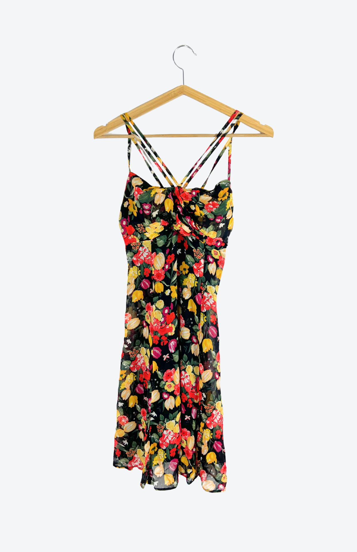 Retro květinové šaty. mají tenká překřížená ramínka. Mají krásný sytě barevný vzor. Na prsou s lehkou "podprsenkou".