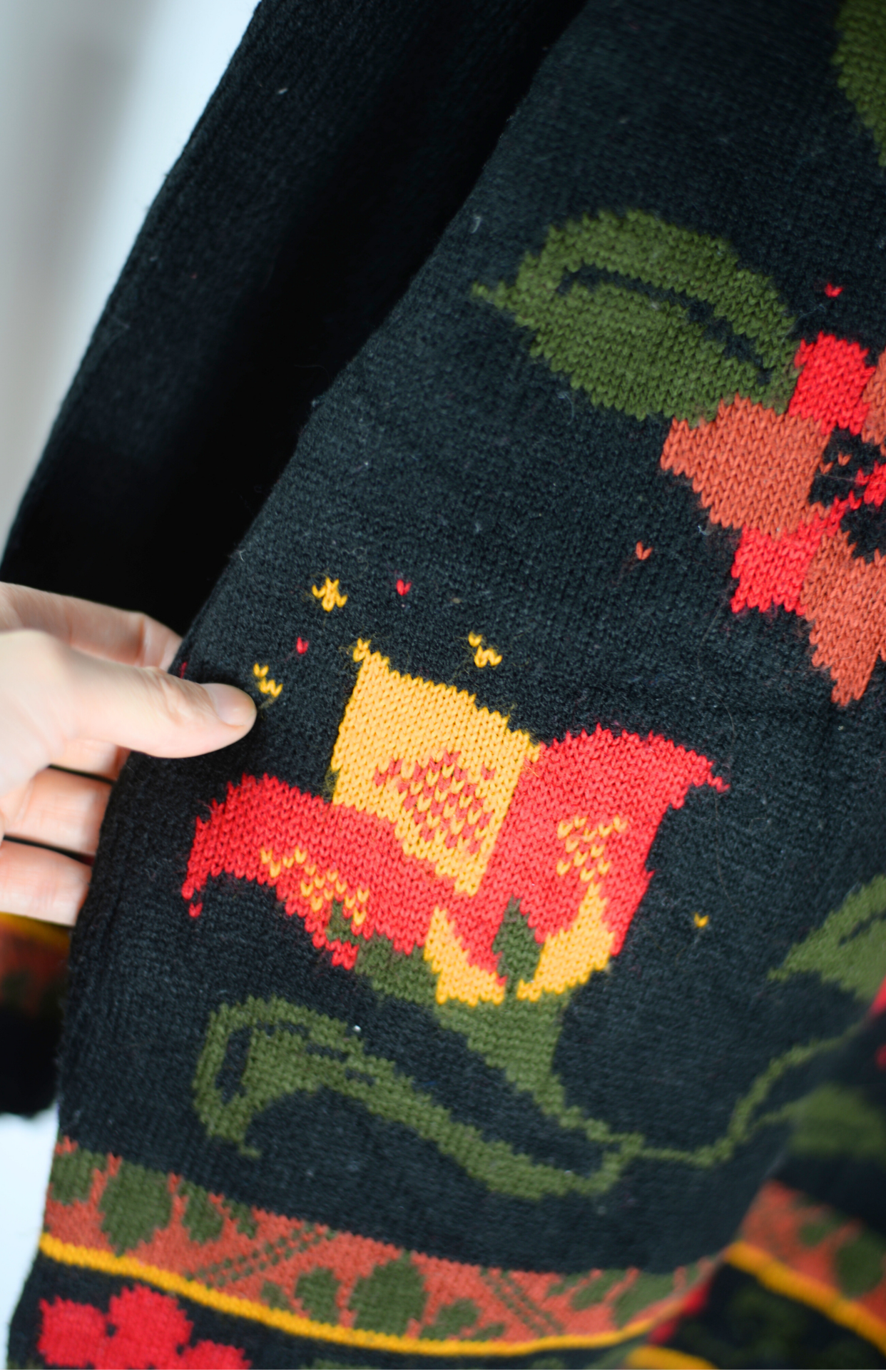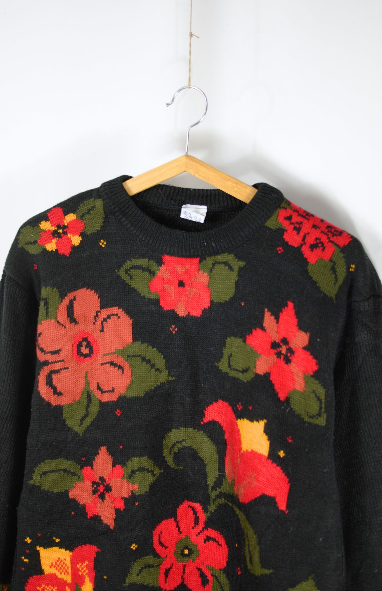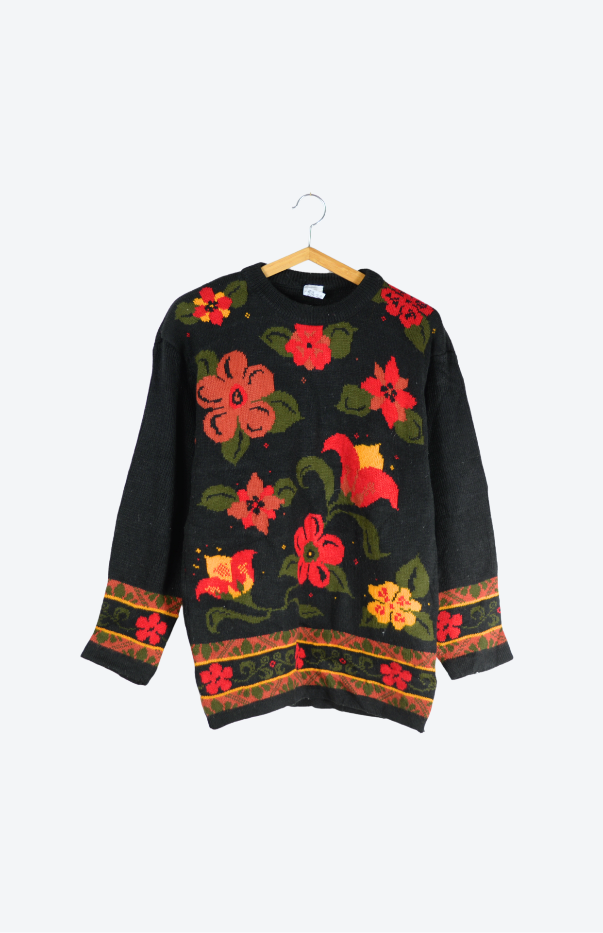 Vintage svetr s květinovým vzorem. Středně silný úplet a lehce nabíraný rukáv.