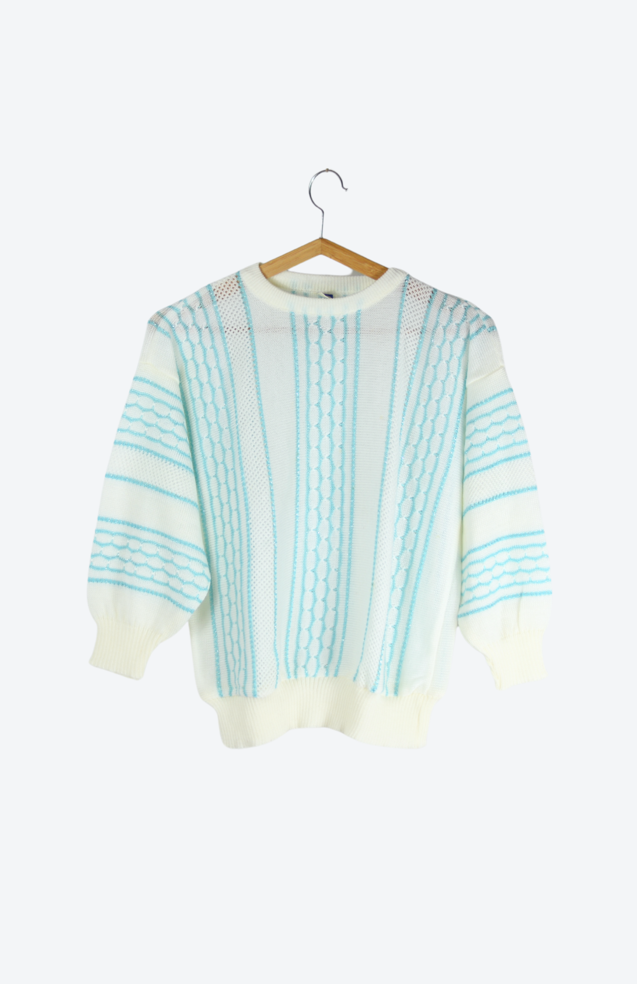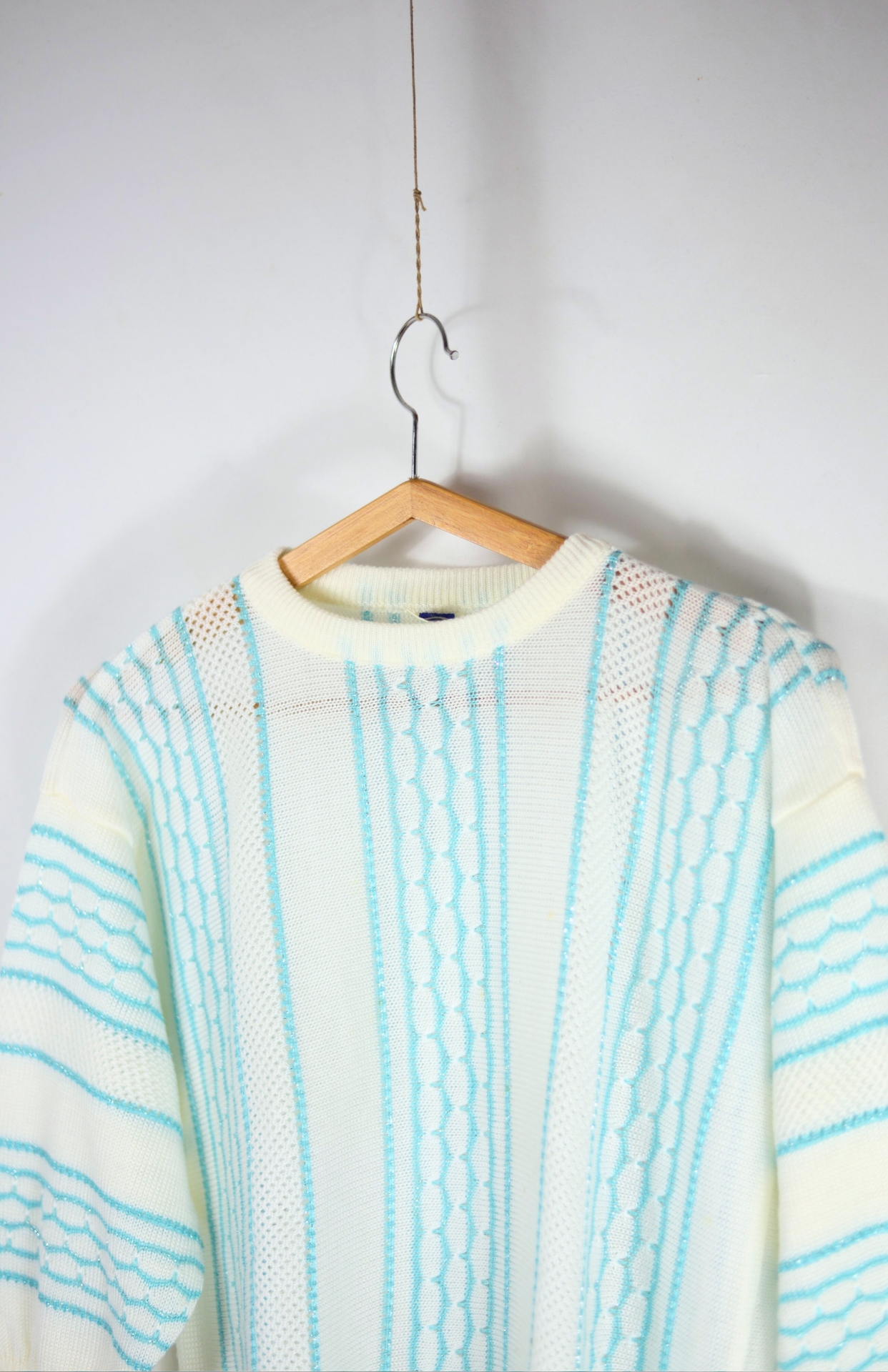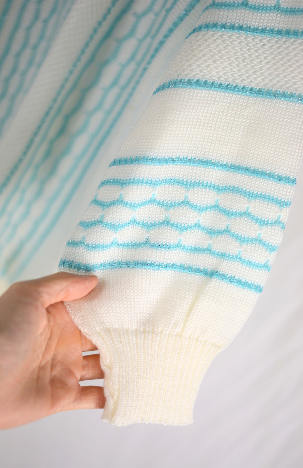 Retro lehký svetr s tenkými třpytivými proužky. Má nabírané rukávy a 80´ střih.Stav: Vintage kousek v perfektním stavu, bez vad.
