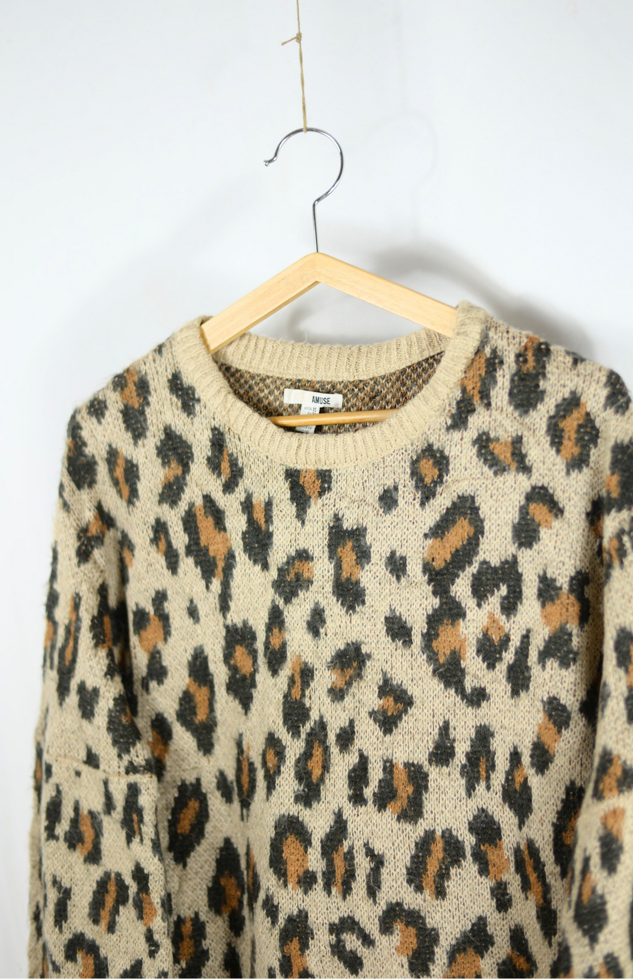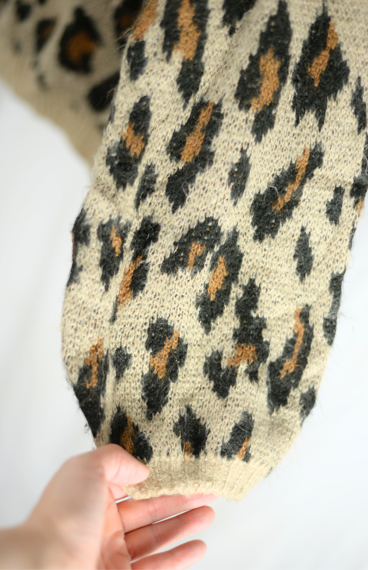 Oversize svetr s funky leopardím vzorem. Má výrazně nabíraný rukáv a středně silný úplet. Hebký naomak.