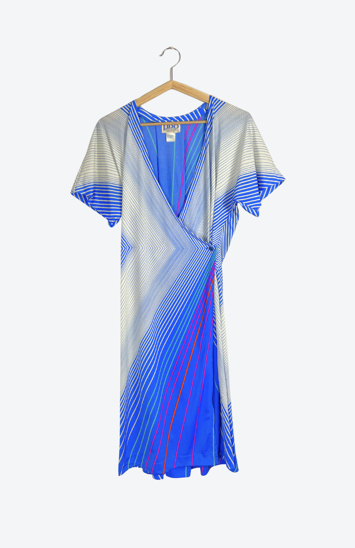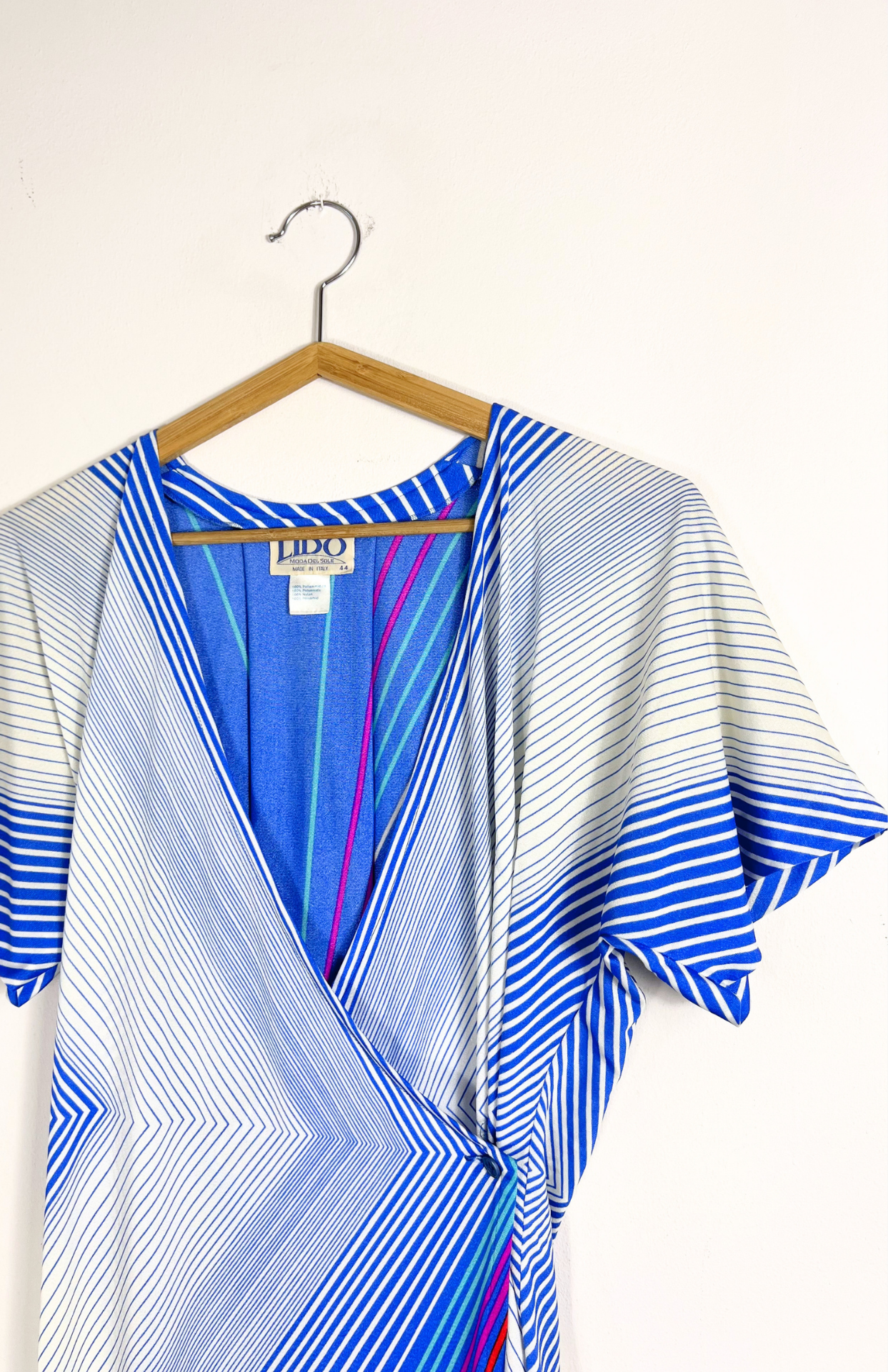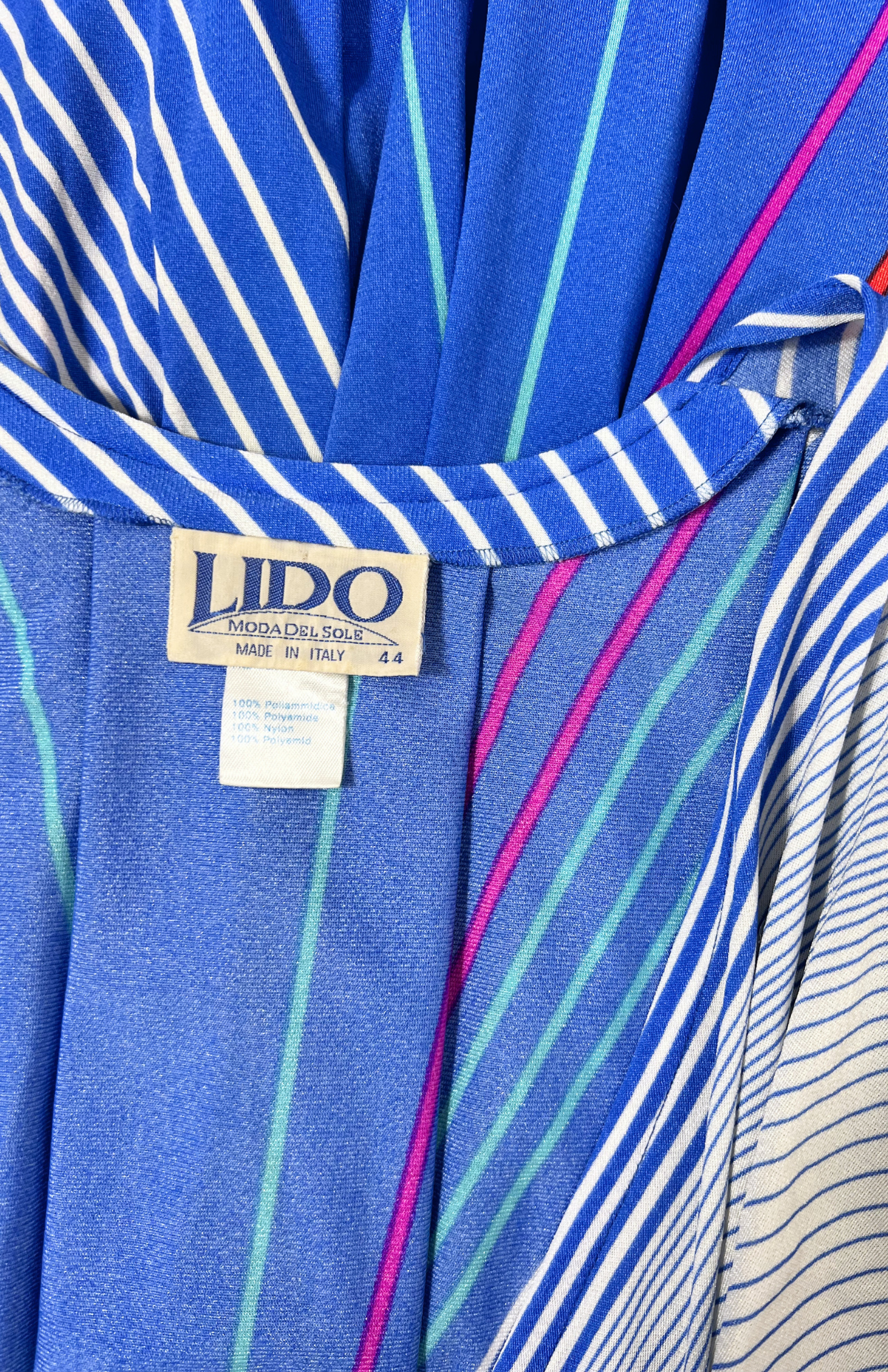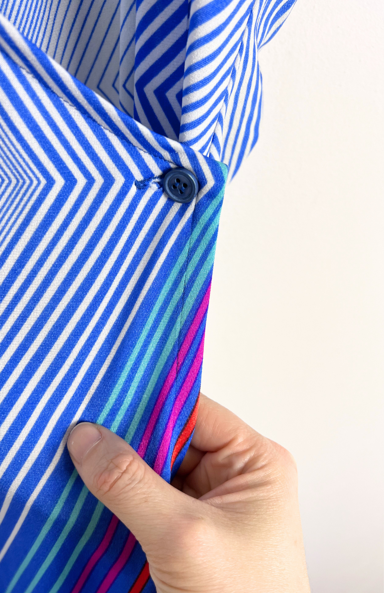 Retro modré šaty s proužky. Geometrické a se zapínání na boční knoflík. Originální retro kousek.