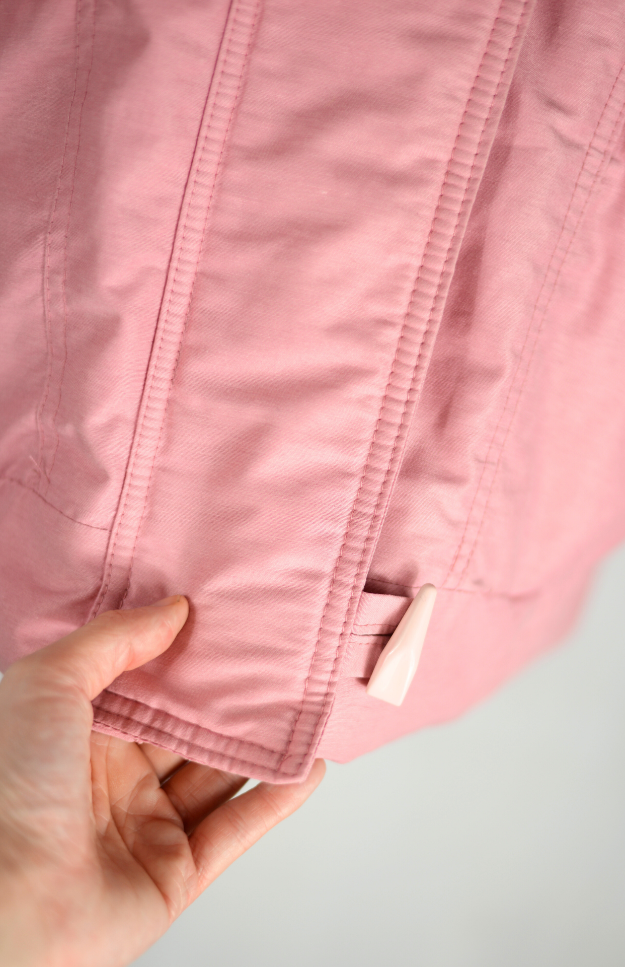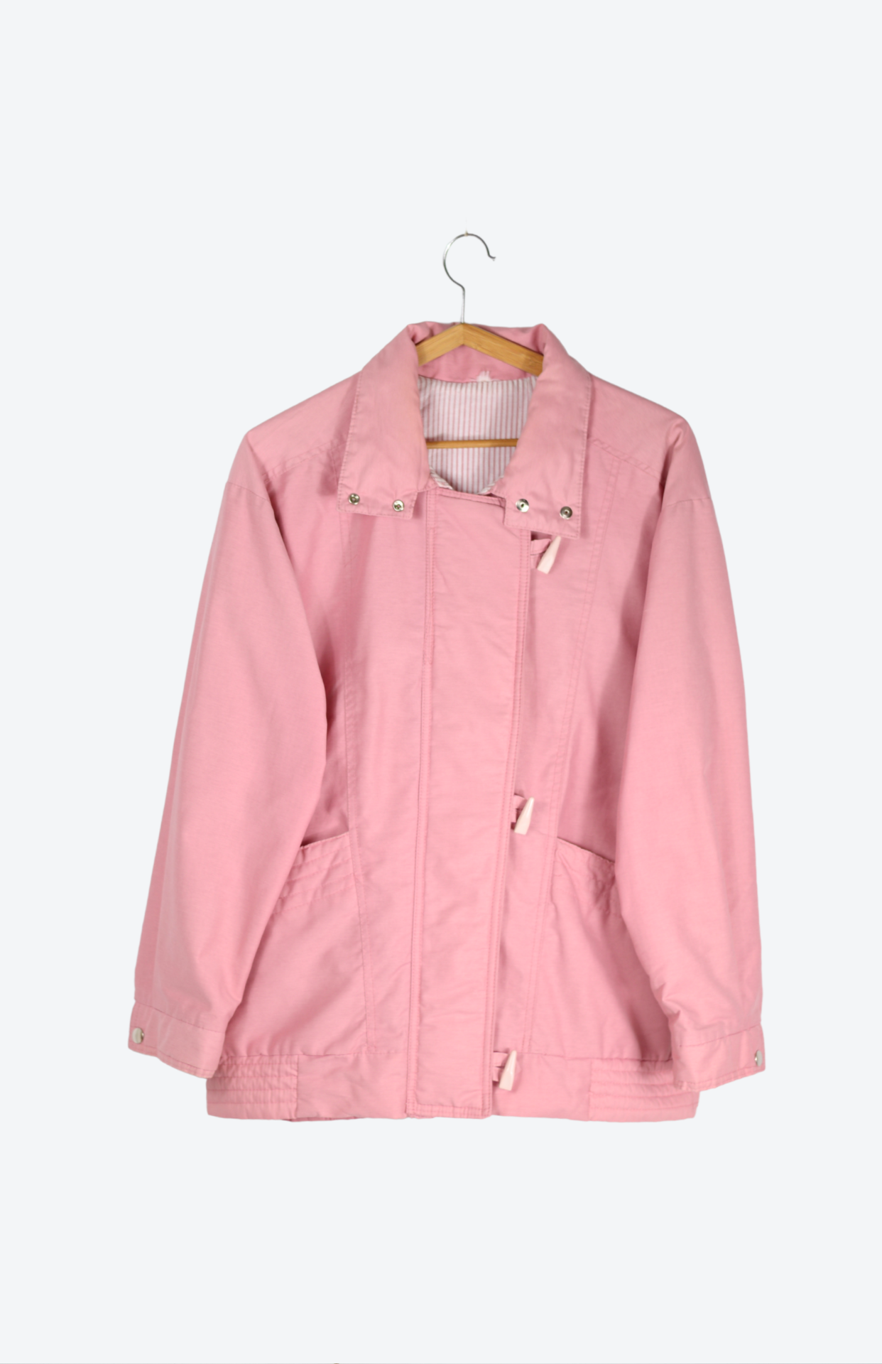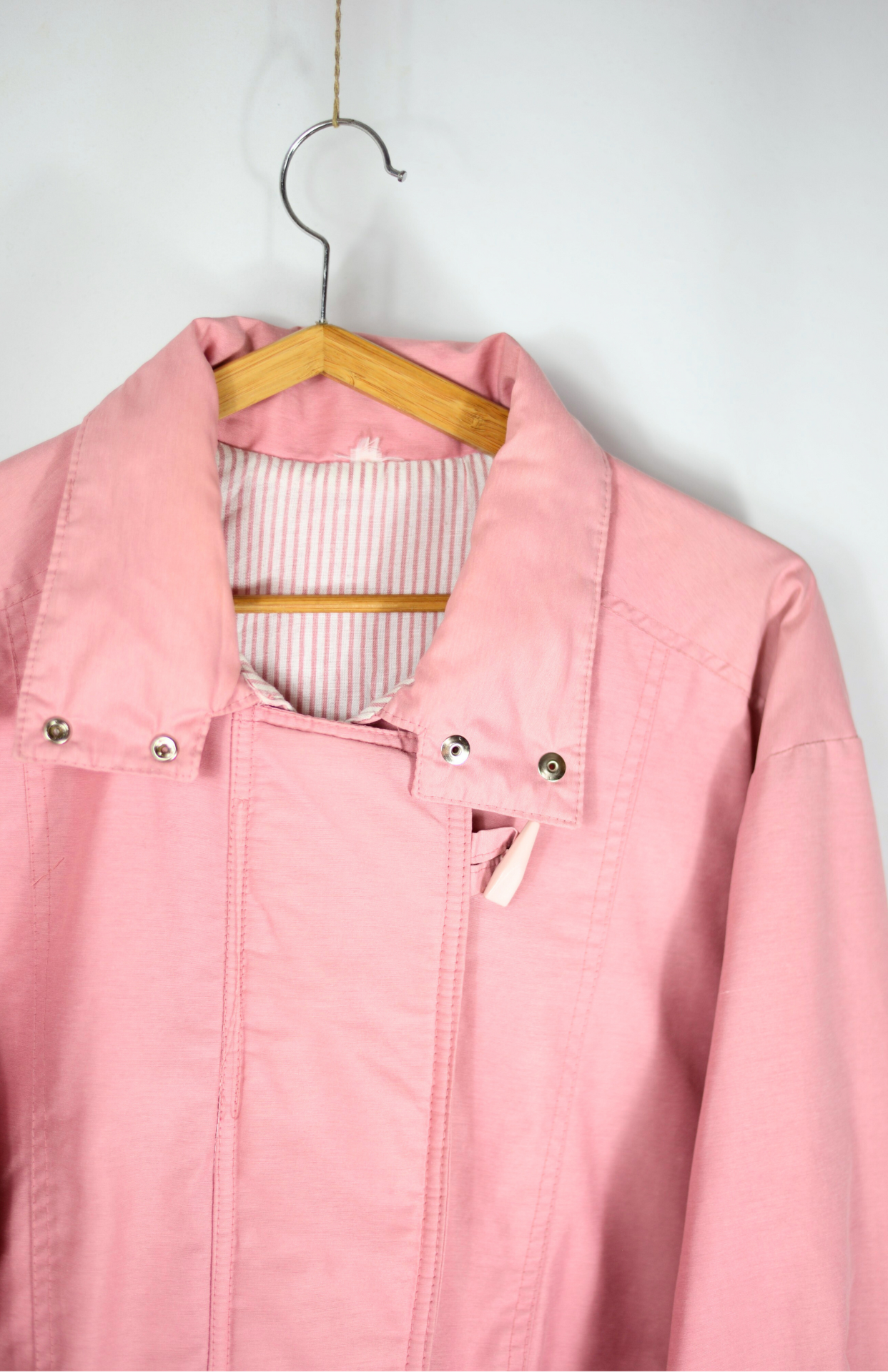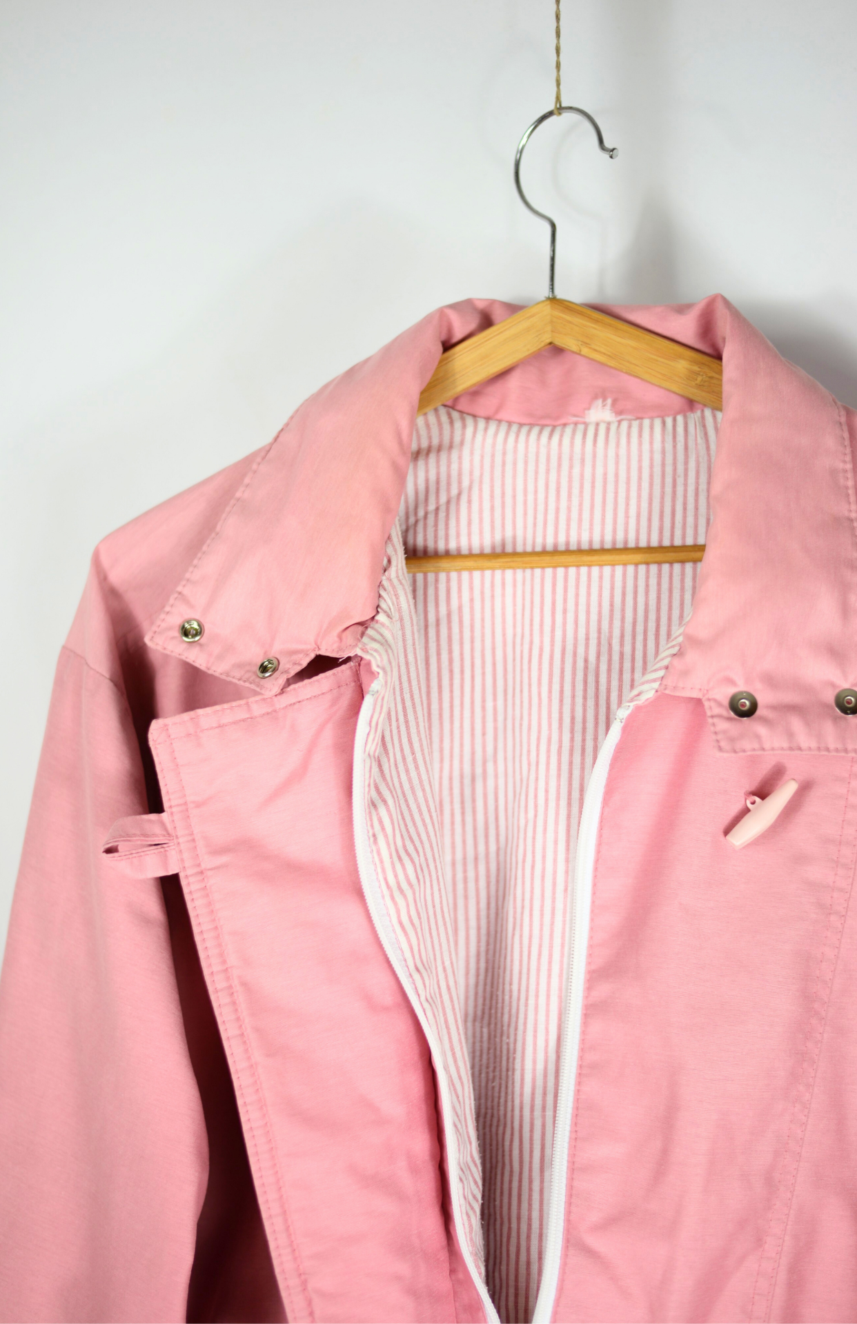 Retro pastelově růžová bunda s límečkem, volného střihu, dole do gumy. Se zapínáním na skrytý zip a průvlekové knoflíky, s kapsami vpředu. Má proužkovanou podšívku.