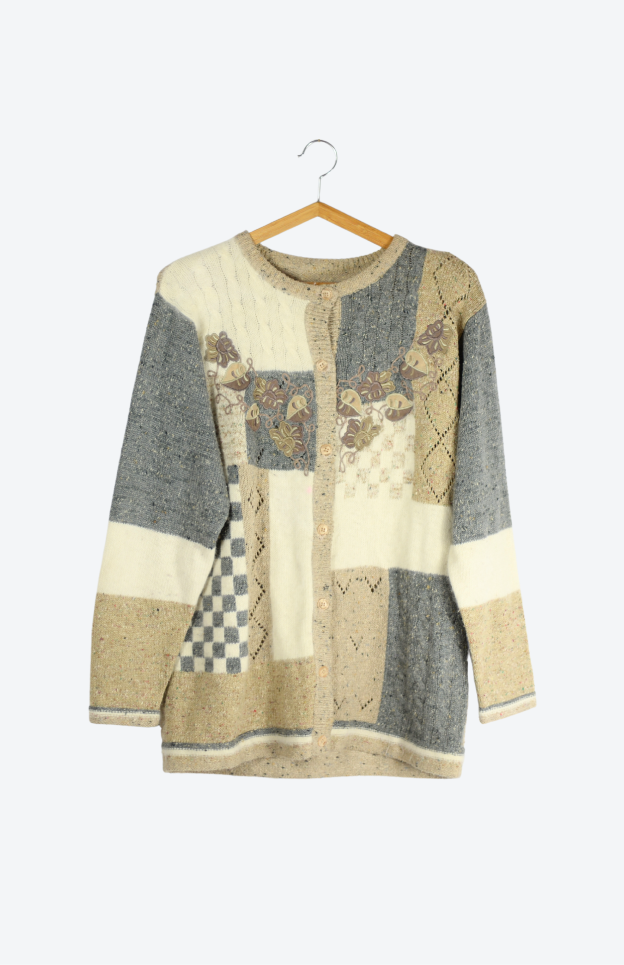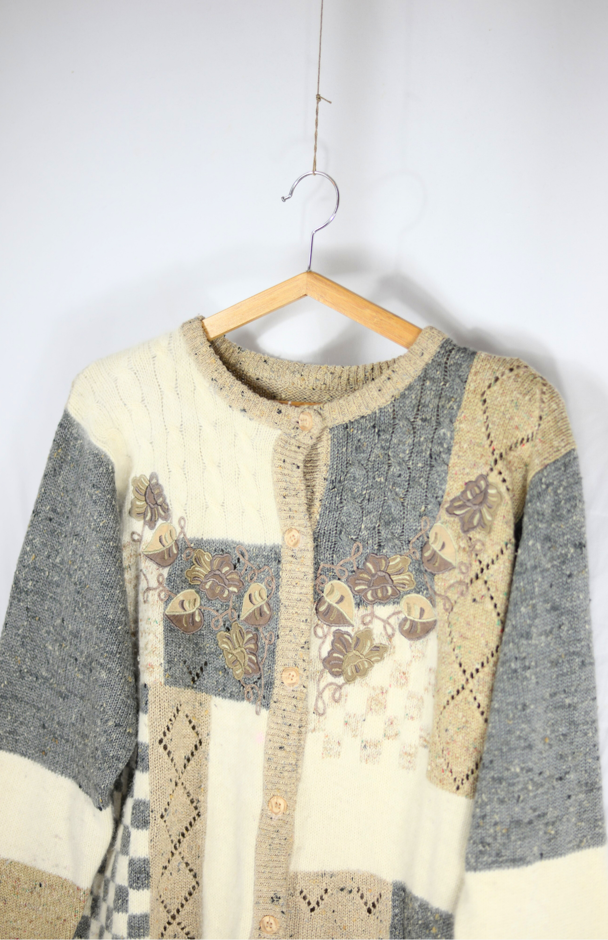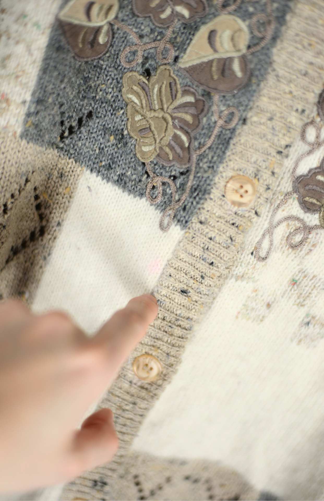 Vintage svetr s patchwork vzorem a vyšívanými květinami. Středně silný úplet a propínání na knoflíčky uprostřed.