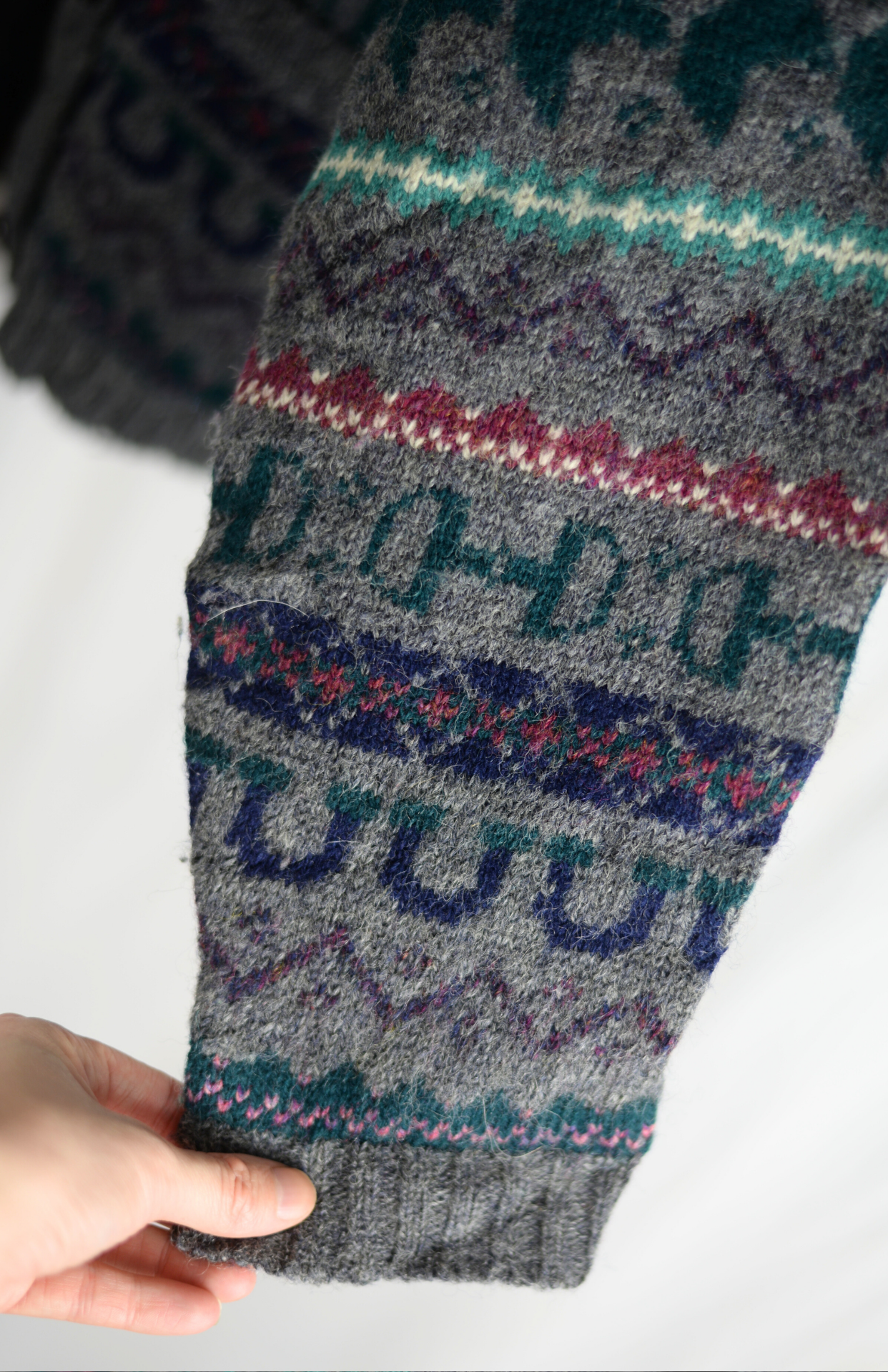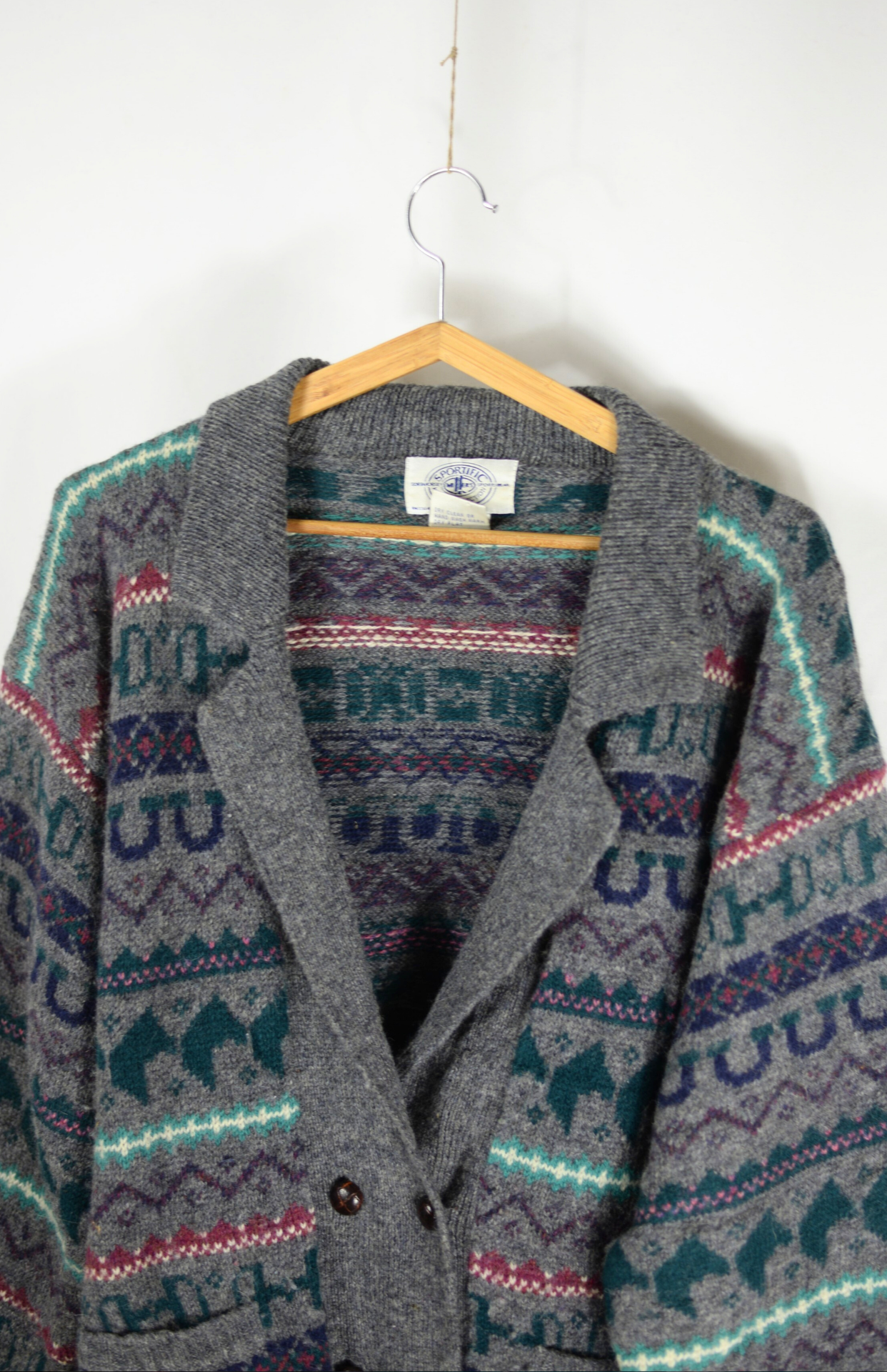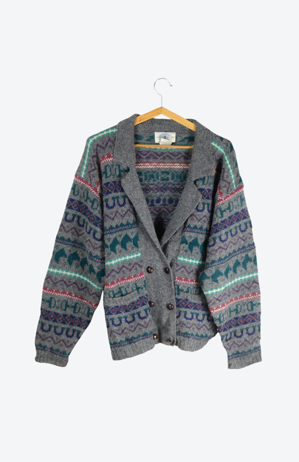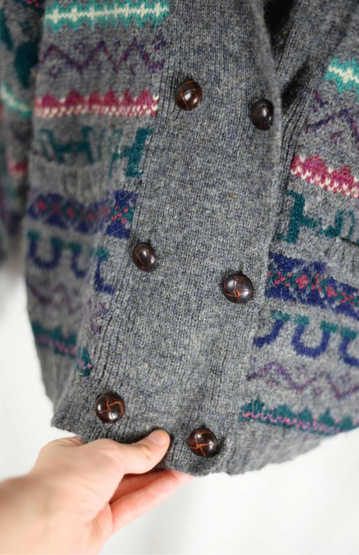 Čistě vlněný propínací svetr se vzorem a límečkem. Má dvě řady knoflíků, volný střih. Středně silný úplet a lehce nabíraný rukáv. Unisex kousek.