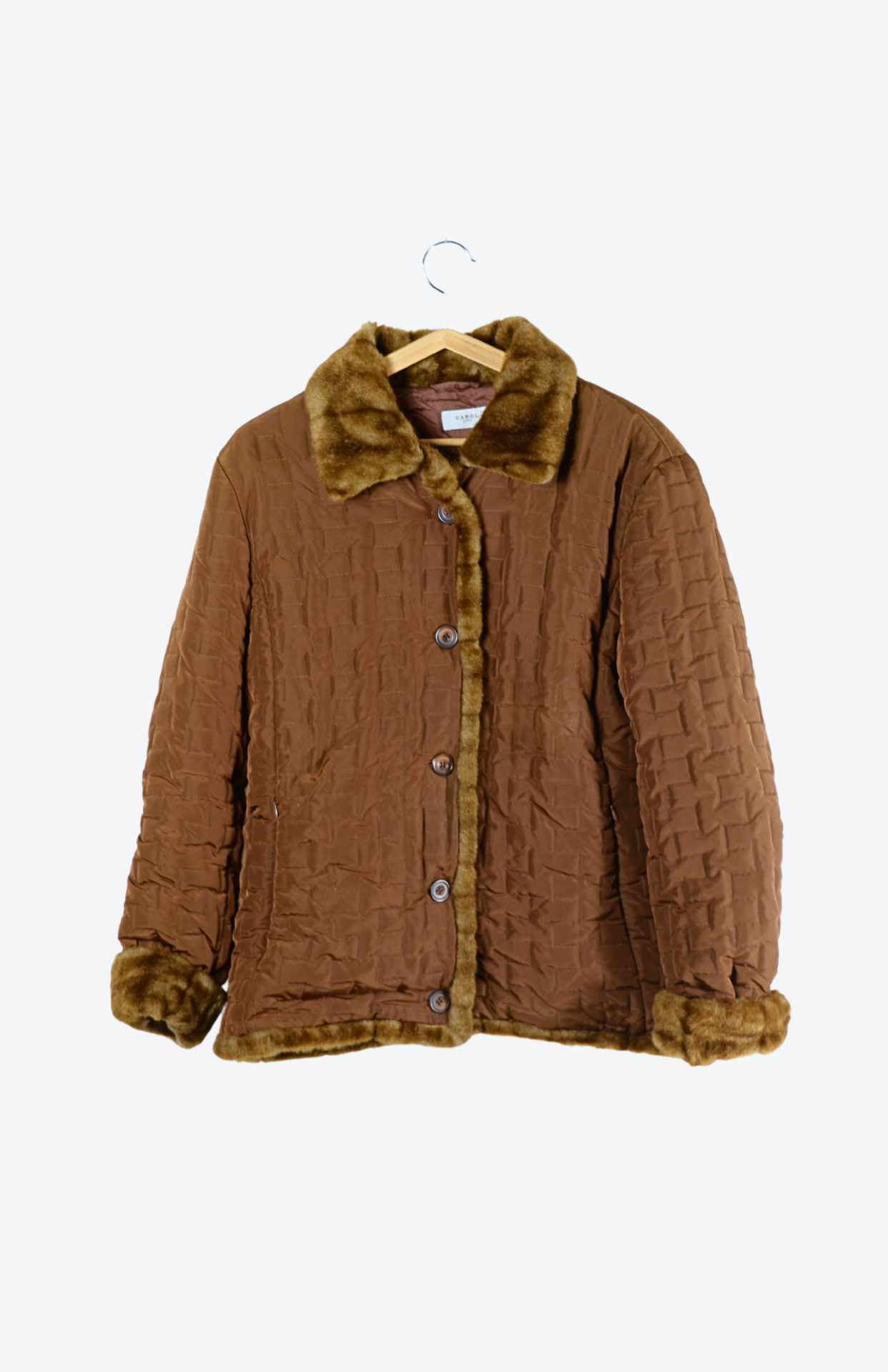 Oříšková prošívaná retro bunda. Lemovaná fake fur kožíškem, s detailem na límečku a koncích rukávů. Má kratší střih a zapínání na knoflíky.