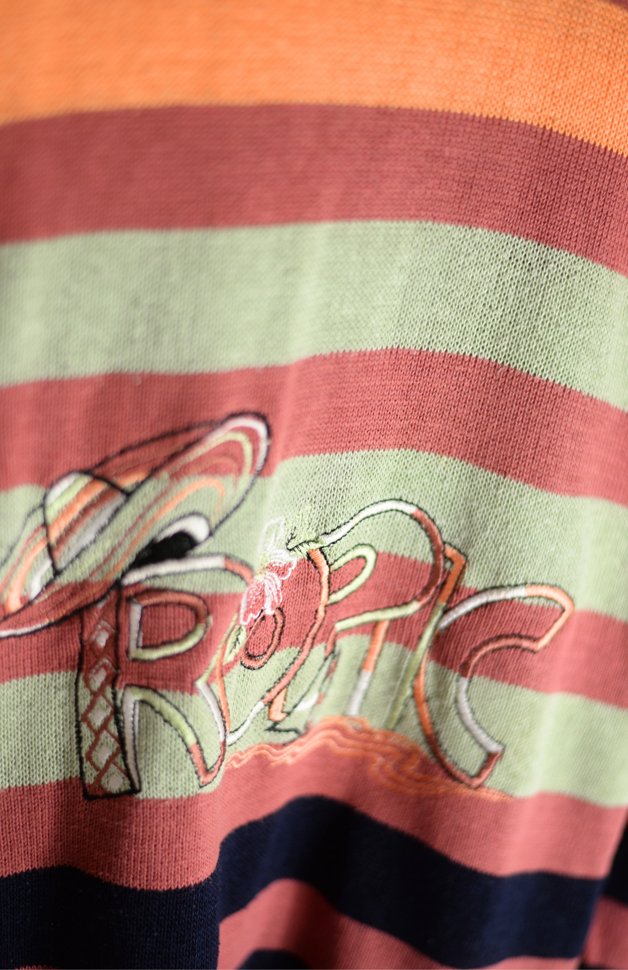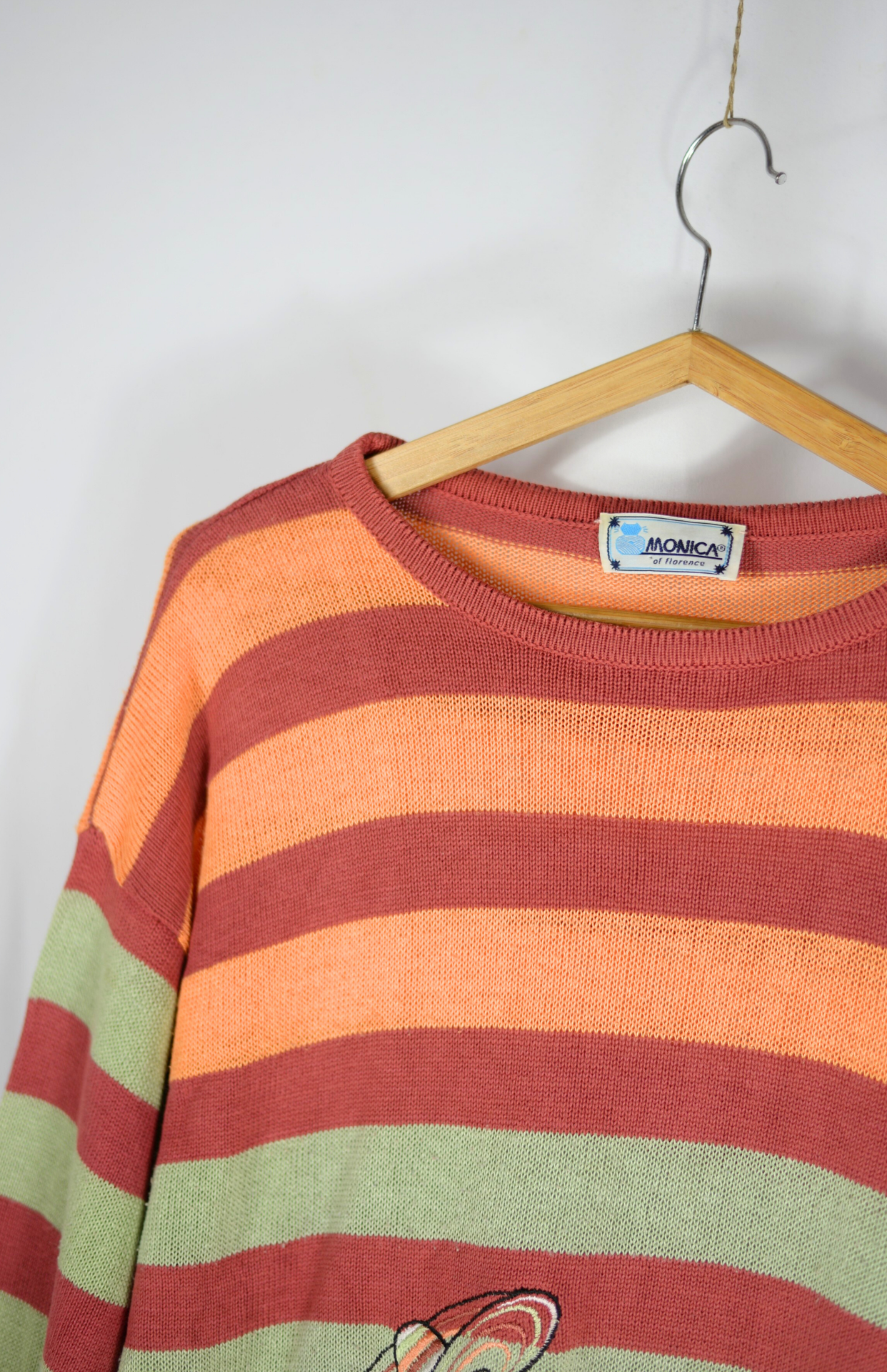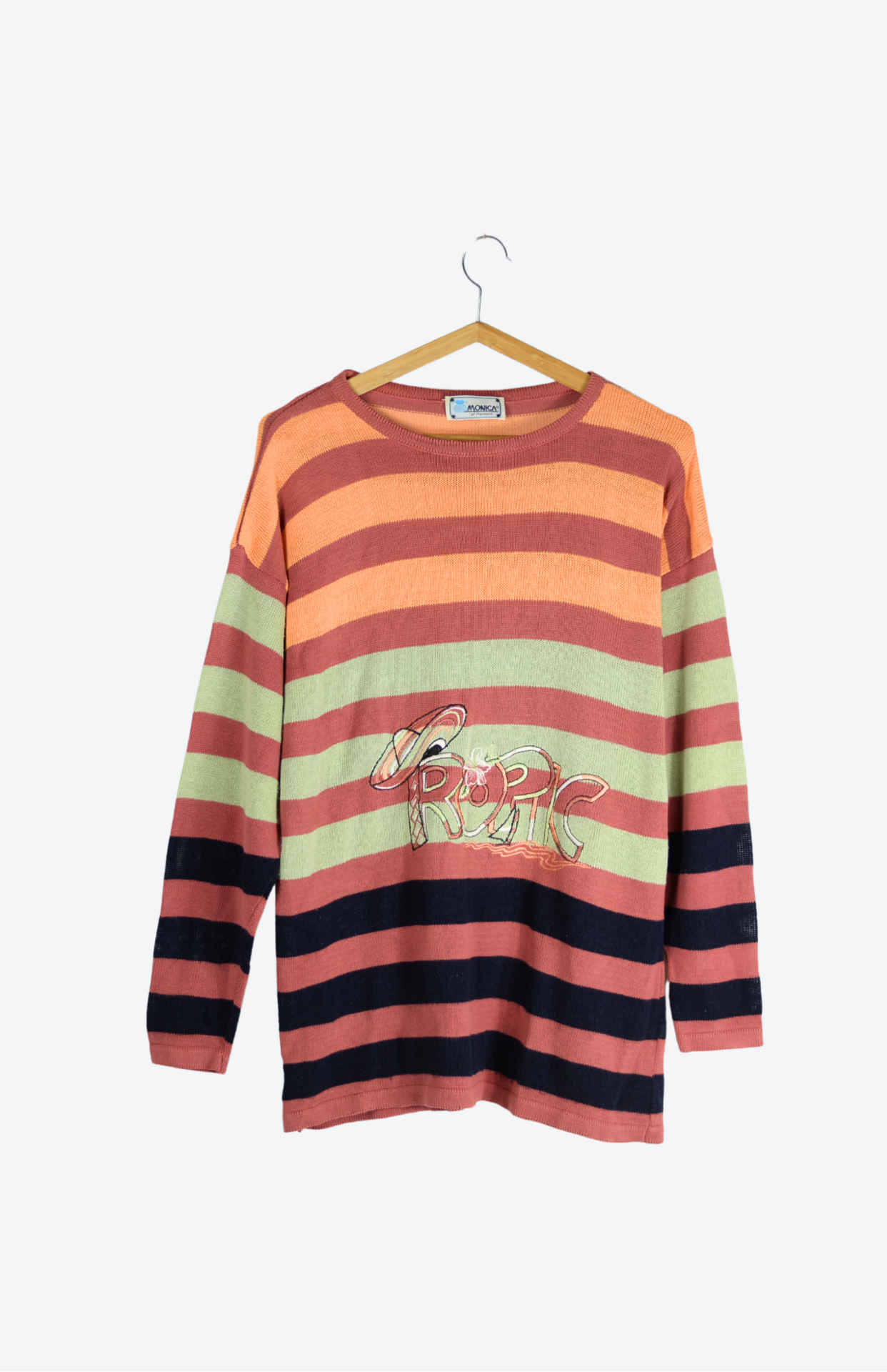 Retro pruhovaný svetr s mexickou výšivkou. Tenčí úplet.Stav: Retro kousek v pěkném stavu, pouze místy žmolečky.