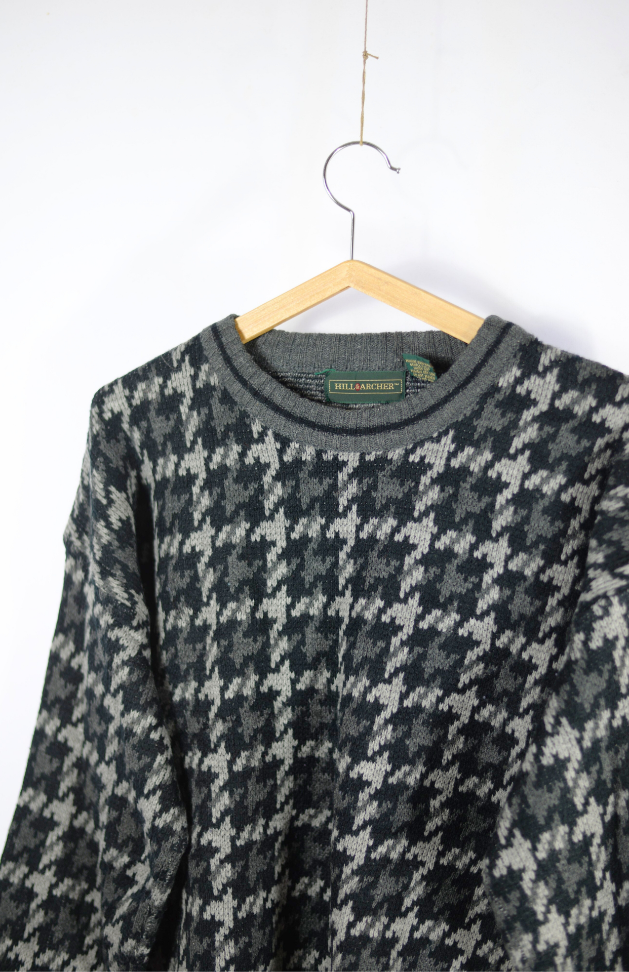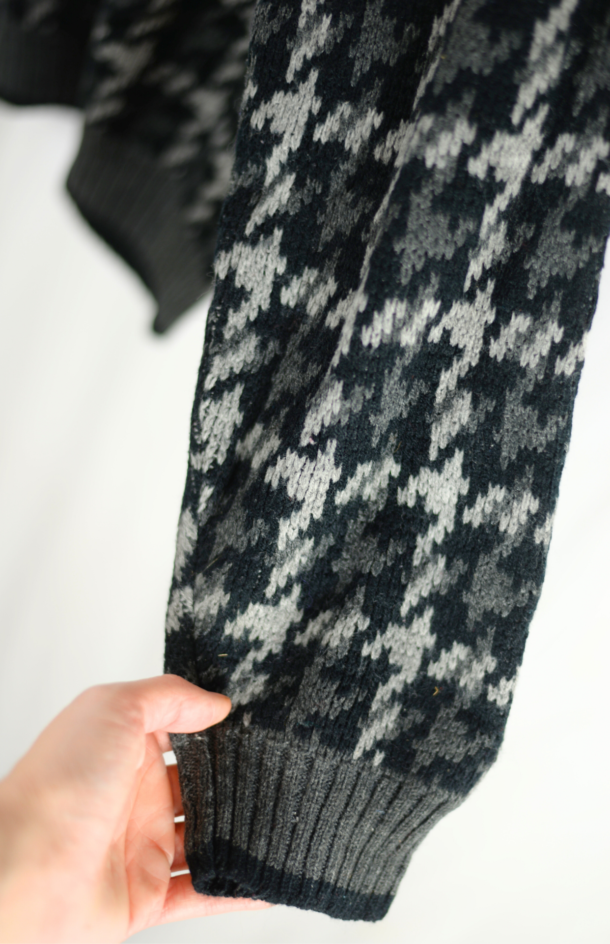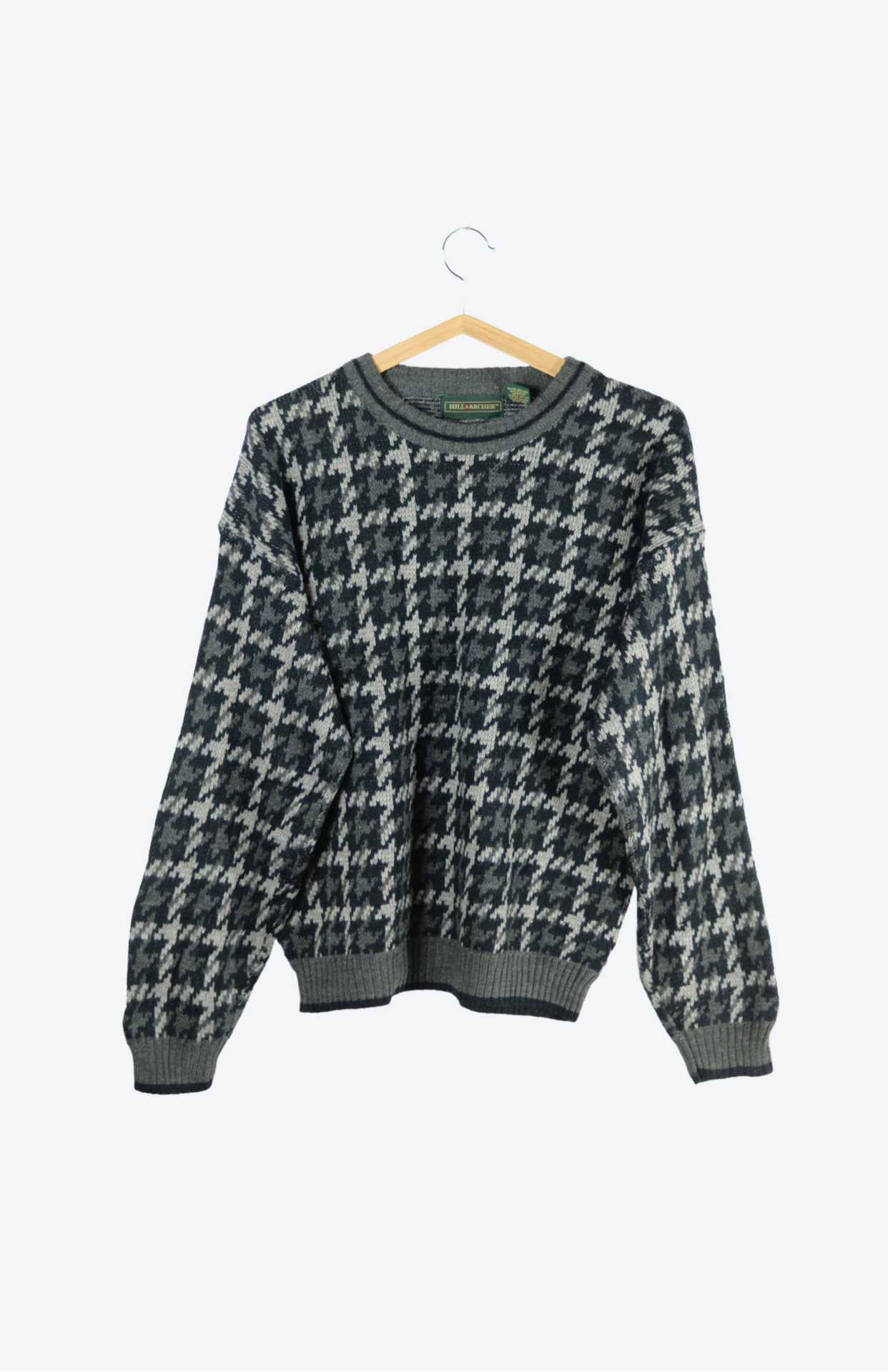 Vintage svetr s funky károvaným vzorem. Proužek okolo lemu. Má lehce nabíraný rukáv, kratší střih a středně silný úplet.