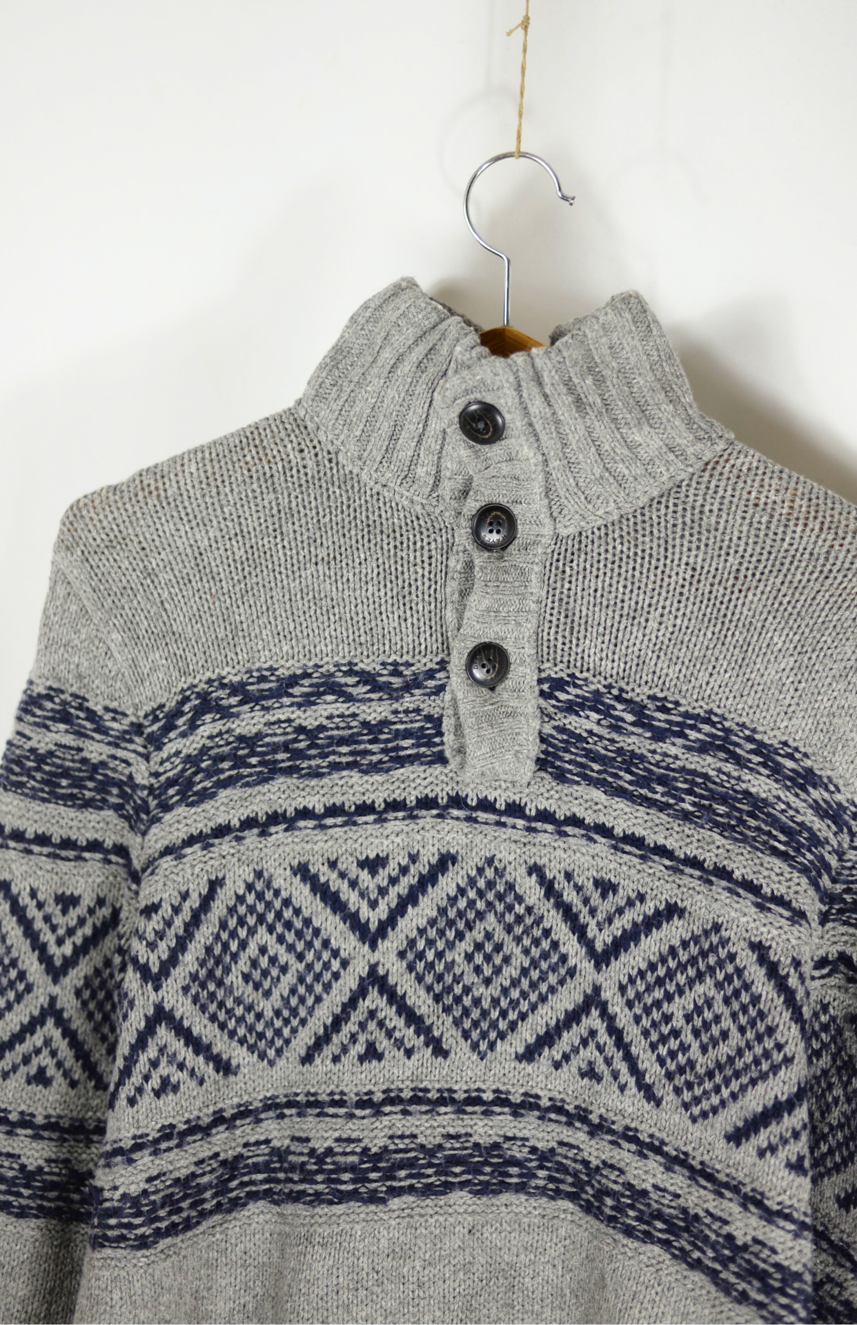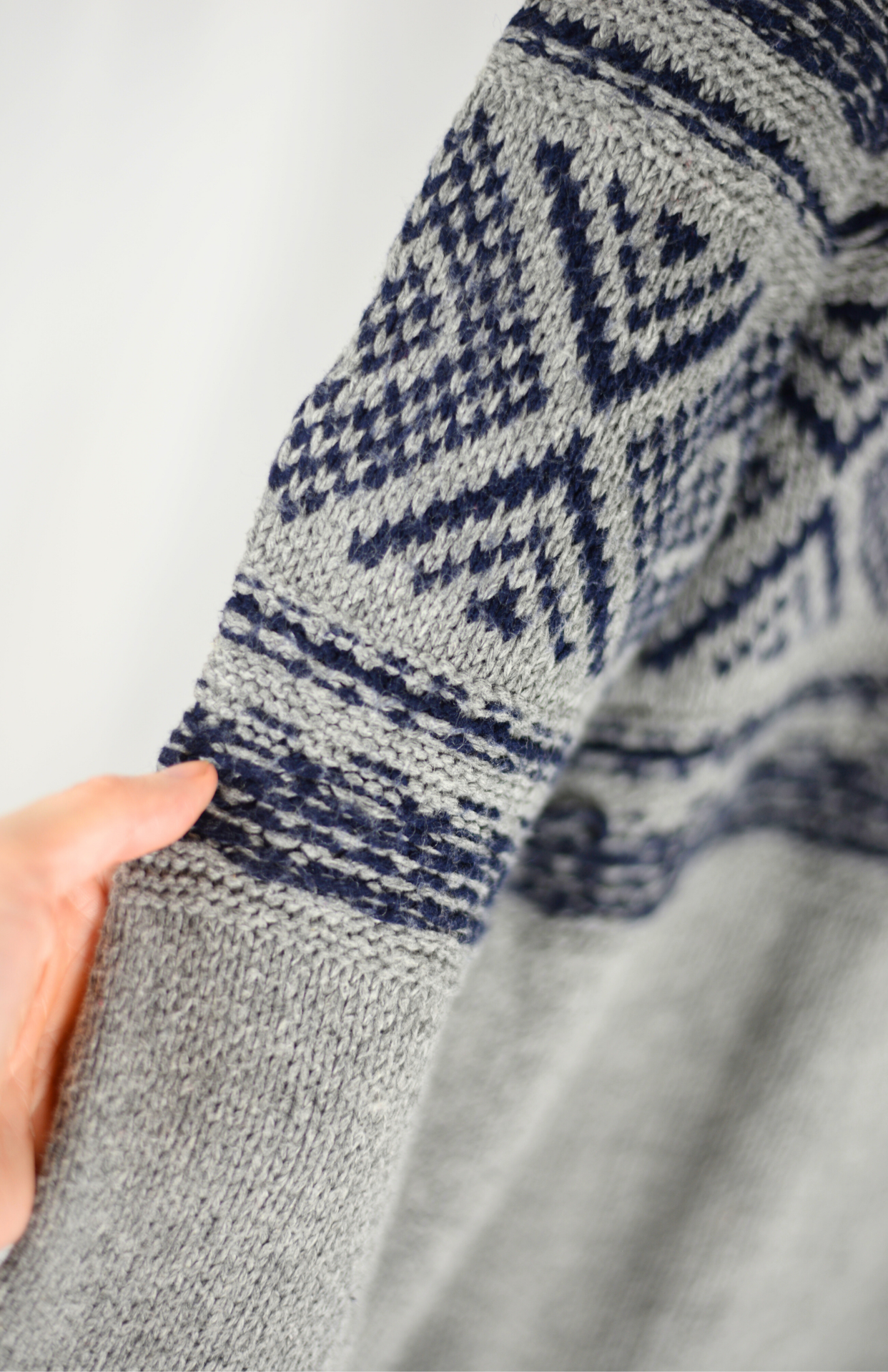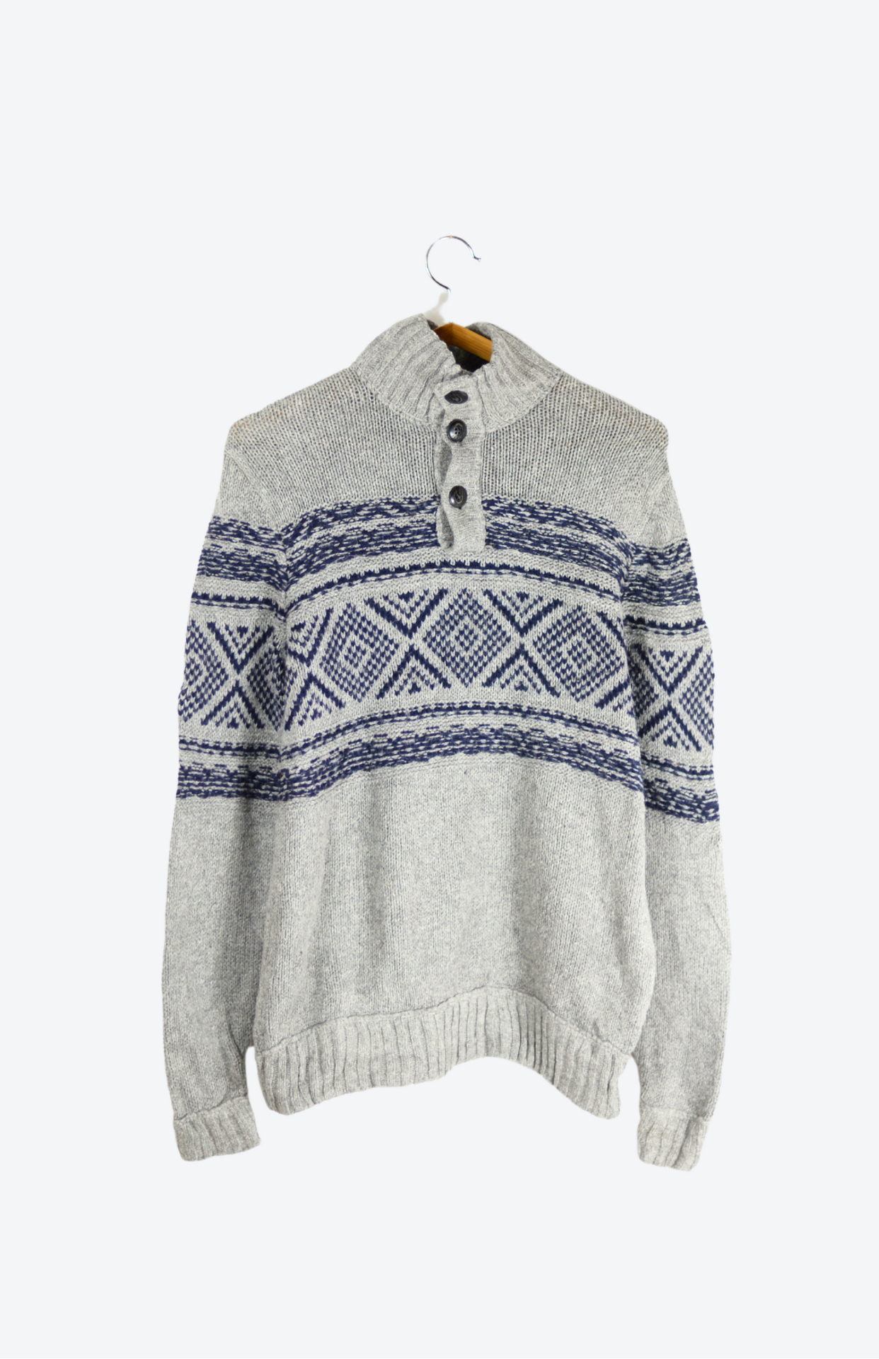 Vintage šedý rolák s modrým vzorem. Středně silný úplet a rovný volný střih. Pánský / unisex kousek.